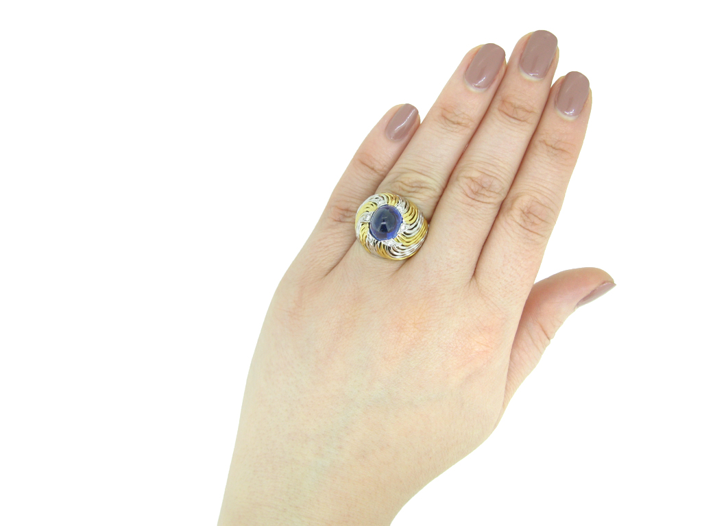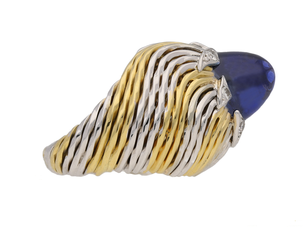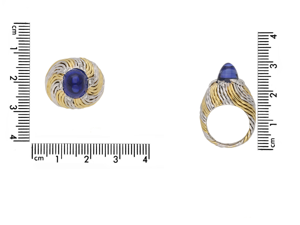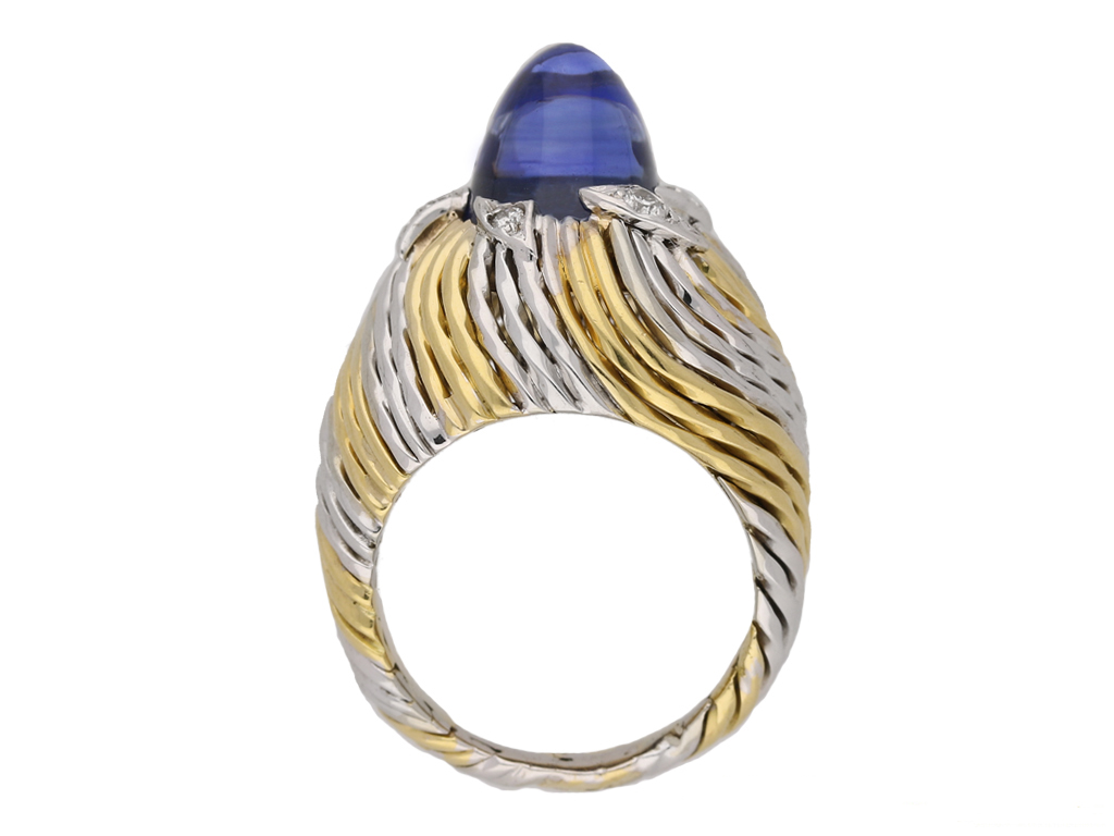 Sterle of Paris cabochon sapphire and diamond ring. Set to centre with an oval cabochon natural unenhanced Ceylon sapphire in an open back rubover setting with an approximate weight of 9.00 carats, encircled by six round brilliant cut diamonds in open back grain settings with an approximate combined weight of 0.18 carats, to a heavy elegant bombé cluster form with intricate swirling twisted openwork rows, alternating in threes from white to yellow gold, gently curving down the heavy tapering shoulders with open backholing to a smooth conforming solid D-shape shank. Marked 18 carat white and yellow gold, signed 'STERLE - PARIS', numbered '5744', French, circa 1950, accompanied by Gem & Pearl Laboratory report #07624.