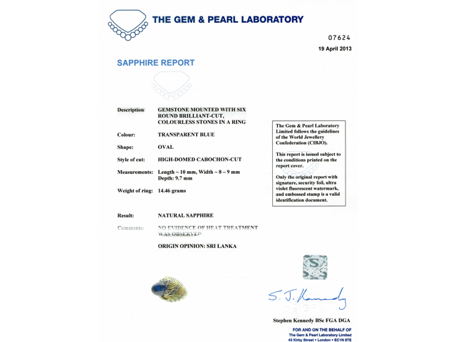 Gemstone Ceylon Unheated Sapphire, Cabochon, approximately 9ct 6 x Diamonds, Brilliant Cut, approximately 0.18ct total