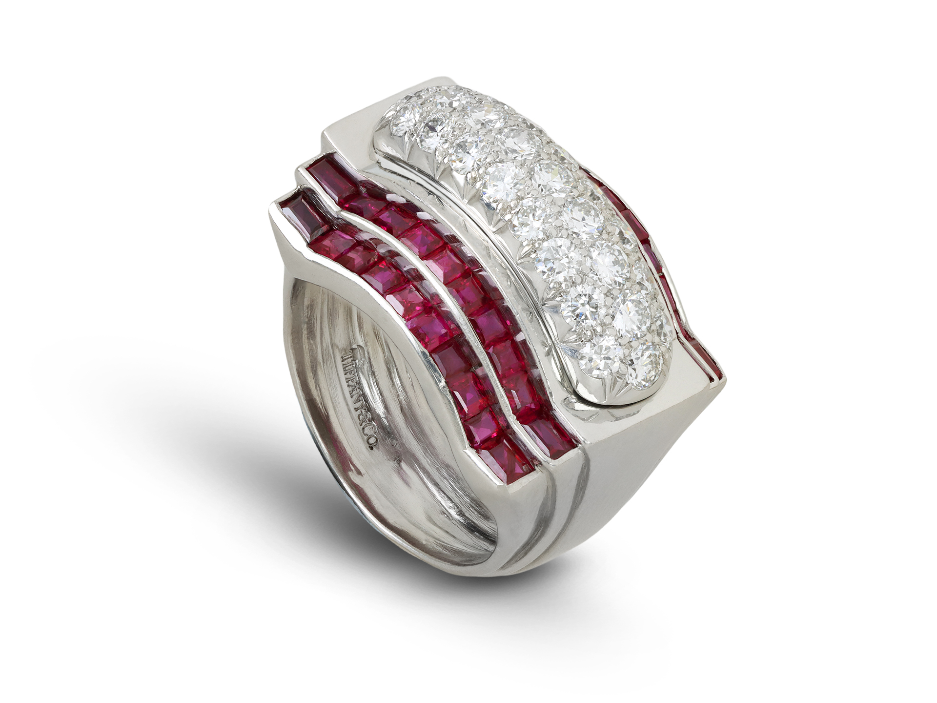 Tiffany & Co. ruby and diamond dress ring. Horizontally set with twenty-five round old cut diamonds in open back grain and claw settings with a combined approximate weight of 1.25 carats, framed by forty rectangular baguette cut natural no heat rubies in open back channel settings with a combined approximate weight of 4.00 carats, to an impressive stepped design featuring polished edges, a smooth gallery and geometric open backholing, flanked by broad ridged shoulders which smoothly curve to a solid stepped shank. Tested platinum, marked 'TIFFANY & CO.', circa 1935.