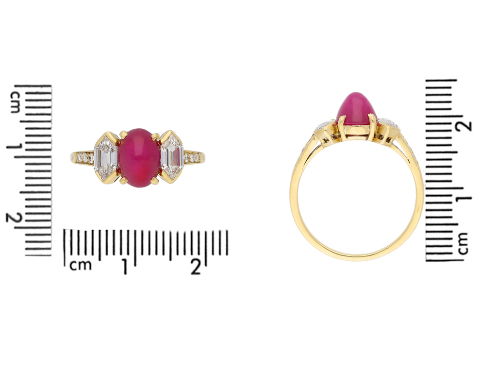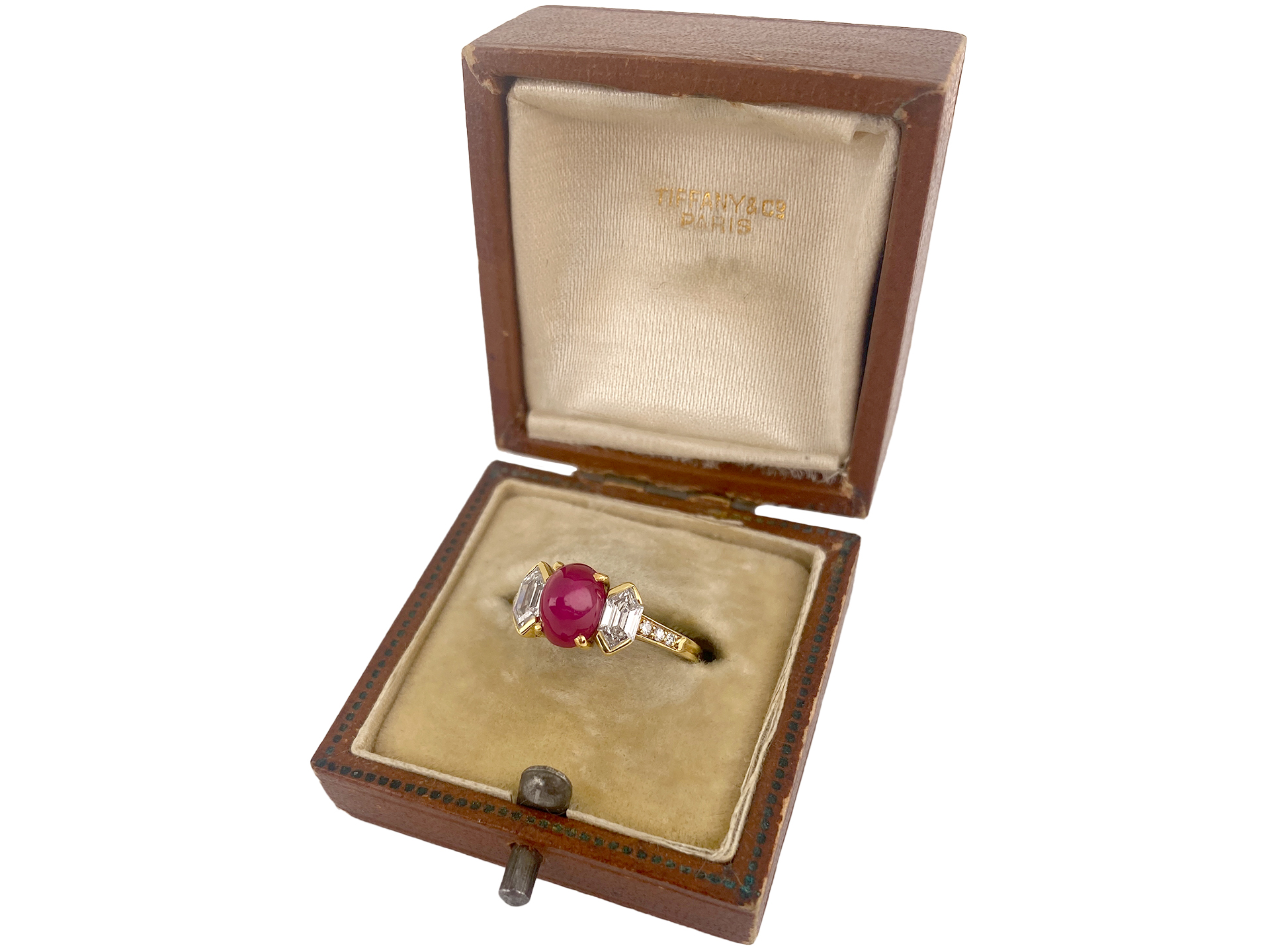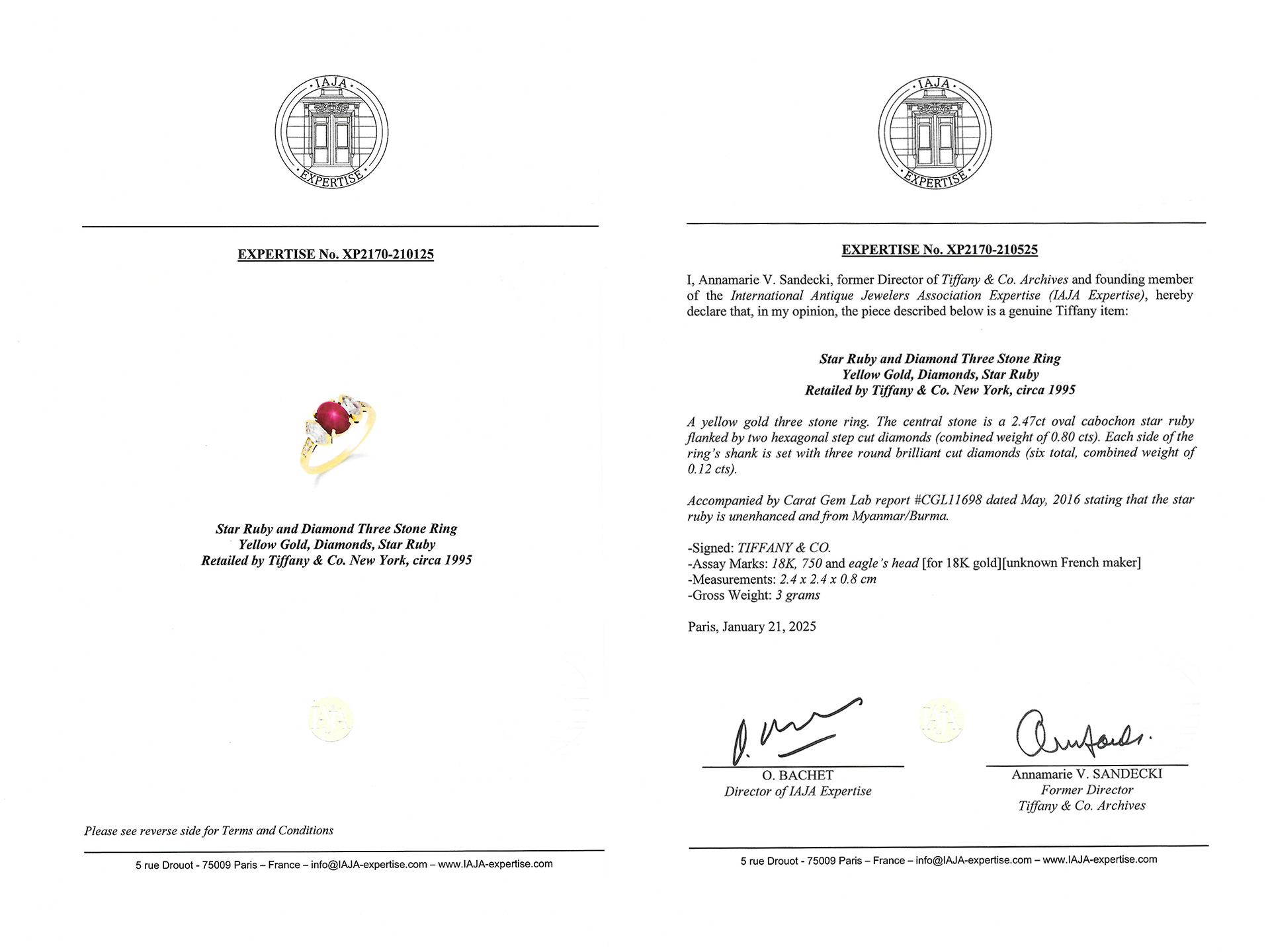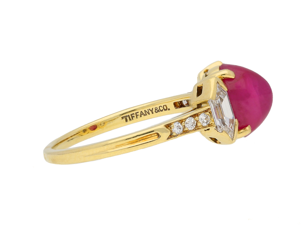Tiffany & Co. star ruby and diamond three stone ring. Set centrally with an oval cabochon natural no heat Burmese star ruby in an open back claw setting with a weight of 2.47 carats, further set with two hexagonal step cut diamonds in open back rubover settings with a combined weight of 0.80 carats, further enhanced by six round brilliant cut diamonds in open back grain settings with a combined weight of 0.12 carats. The total approximate diamond weight is 0.92 carats, to a fancy three stone design feauturing curving claws, a finely pierced gallery and geometric open backholing, flanked by trumpeting split shoulders flowing through to a ridged tapering D-shape shank. Marked 18 carat gold, signed 'TIFFANY & CO.', French, retailed in Tiffany New York, circa 1995, accompanied by Carat Gem Lab report #CGL11698, box and IAJA Expertise report #XP2170-210125.