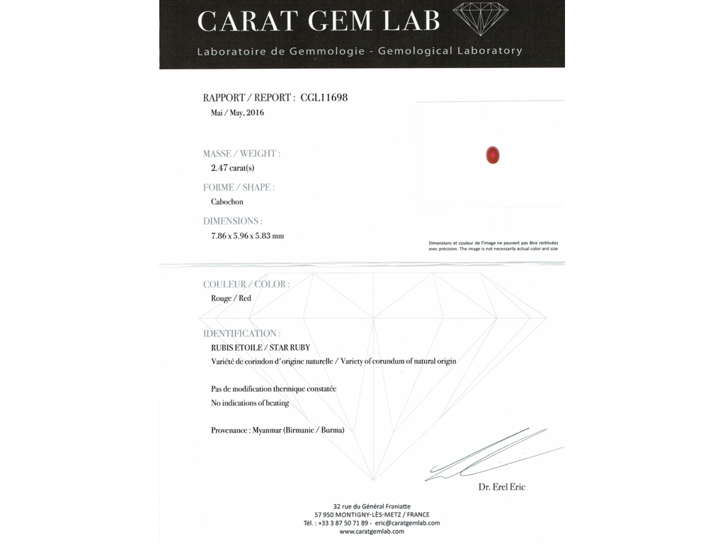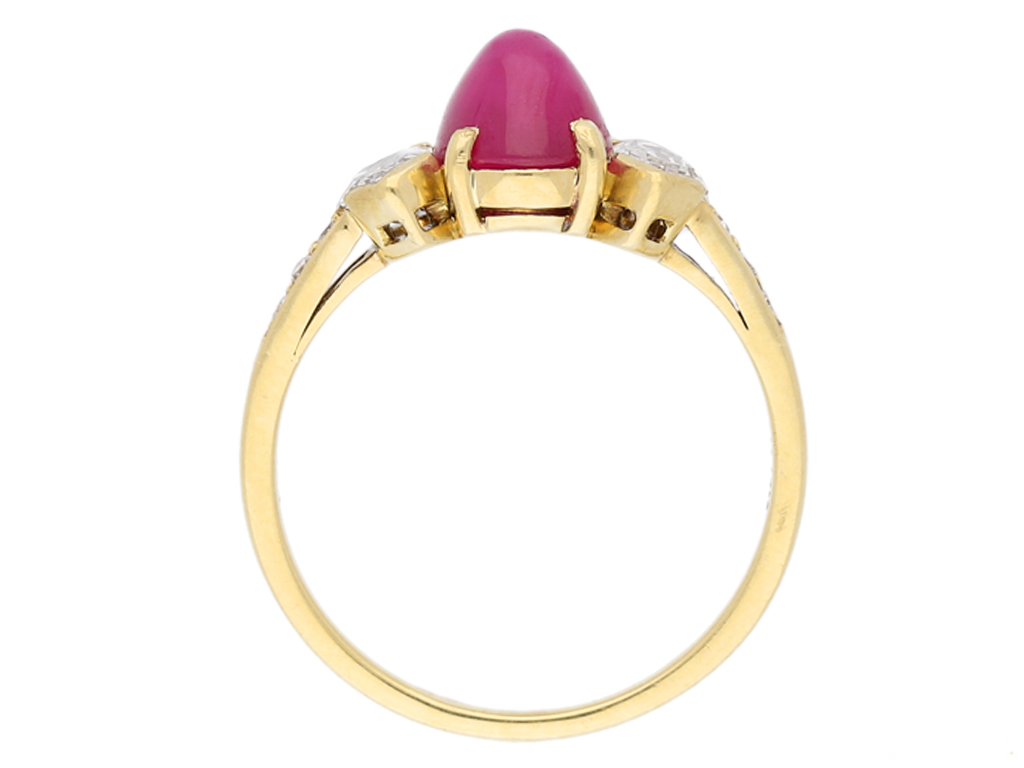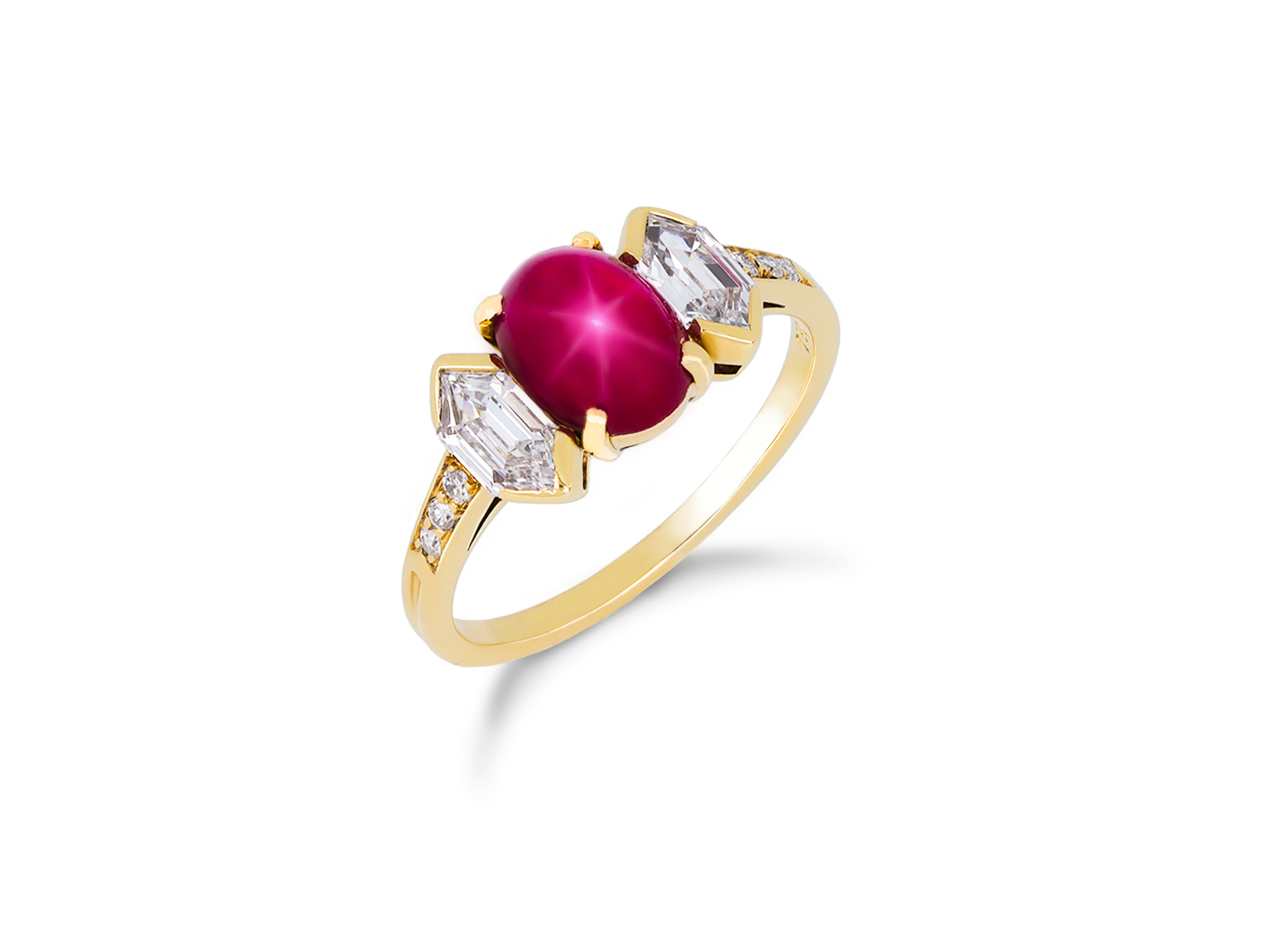 Gemstone Burmese Unheated Star Ruby, Cabochon, 2.47ct 2 x Diamonds, Step Cut, approximately 0.8ct total 6 x Diamonds, Brilliant Cut, approximately 0.12ct total