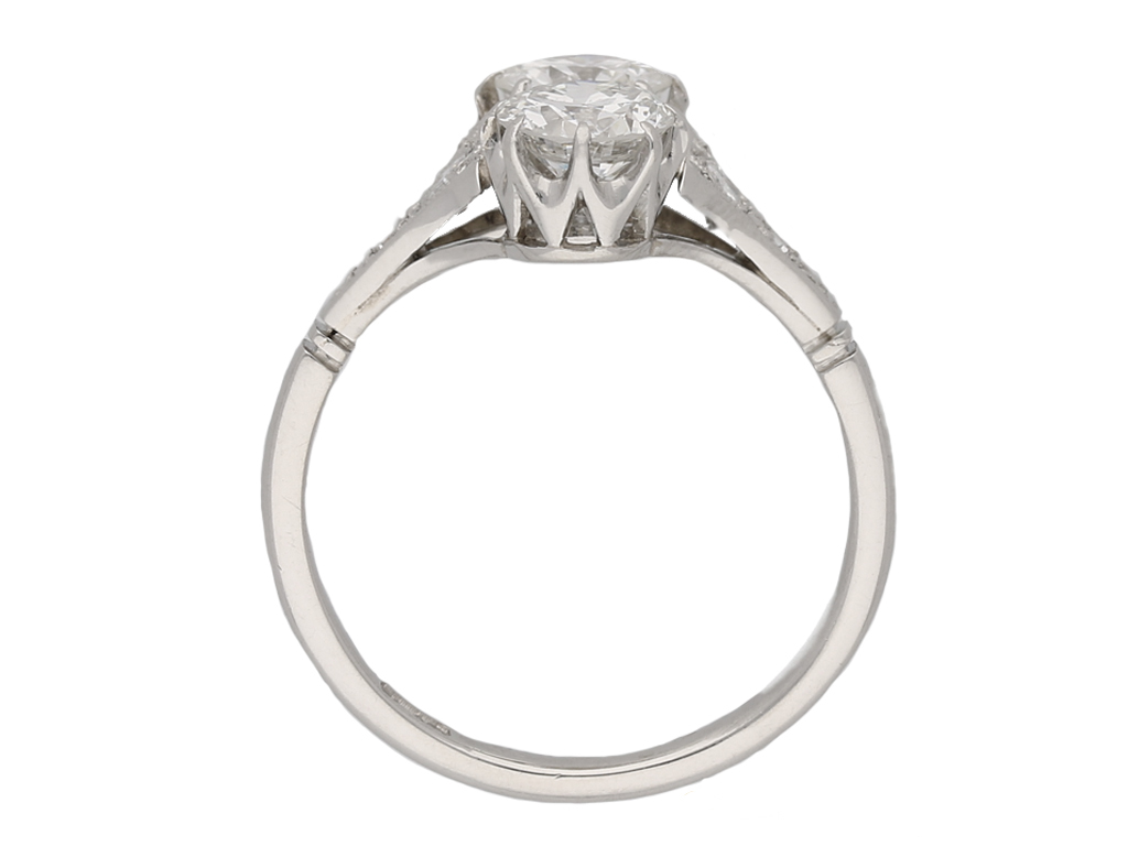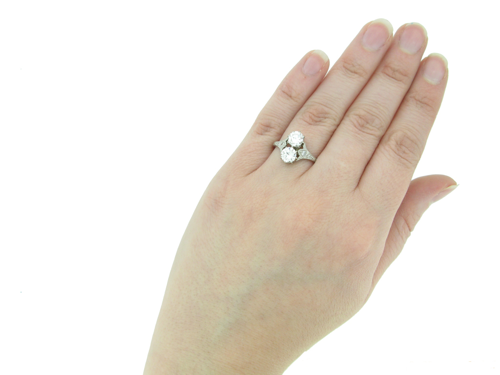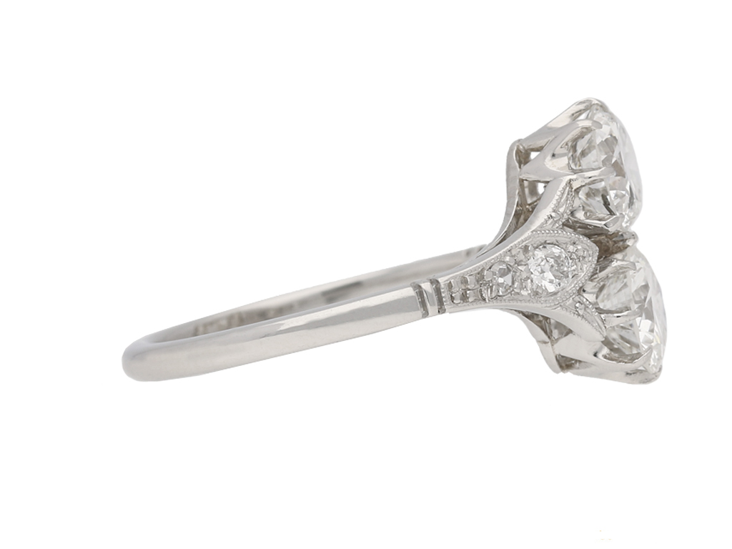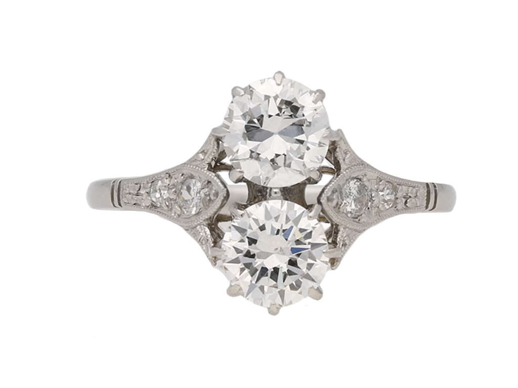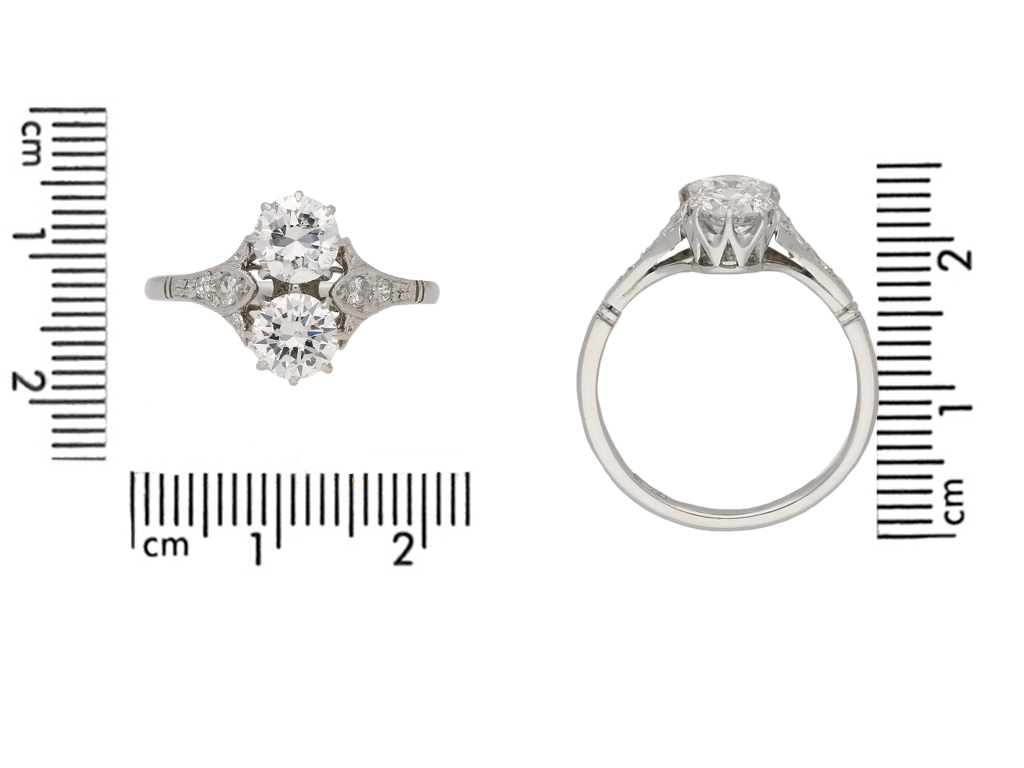Two stone diamond ring. Set with two round old cut diamonds in open back claw settings with a combined weight of 1.40 carats, further set with two round old cut diamonds in open back grain settings with a combined weight of 0.14 carats, additionally set with two round eight cut diamonds in open back grain settings with a combined weight of 0.04 carats. The total approximate diamond weight is 1.58 carats, to a vertical cluster design, enhanced throughout with millegrain decoration featuring finely pierced openwork gallery and fancy backholing, the openwork fleur-de-lis shoulders flow smoothly to a slim D-shape shank. Marked platinum, circa 1935.