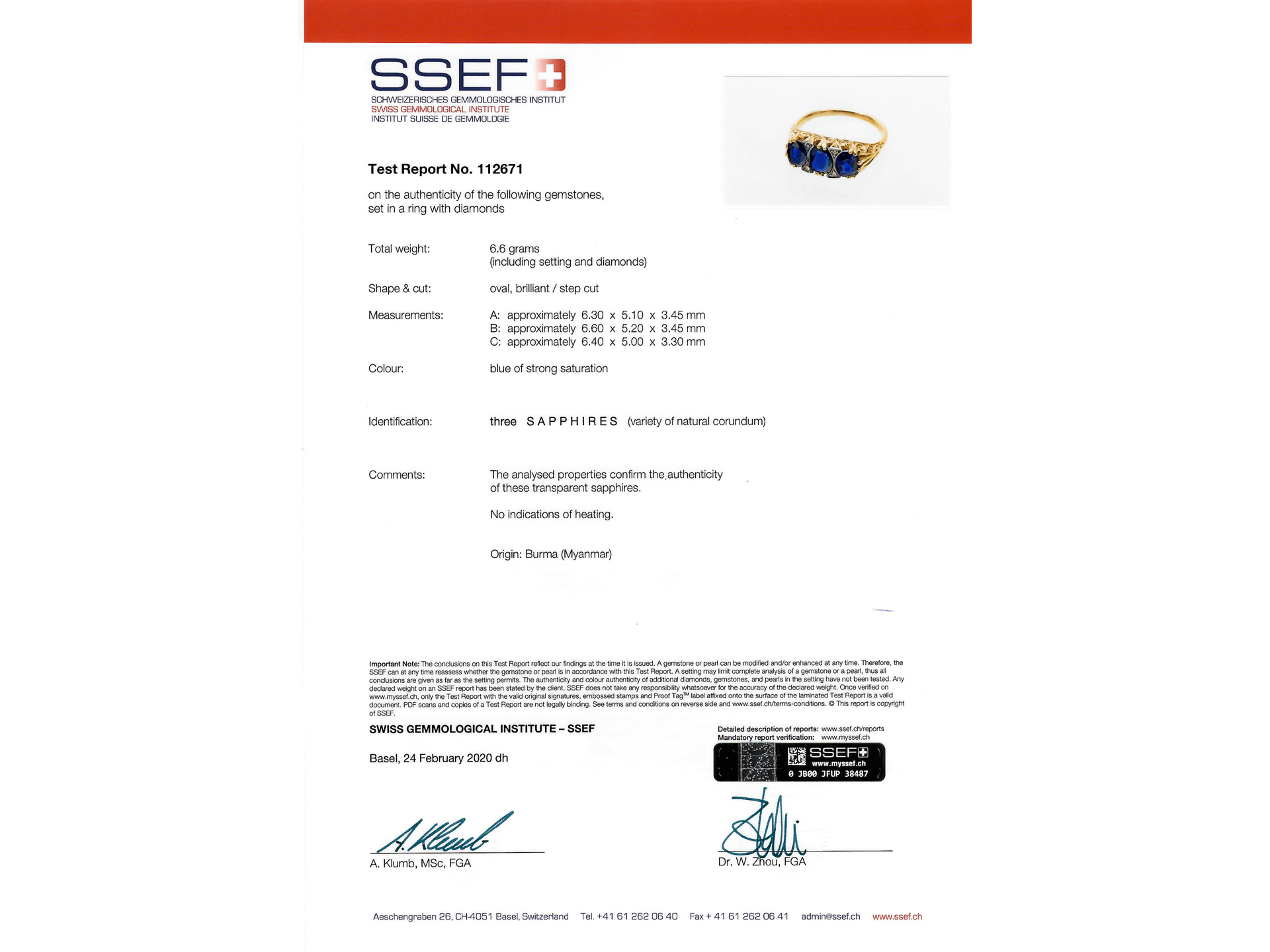Victorian Burmese sapphire three stone ring. Set horizontally to centre with three oval old cut natural no heat Burmese sapphires in open back claw and rubover settings with an approximate combined weight of 2.68 carats, further adorned with four round rose cut diamonds in closed back grain settings with an approximate combined weight of 0.04 carat, all to an elegant carved three stone design featuring split curving claws, an ornately carved scrolling gallery and open and closed backholing, leading to carved shoulders and flowing through to a solid D-shape shank. Tested yellow gold and silver, circa 1880, accompanied by Swiss Gemological Institute (SSEF) report #112671.