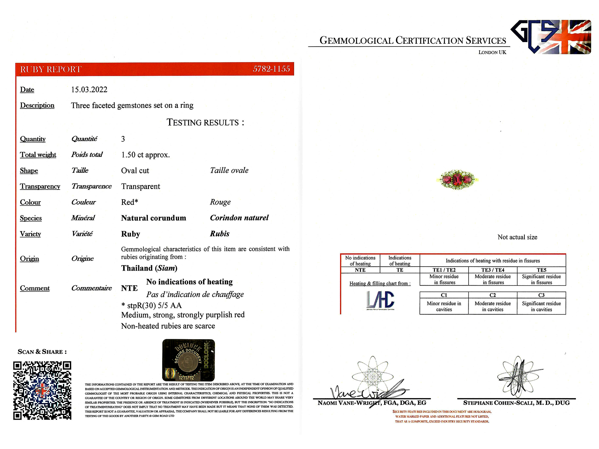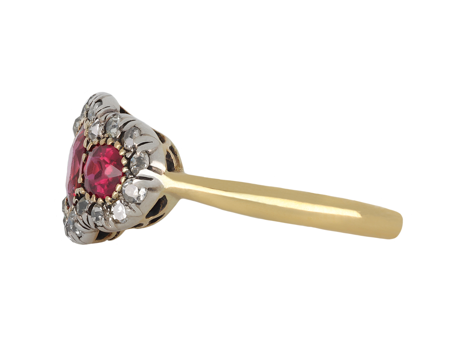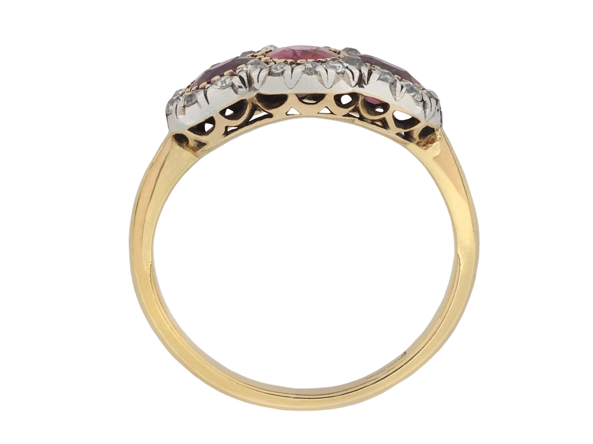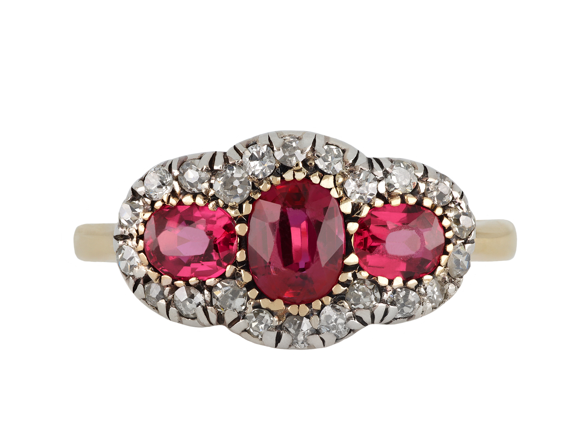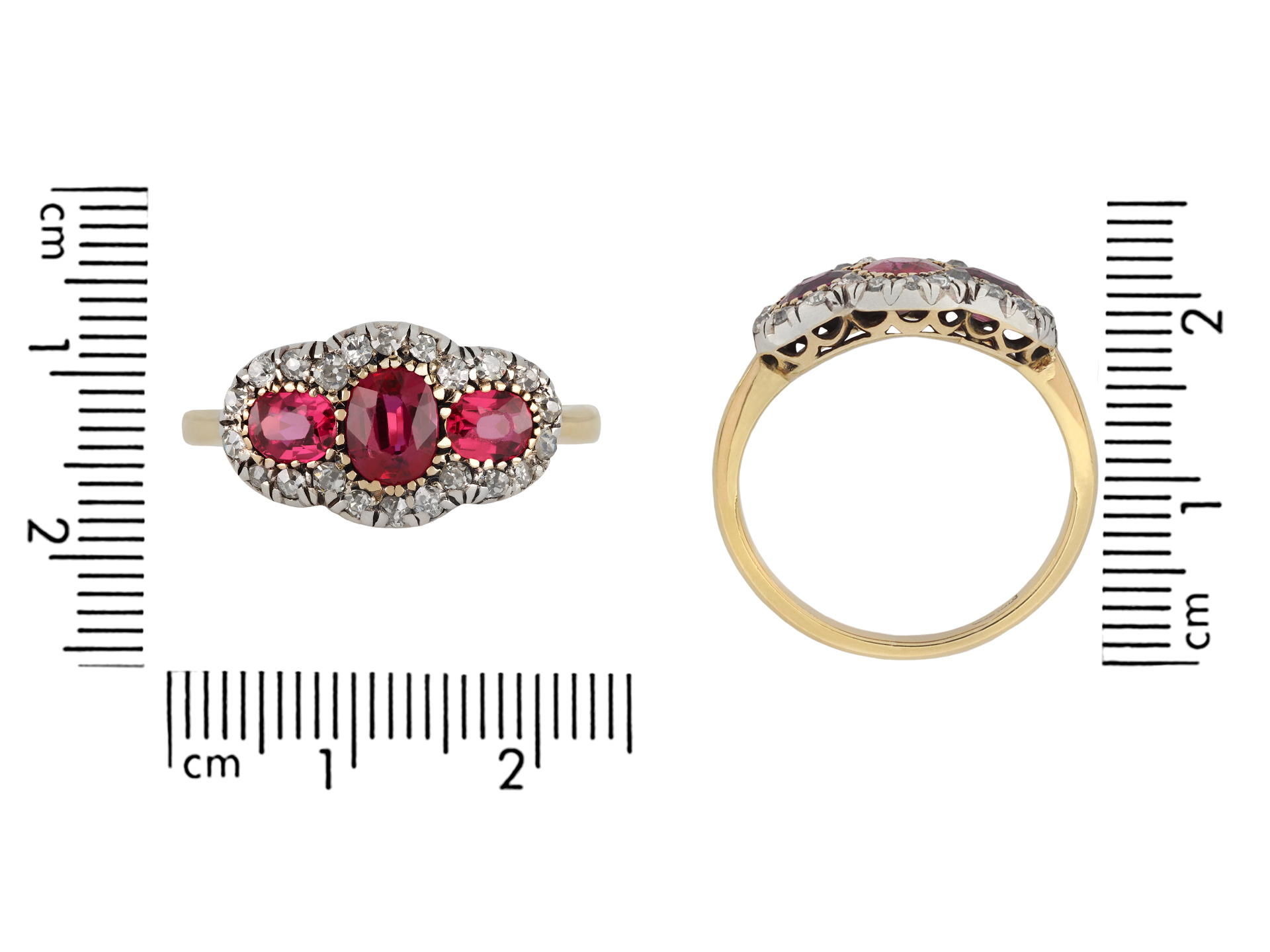 Victorian ruby and diamond cluster ring. Horizontally set with three oval old cut natural unenhanced Siam rubies in open back grain settings with a combined approximate weight of 1.50 carats, encircled by twenty two round mixed old cut diamonds in open back grain and cut-down settings with a combined approximate weight of 0.45 carats, to an elegant triple cluster design featuring polished edges, an intricately pierced scalloped gallery and fancy open backholing, leading to inwardly tapering shoulders which taper through to a solid D-shape shank. Marked 18 carat yellow gold, tested silver settings, circa 1880, accompanied by Gemmological Certification Services report #5782-1155.