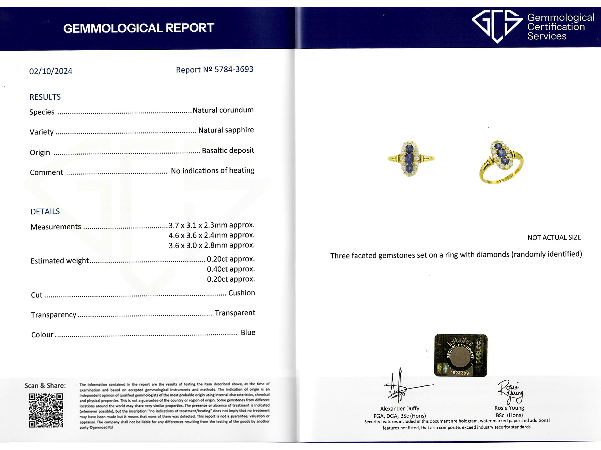 Victorian sapphire and diamond triple cluster ring. Set to centre with three cushion shape old cut natural no heat sapphires in open back grain settings with an approximate combined weight of 0.80 carats, encircled by sixteen round mixed old cut diamonds in open back claw and grain settings with an approximate combined weight of 0.65 carats, to an elegant triple cluster design featuring curving claws, an intricately pierced gallery and fancy open backholing, leading to decoratively carved shoulders and flowing through to a solid D-shape shank. Marked 18 carat yellow gold, maker's mark 'L&L' for Laurie & Lazarus, full hallmarks for Birmingham, English, 1892, engraved 'J.O. to A.W.H', accompanied by a Gemmological Certification Services (GCS) report #5784-3693.