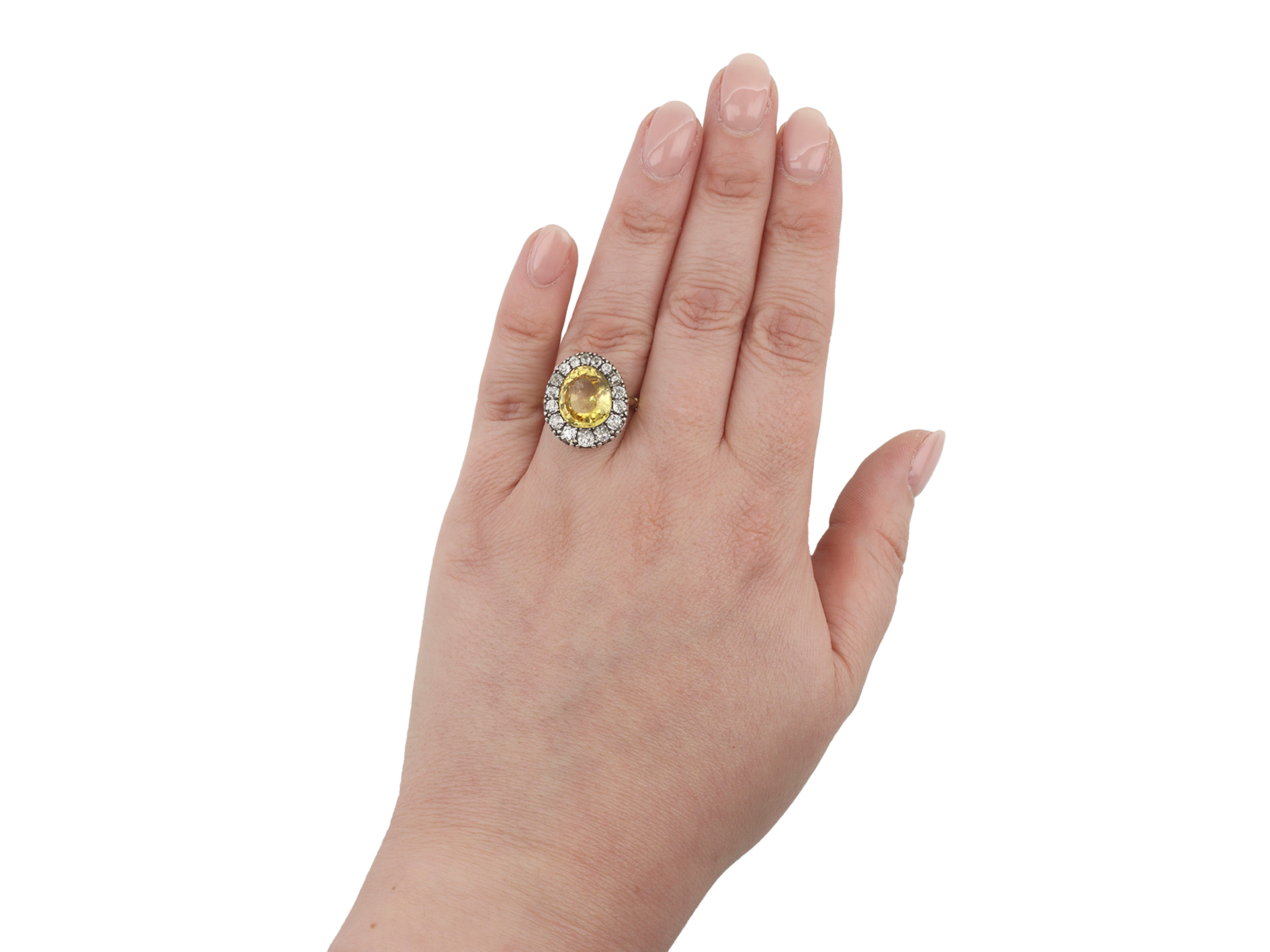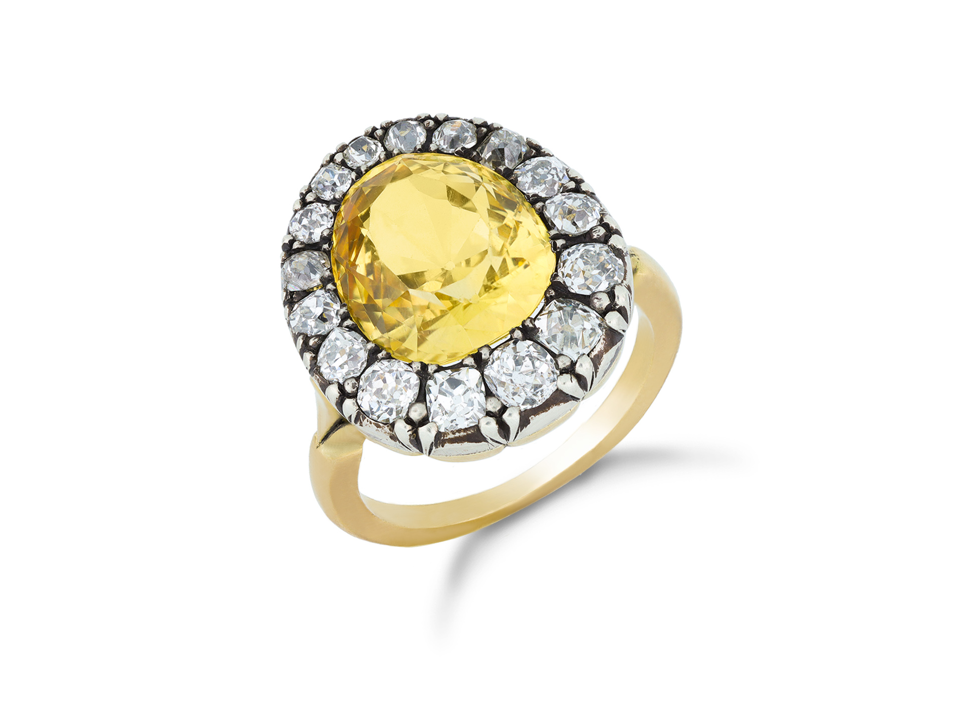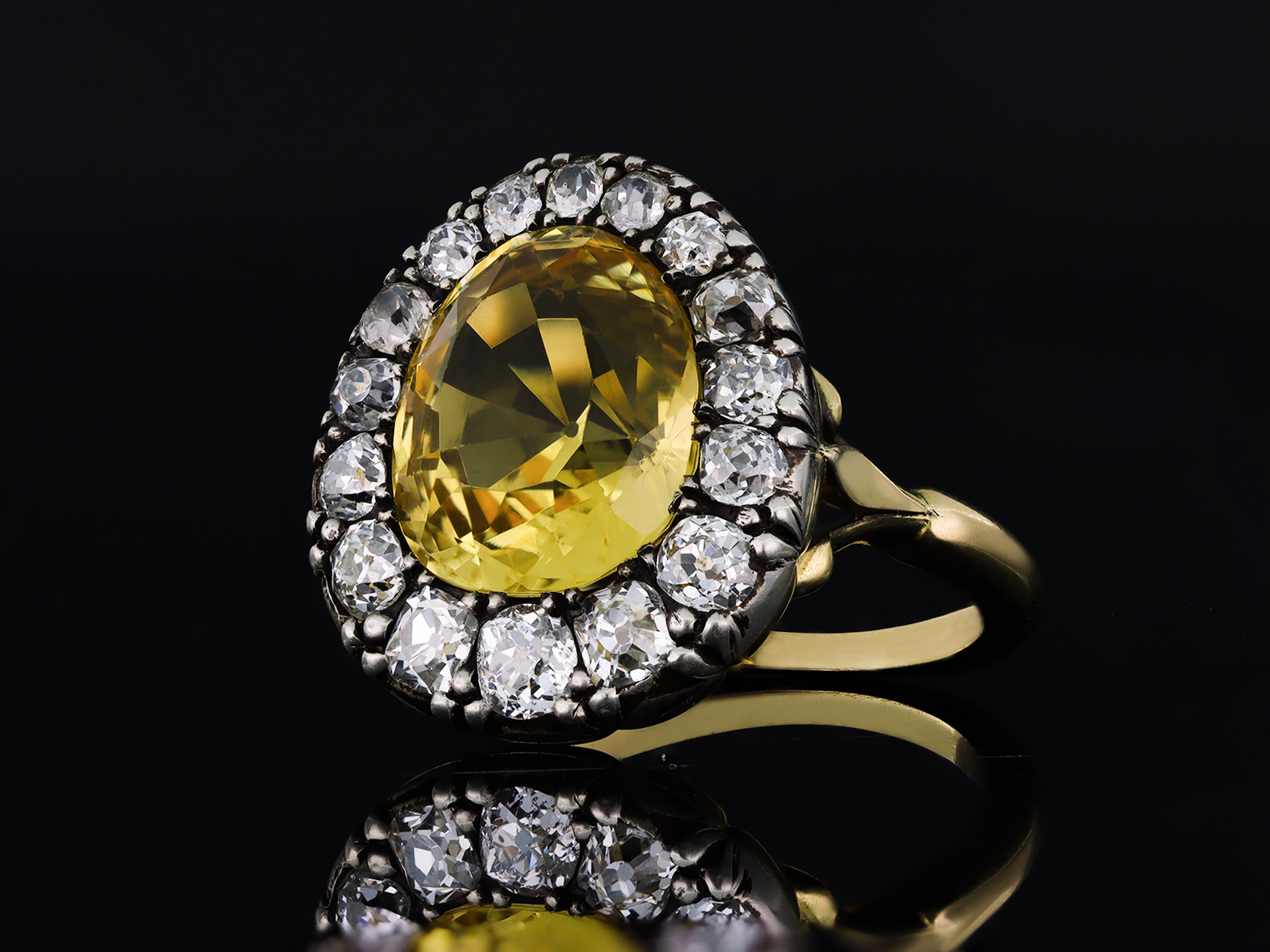 Yellow Ceylon sapphire and diamond cluster ring, circa 1890.