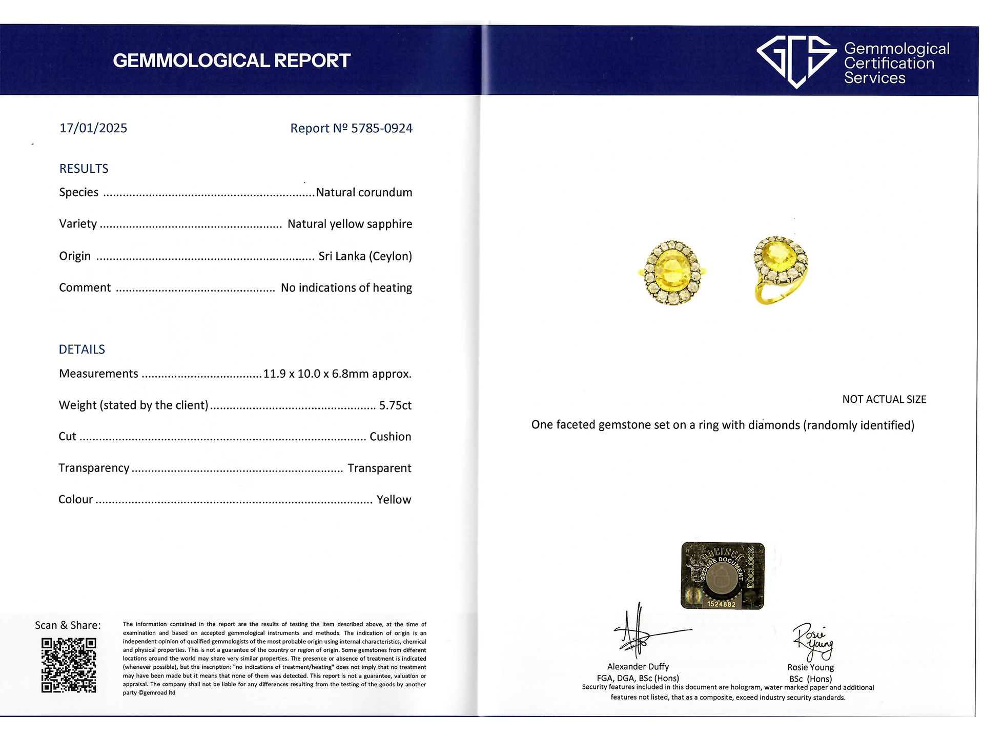 Yellow Ceylon sapphire cluster ring. Centrally set with a drop shape old cut natural unenhanced yellow Ceylon sapphire in an open back grain setting with an approximate weight of 5.75 carats, surrounded by a single row of sixteen cushion shape old mine diamonds with a combined approximate weight 1.70 carats, to an elegant cluster design featuring polished edges, a solid scalloped gallery and open backholing, leading to tri-split shoulders with fleur de lis detailing and flowing through to a solid D-shape shank. Tested yellow gold and silver, circa 1890, accompanied by Gemmological Certification Services report #5785-0924.