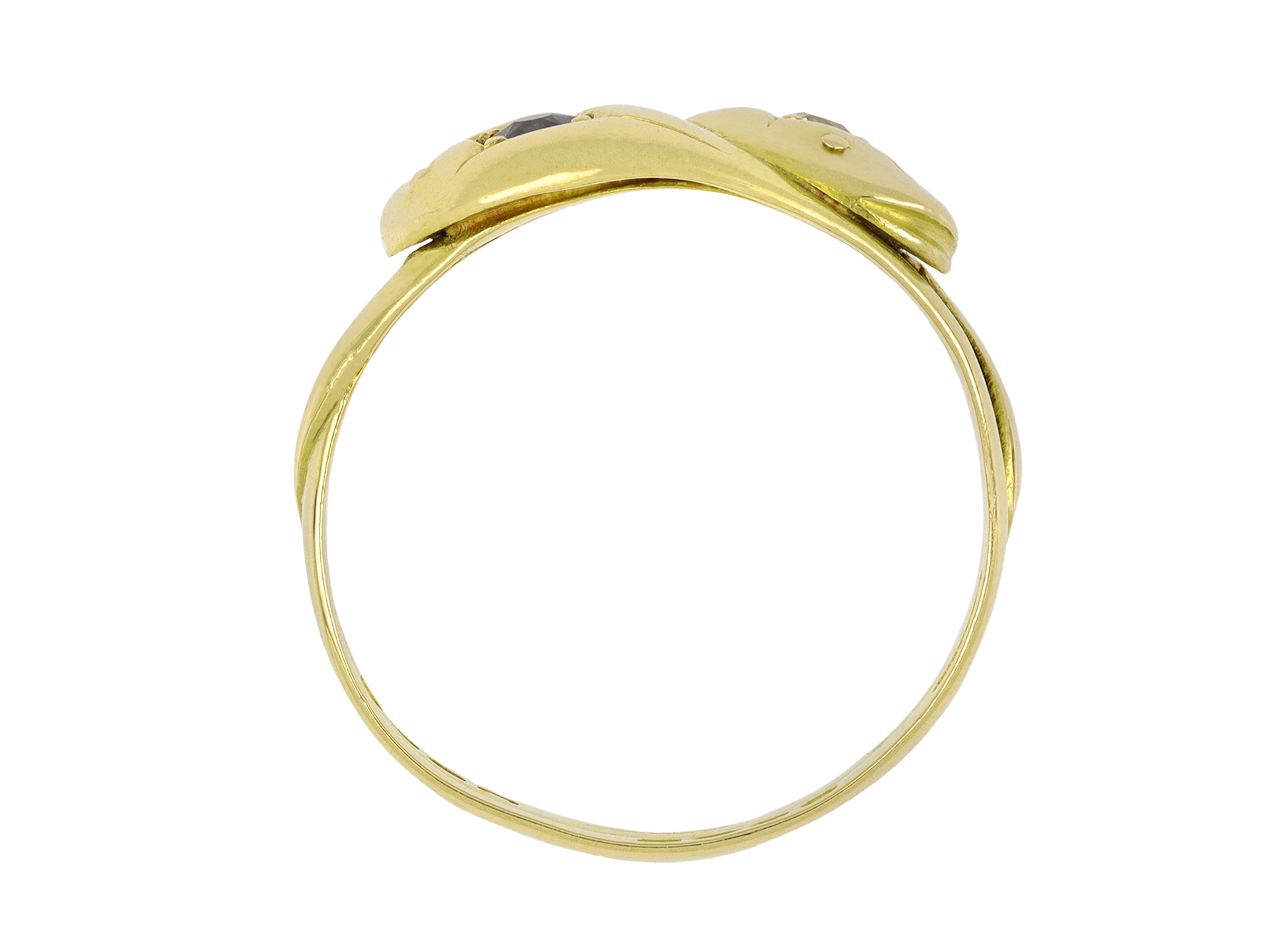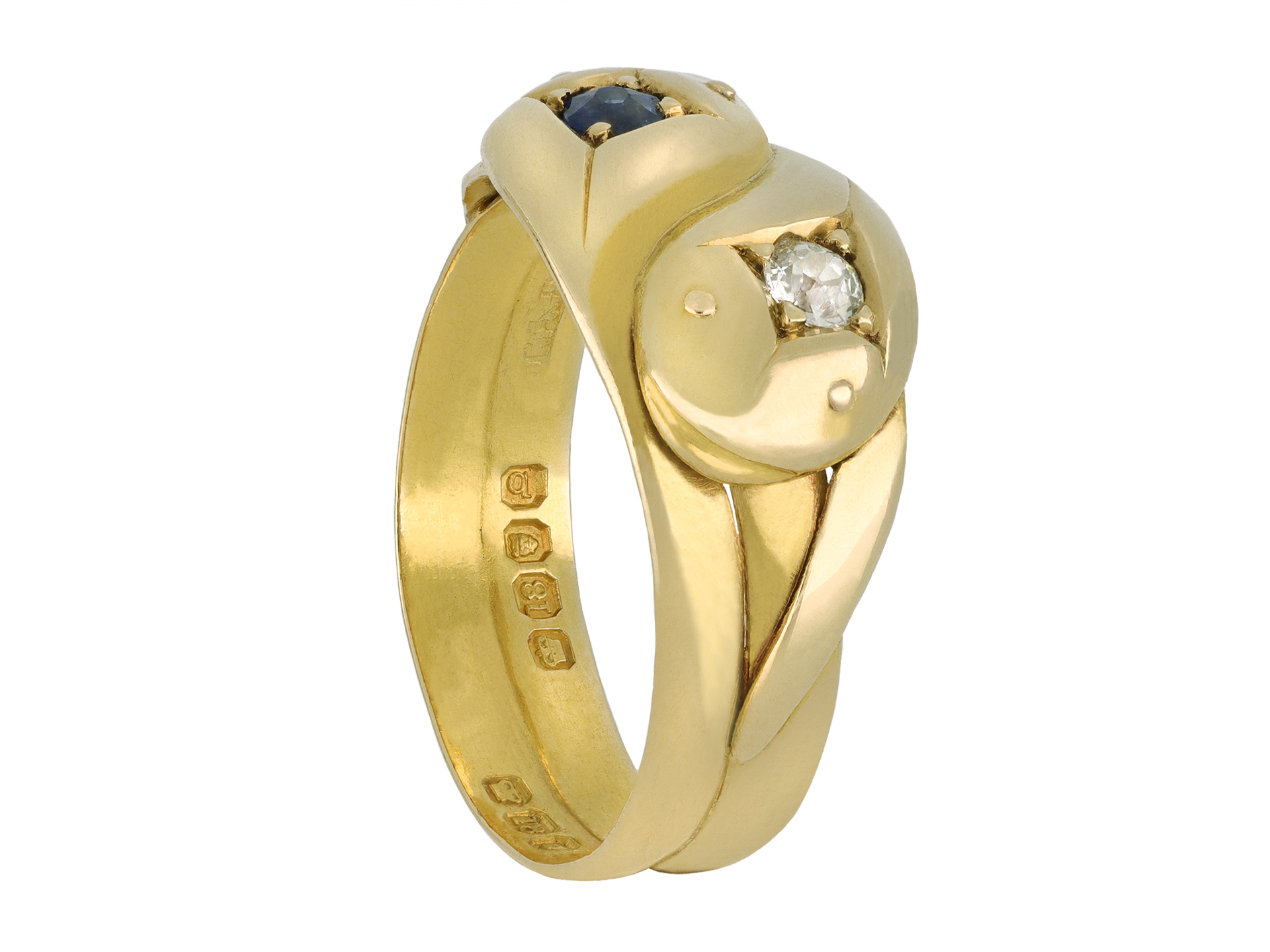 Victorian diamond and sapphire snake ring. Set with one cushion shape old mine diamond in an open back grain setting with an approximate weight of 0.12 carats, further set with a cushion shape old cut natural unenhanced sapphire in a open back grain setting with an approximate weight of 0.20 carats, to an intertwined snake design featuring engraved detail to the heads and open backholing, leading to smooth shoulders and flowing though to a double shank. Marked 18 carat gold, makers mark 'JMML' for Masters & Leete, full hallmarks for London, English, 1897.