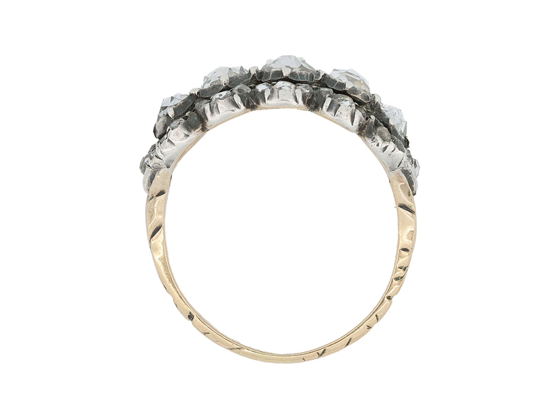 Victorian diamond five stone ring. Horizontally set with five cushion shape old mine diamonds in open back silver cut down settings with a combined approximate weight of 3.00 carats, to an impressive five stone design featuring curving claws, undulating ridged details to the gallery and geometric open backholing, flanked by trumpeting shoulders which taper to a solid ridged D-shape shank. Tested yellow gold and silver, English, circa 1850.