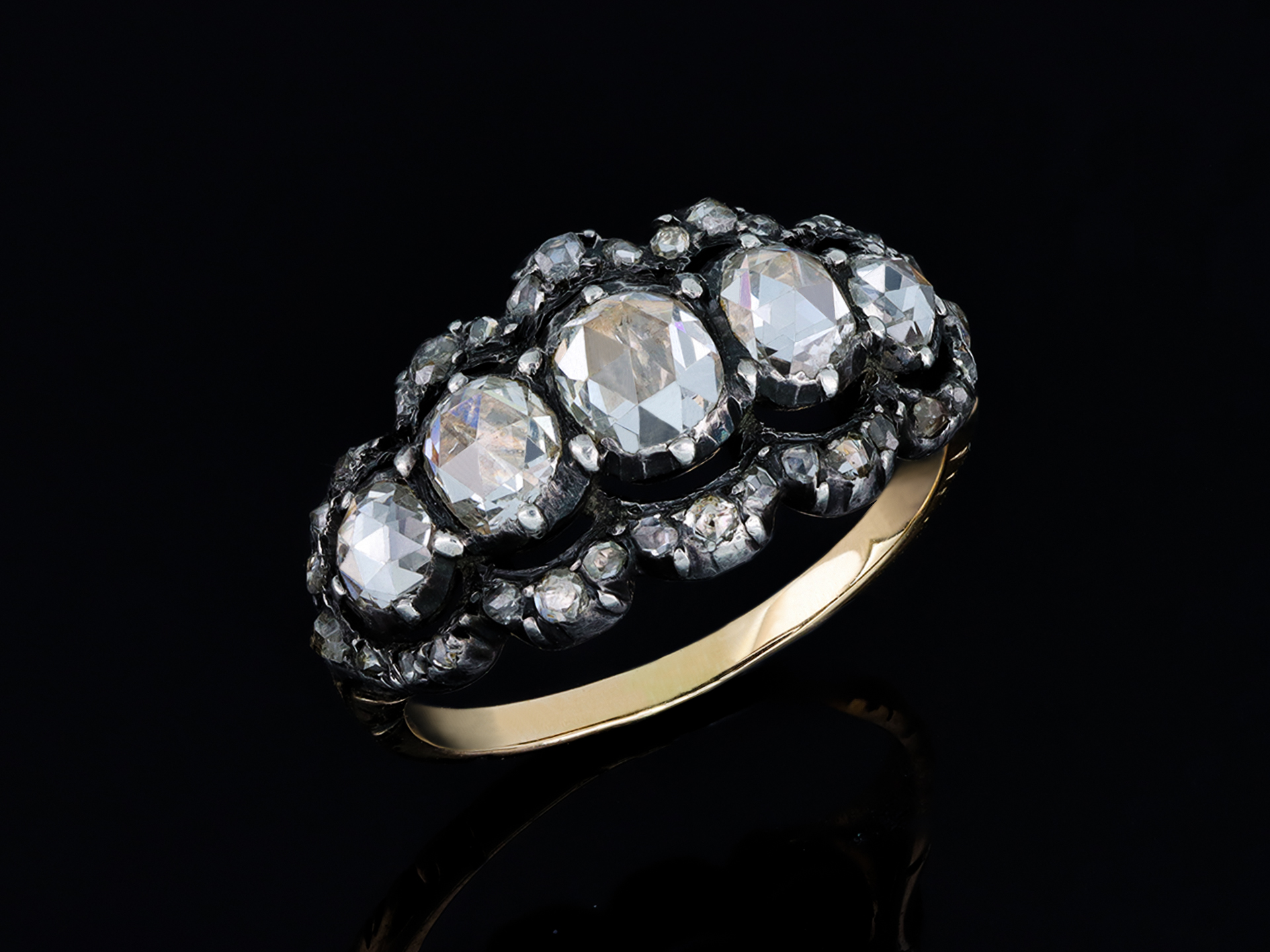 Victorian diamond five stone cluster ring. Set with five oval rose cut diamonds in closed back cut down settings with an approximate weight of 1.20 carats, surrounded by thirty two round rose cut diamonds in closed back cut down settings with a combined weight of 0.65 carats. The total approximate diamond weight is 1.85 carats, to a graduated five stone cluster design with polished edges, closed backing with radiating details and flanked by ornate scrolling openwork shoulders and tapering down to a solid D-shape shank. Tested silver and yellow gold, circa 1860.