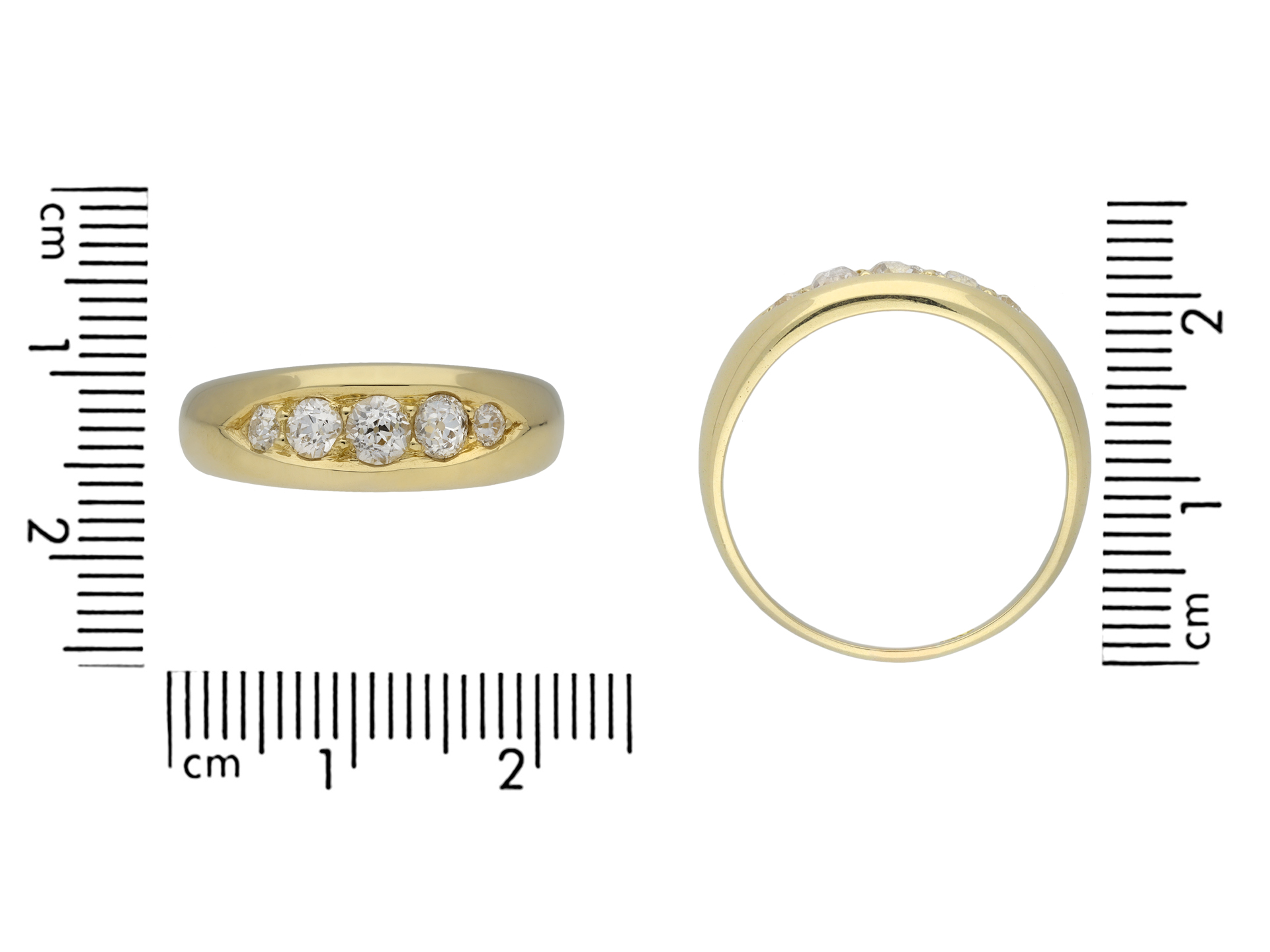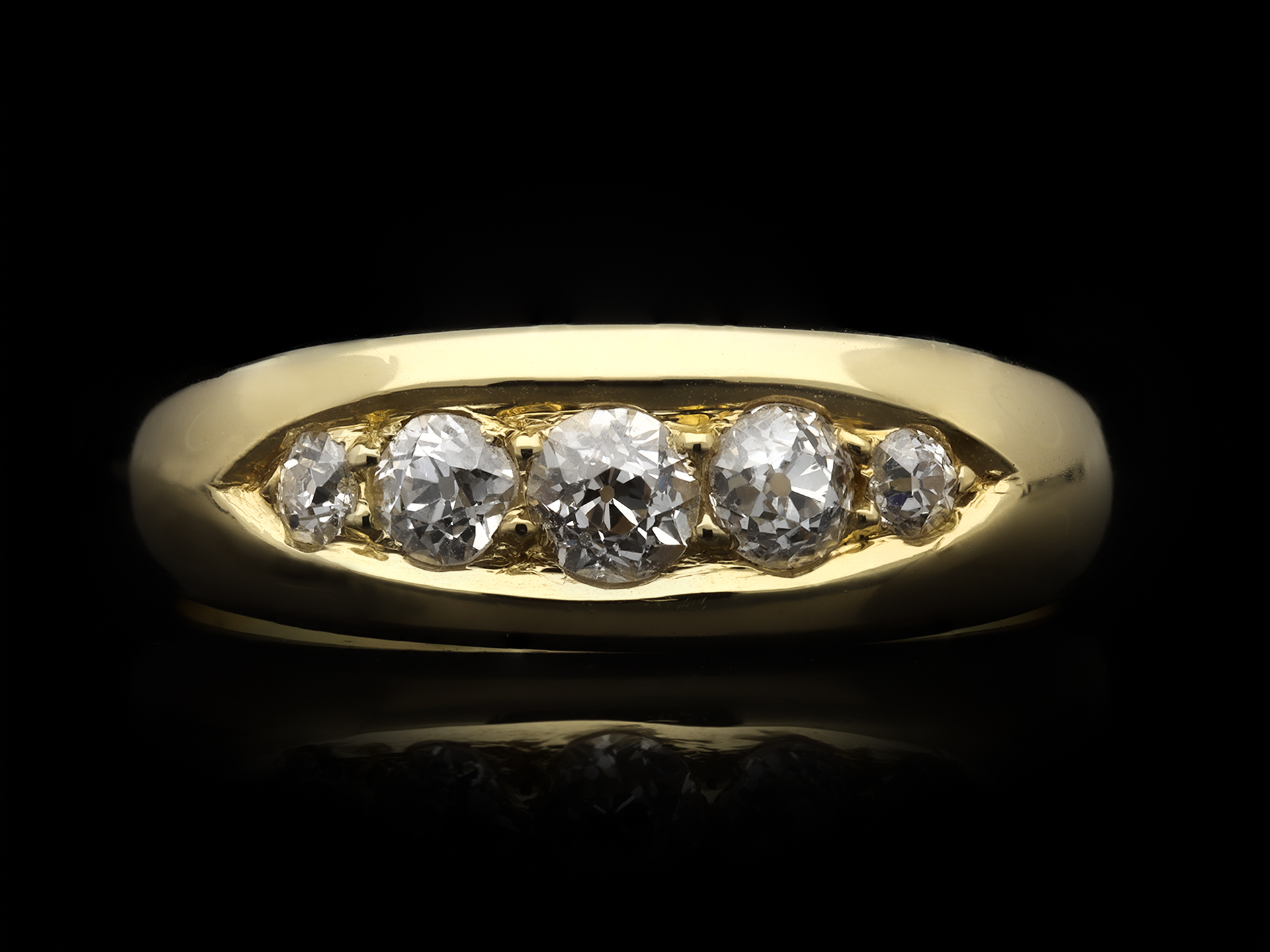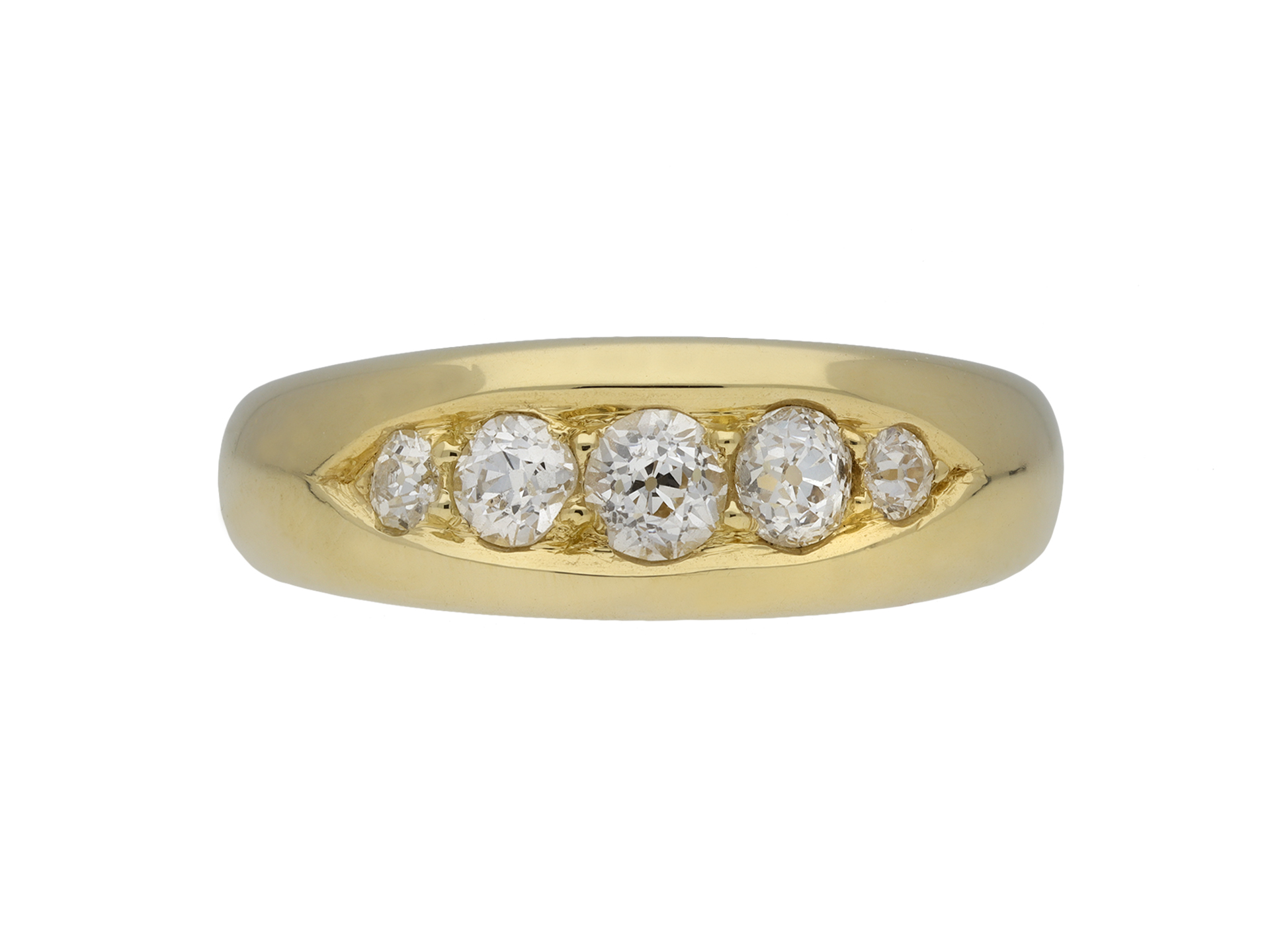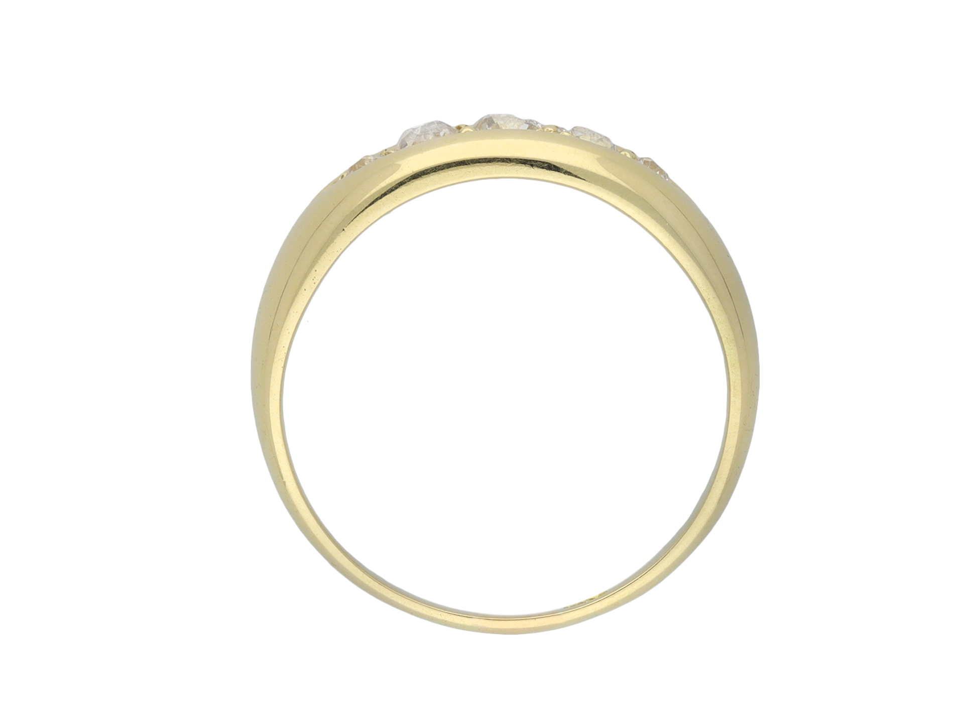 Victorian diamond five stone ring. Set horizontally to centre with five graduating round old mine cut diamonds in open back grain settings with a combined approximate weight of 0.75 carats, to a tapering five stone design featuring a central elliptical recess, a polished gallery and open circular backholing, leading to smooth shoulders and flowing through to a solid D-shape shank. Tested 18 carat yellow gold, indistinct makers mark, circa 1880.