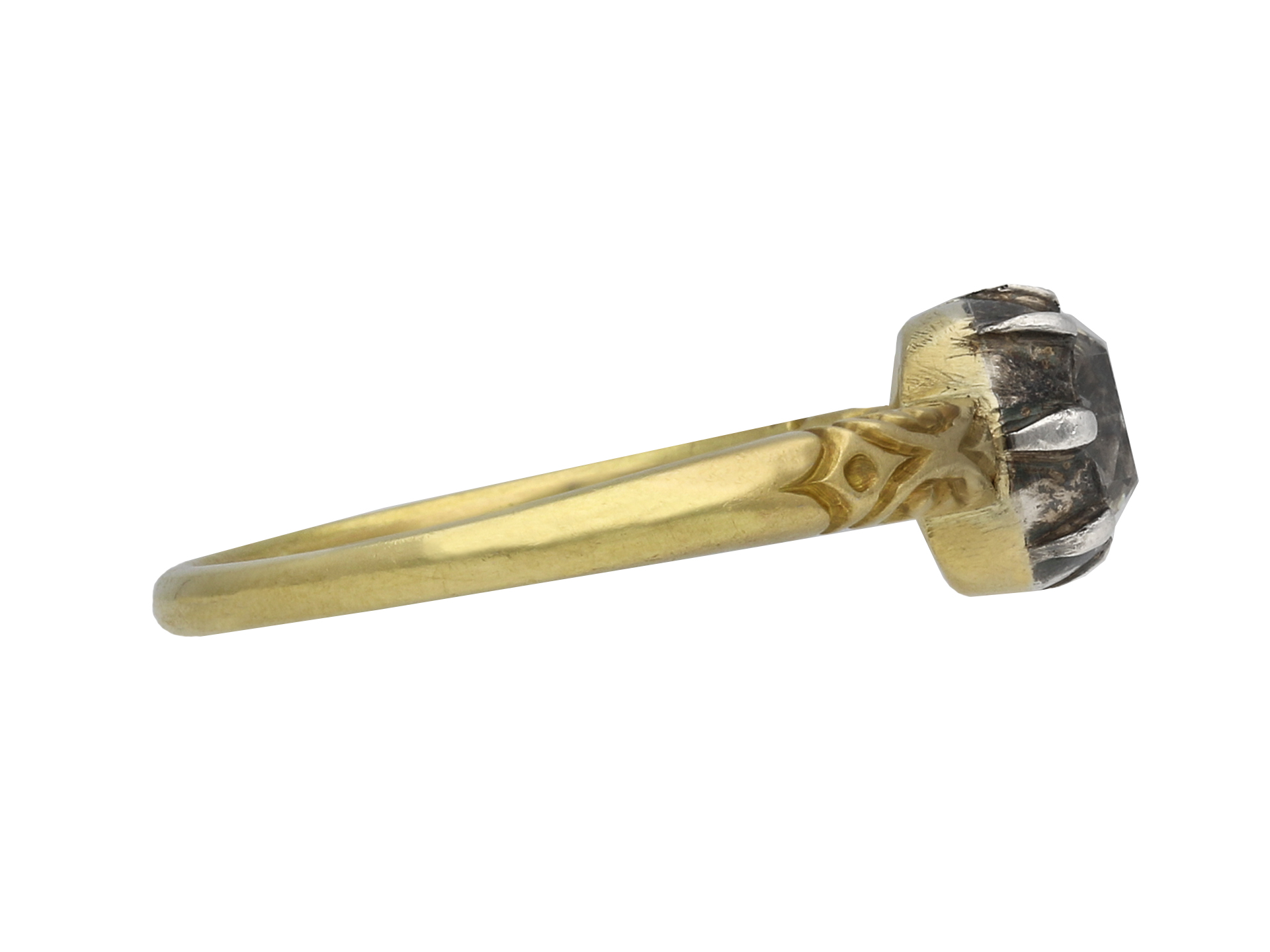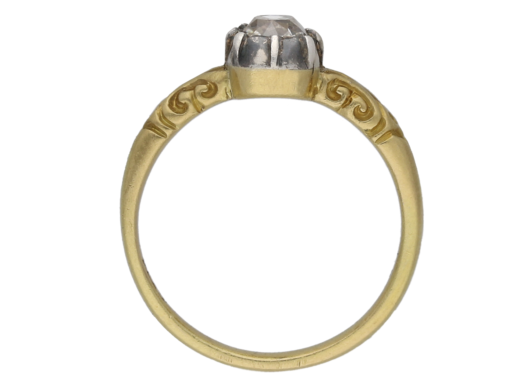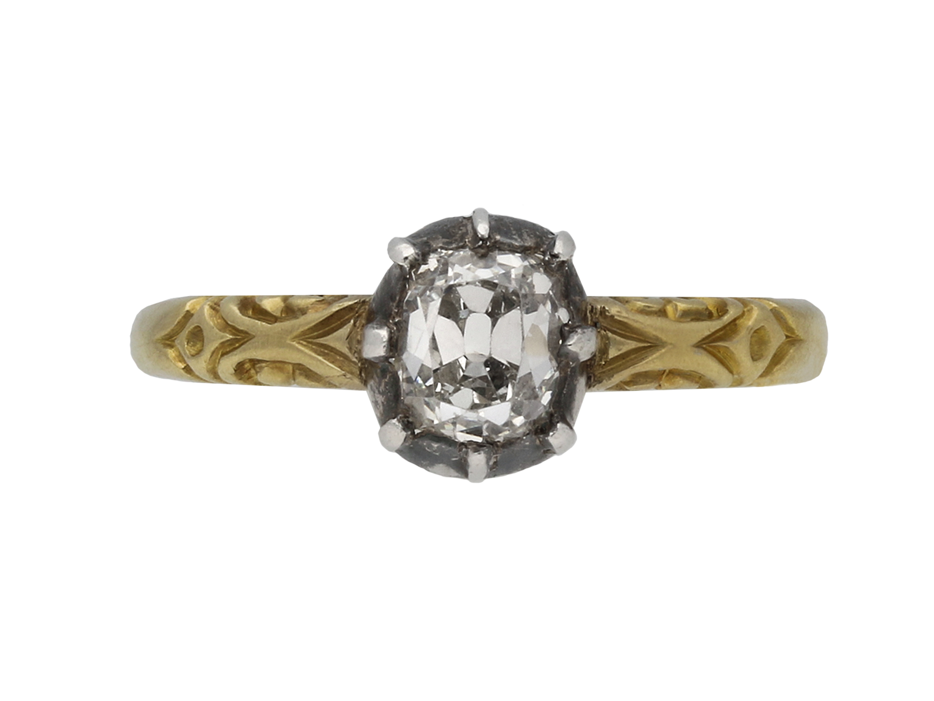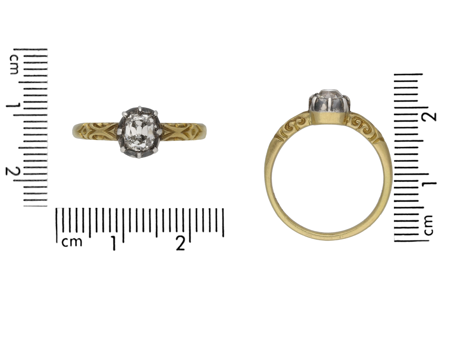 Victorian diamond solitaire ring. Set with a single cushion shape old mine cut diamond in an open back cut down claw setting with an approximate weight of 1.00 carats, to a solitaire design featuring curving claws, a polished gallery and open backholing, leading to rounded shoulders carved with a scrolling motif and flowing through to a solid smooth shank. Marked 18 carat yellow gold and tested silver, English, circa 1870.