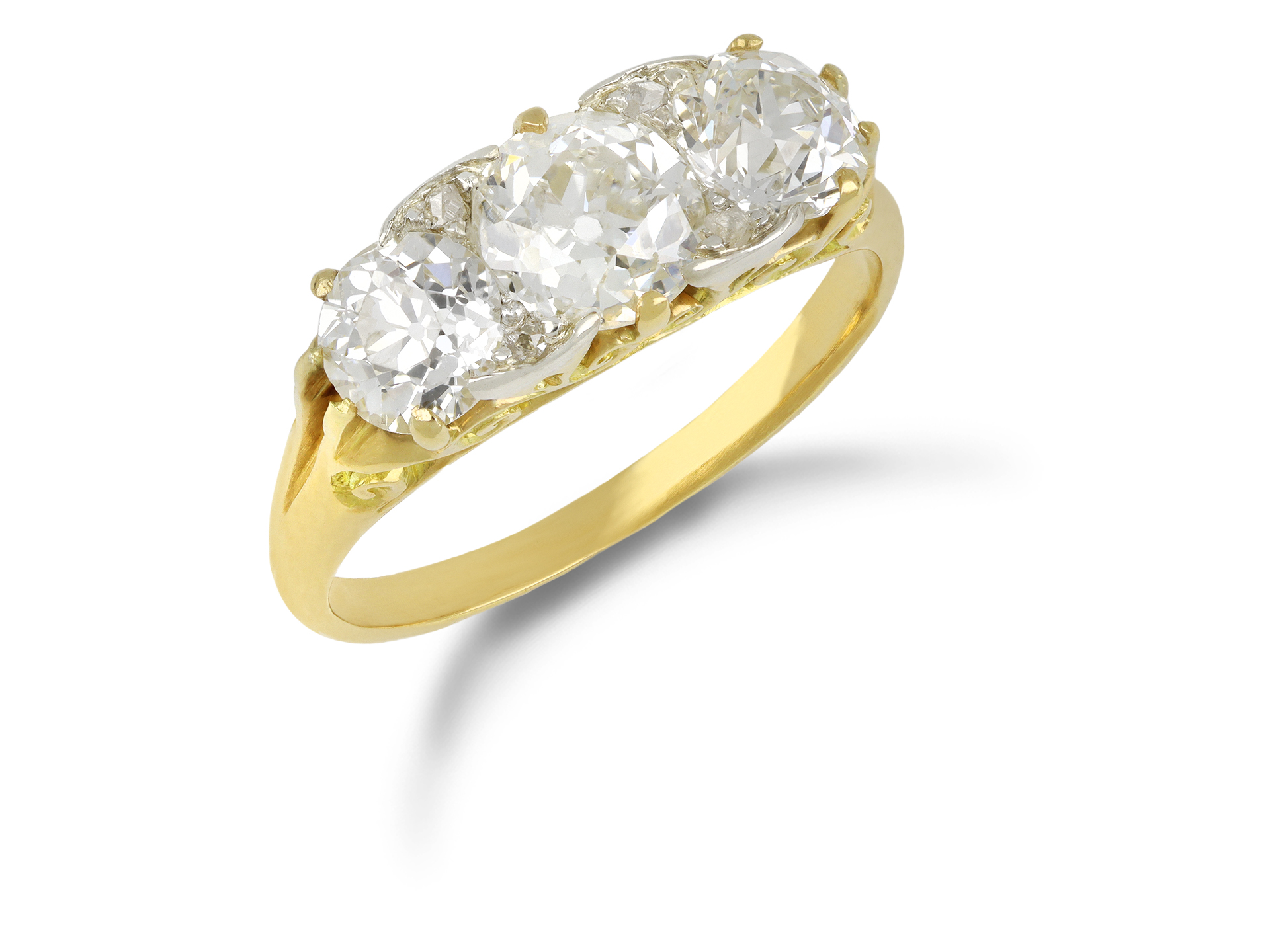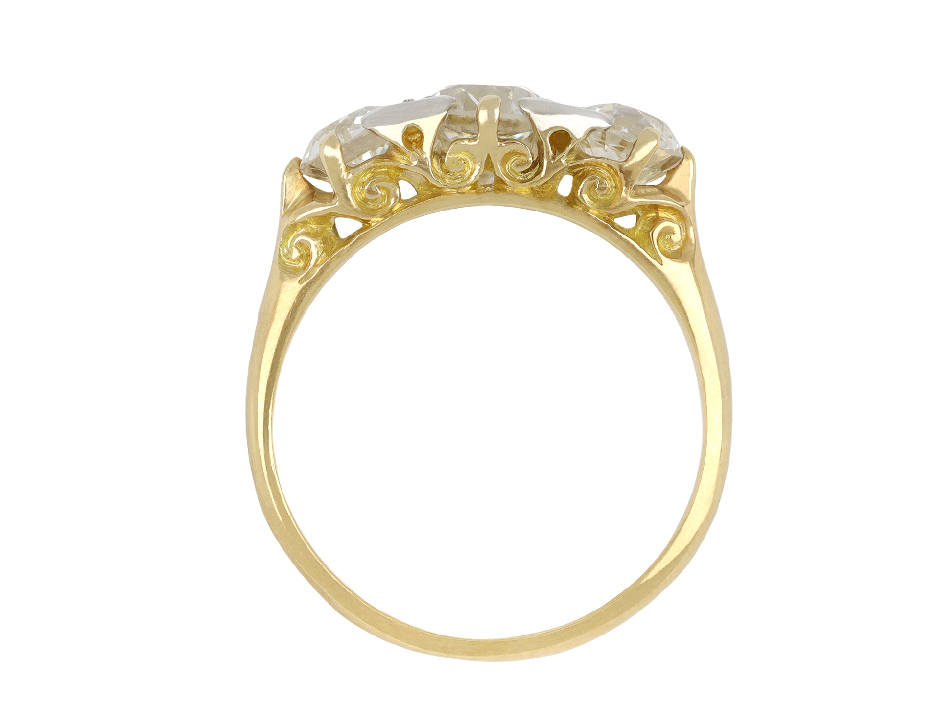 Victorian diamond three stone ring. Set to centre with a round old mine diamond in an open back claw and grain setting with an approximate weight of 0.90 carats, flanked by two round old mine diamonds in open back claw and grain settings with a combined weight of 1.20 carats, further set with four round rose cut diamonds in closed back grain settings with a combined weight of 0.04 carats. The total approximate diamond weight is 2.14 carats, all to an impressive three stone design featuring curving claws, an intricately carved gallery with scrolling motifs and fancy open backholing, leading to trumpeting carved shoulders and flowing through to a solid D-shape shank. Tested yellow gold and silver, circa 1890.