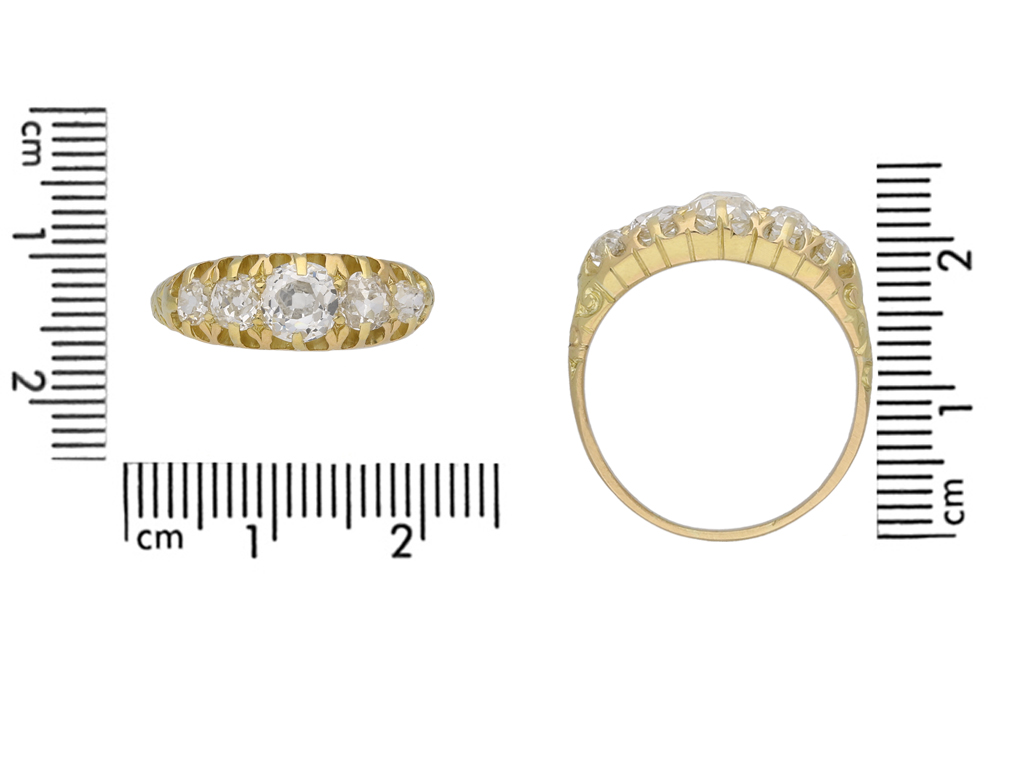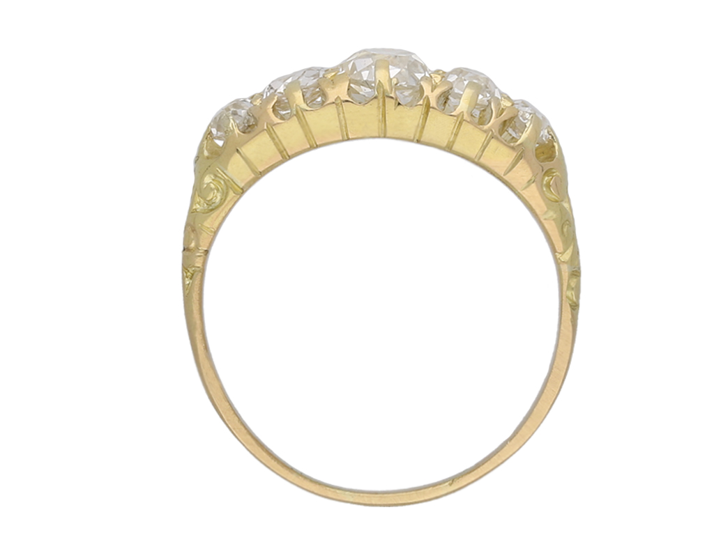 Victorian five stone diamond ring. Set horizontally with five cushion shape old mine cut diamonds in open back claw settings with an approximate combined weight of 1.65 carats, to an elegant graduating five stone design featuring stylised claws, an intricately pierced gallery with linear engravings and open shaped backholing, leading to trumpeting carved shoulders and flowing through to a solid D-shape shank. Tested 18 carat yellow gold, English, circa 1890.