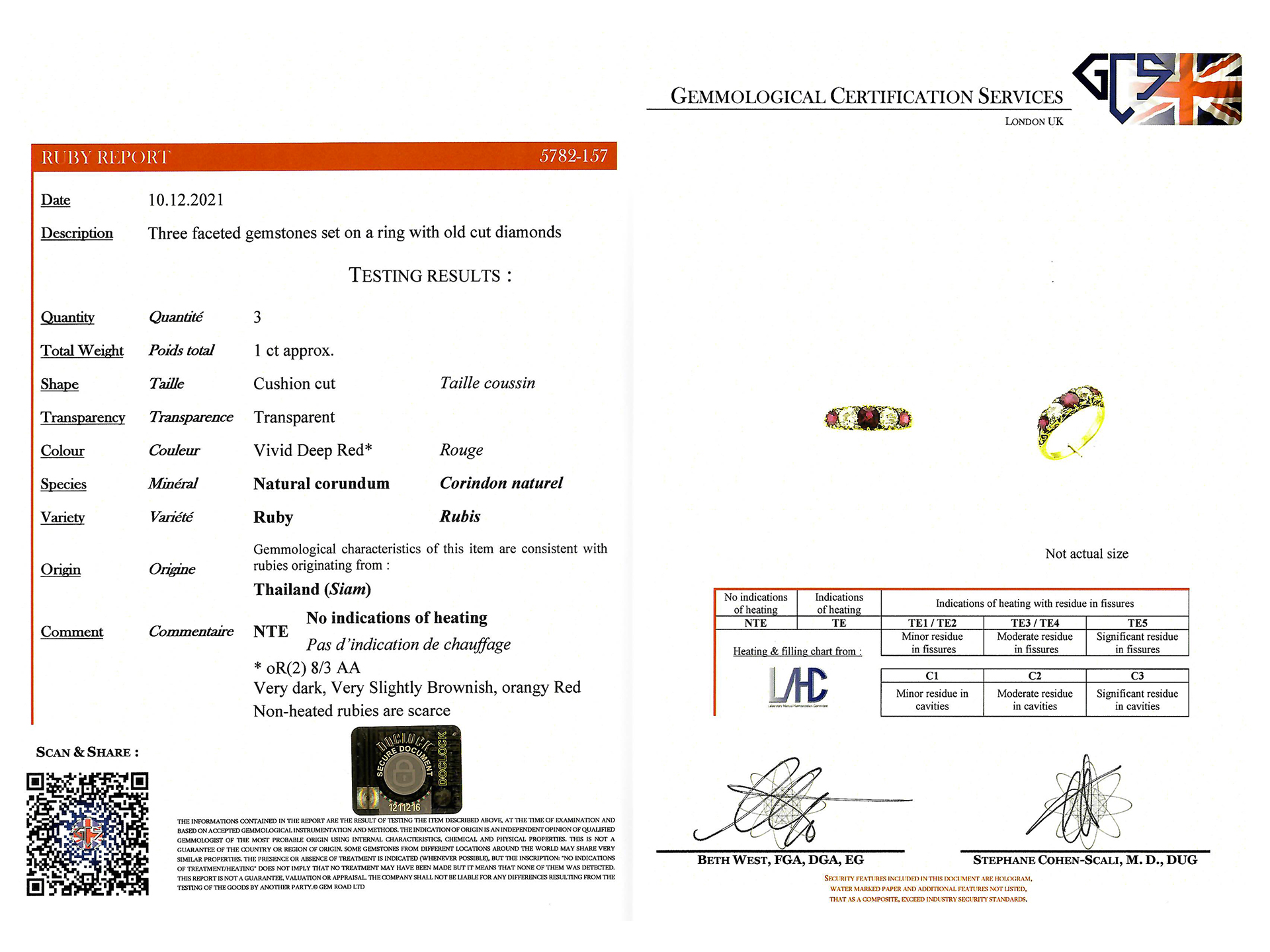Victorian five stone ruby and diamond ring. Set with three cushion shape old cut natural unenhanced Siam rubies in open back claw settings with a combined approximate weight of 1.00 carats, further set with two round old cut diamonds in open back claw and grain settings with a combined approximate weight of 0.70 carats, accented with eight round rose cut diamonds in open back grain settings with a combined weight of 0.08 carats. The total approximate diamond weight is 0.78 carats, to an ornate five stone design featuring curving claws, a carved openwork gallery with scrolling motifs and fancy open backholing, leading to engraved shouders and flowing through to a smoothly conforming solid D-shape shank. Marked 18 carat yellow gold, English, circa 1900, accompanied by Gemmological Certification Services report #5782-157 and Gem & Pearl Laboratory report #18768.