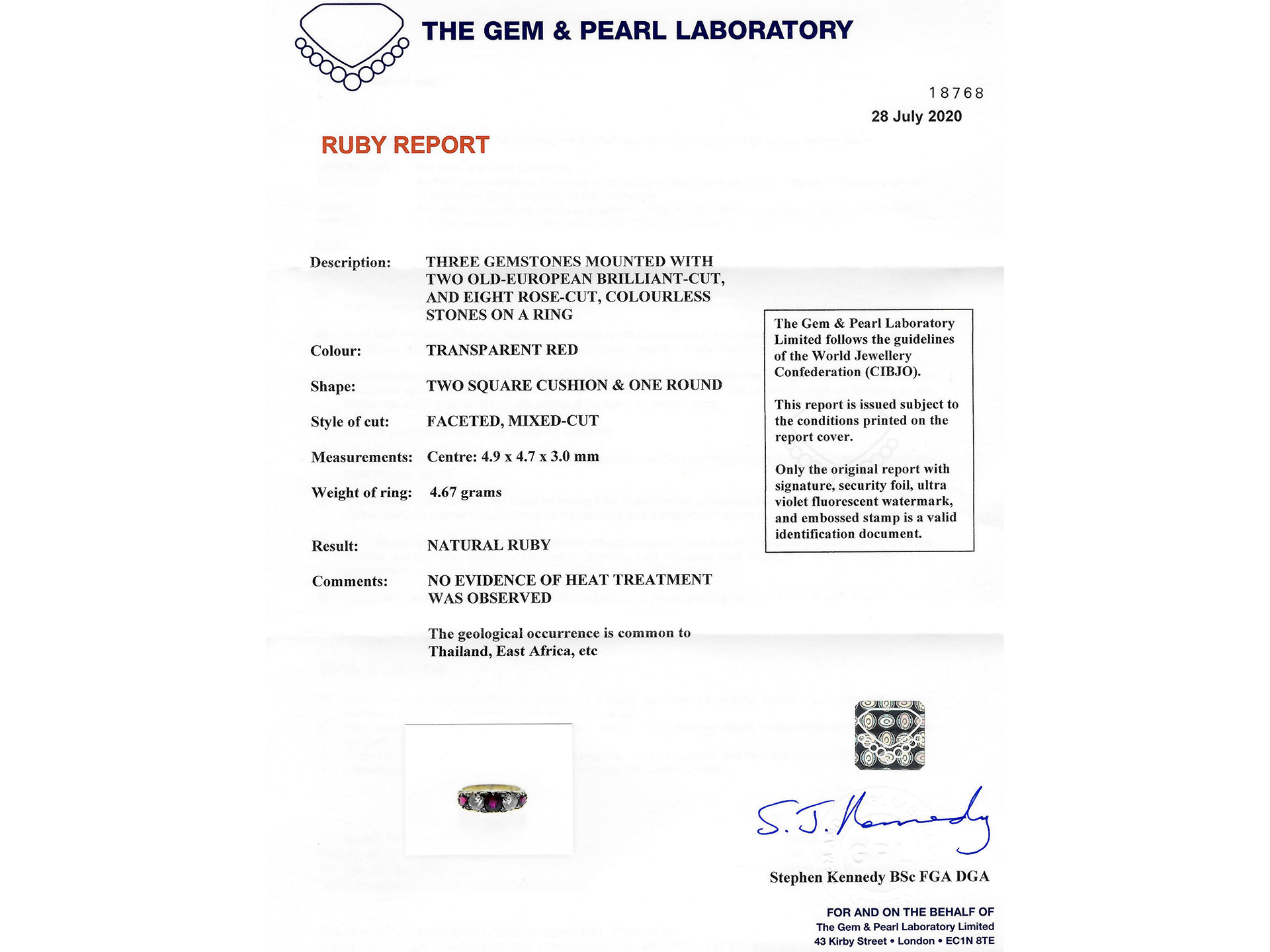Gemstone 3 x Rubies, Old Cut, approximately 1ct total 2 x Diamonds, Old Cut, approximately 0.7ct total 8 x Diamonds, Rose Cut, approximately 0.08ct total