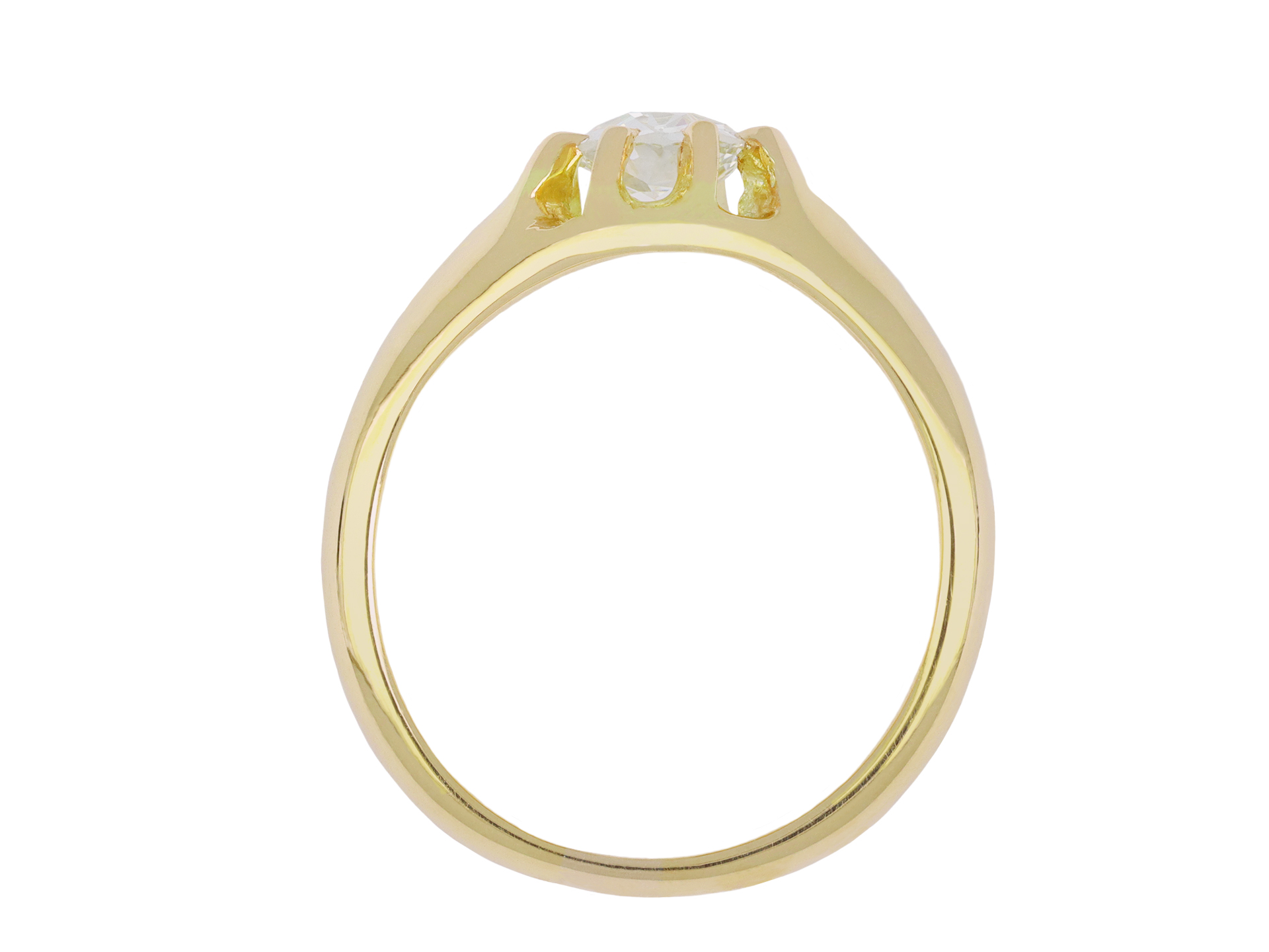 Old mine diamond solitaire ring. Set to centre with a cushion shape old mine diamond, with an approximate weight of 0.65 carat in an open back claw setting, to an impressive solitaire design with curving claws, an intricately pierced gallery and circular open backholing, leading to smooth shoulders with carved detailing and flowing through to a solid D-shape shank. Marked 18 carat yellow gold, full hallmarks for London, English, 1878.