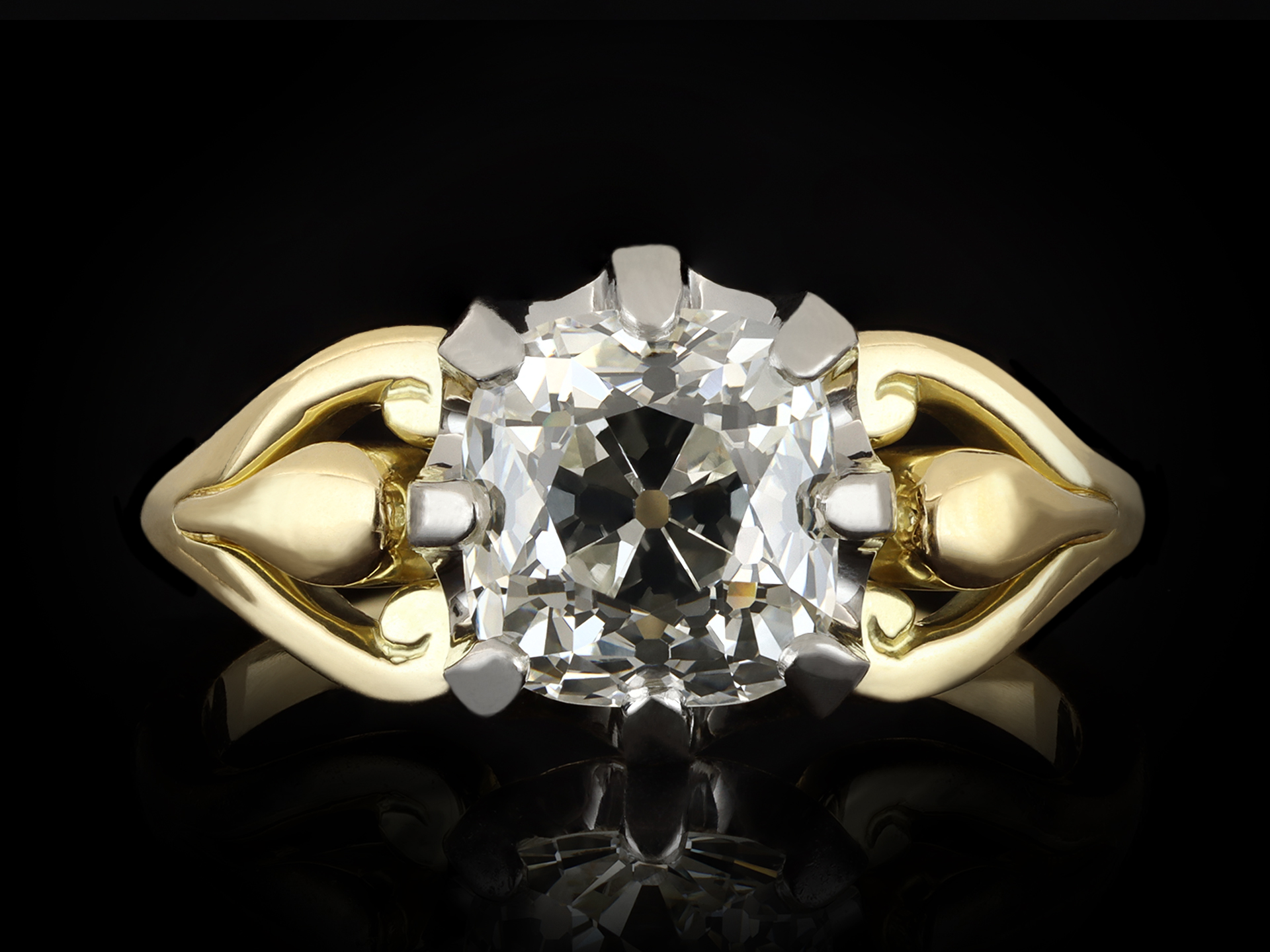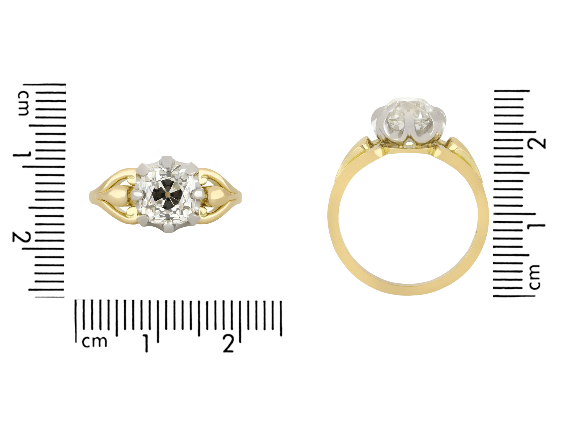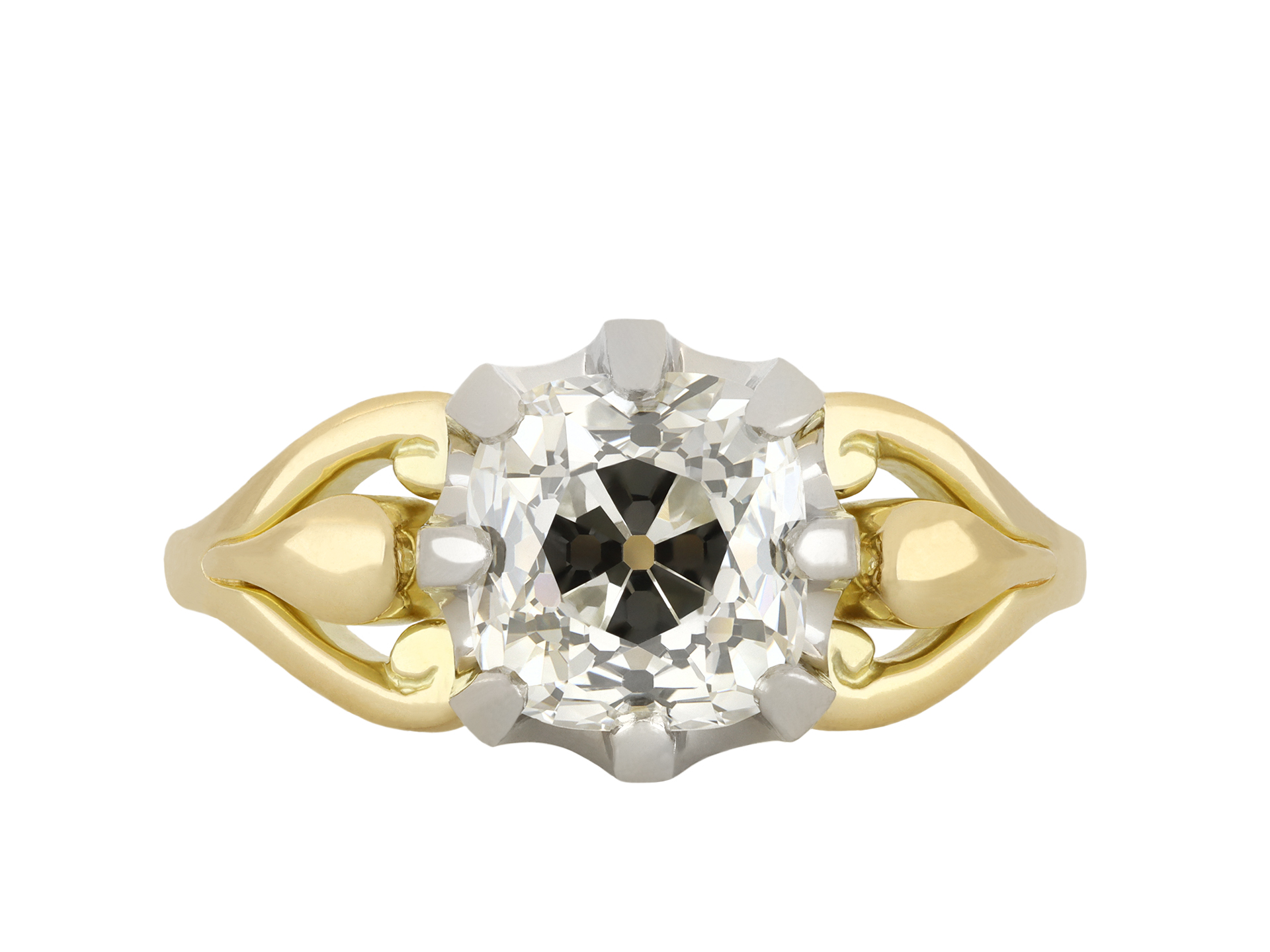 Victorian old mine diamond solitaire ring. Set with a cushion shape old mine diamond, L colour, VS2 clarity, with a weight of 2.05 carats, in an open back claw setting, to an impressive solitaire design featuring curving claws, an intricately pierced gallery and open backholing, leading to broad openwork shoulders and tapering through to a solid D-shape shank. Tested yellow gold and platinum, circa 1900, accompanied by Gemological Institute of America (GIA) report #1226830933.