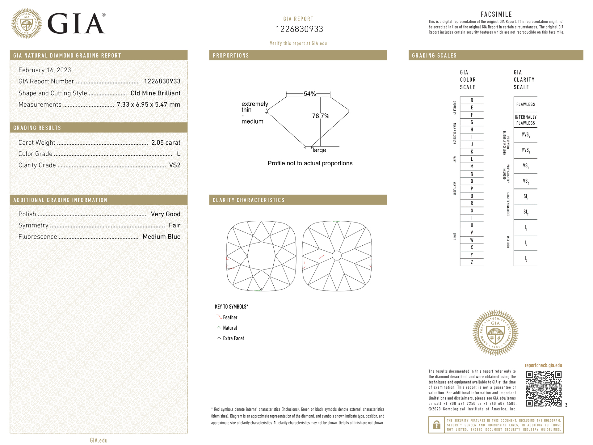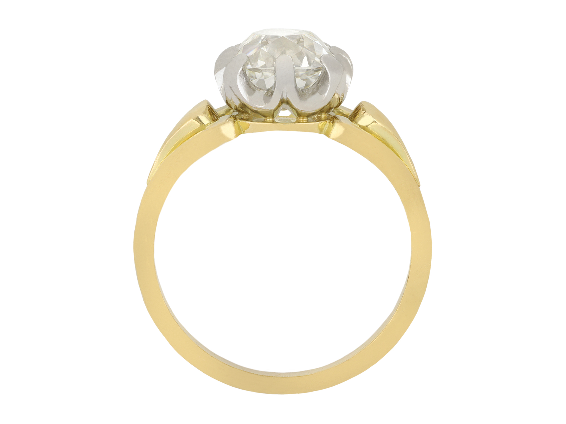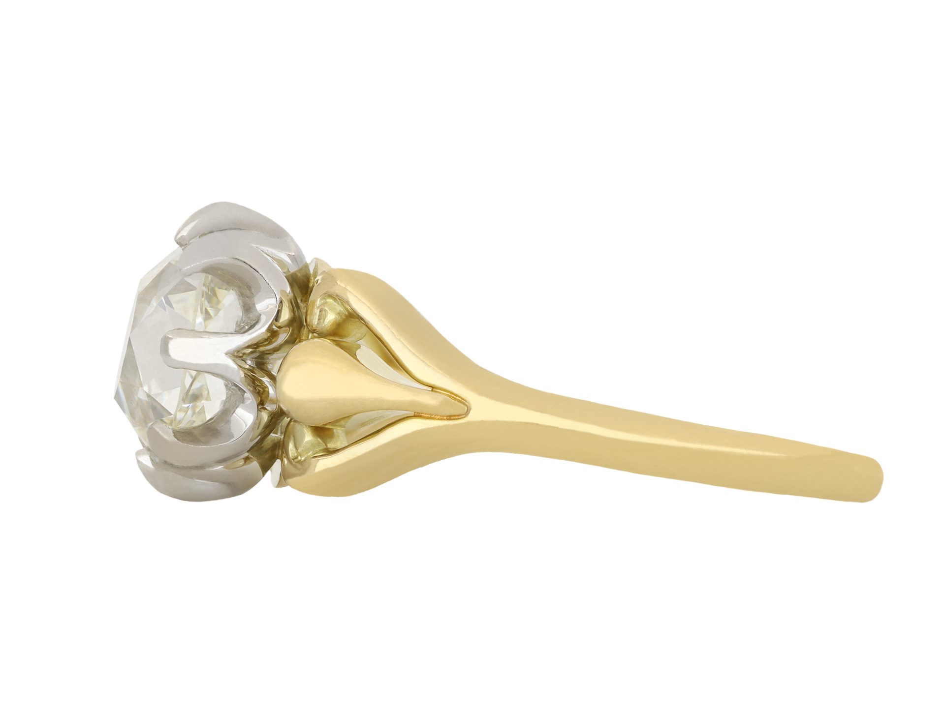 Victorian old mine diamond solitaire ring. Set with a cushion shape old mine diamond, L colour, VS2 clarity, with a weight of 2.05 carats, in an open back claw setting, to an impressive solitaire design featuring curving claws, an intricately pierced gallery and open backholing, leading to broad openwork shoulders and tapering through to a solid D-shape shank. Tested yellow gold and platinum, circa 1900, accompanied by Gemological Institute of America (GIA) report #1226830933.