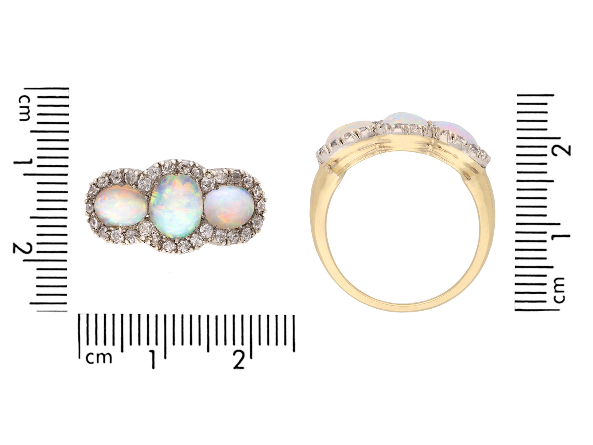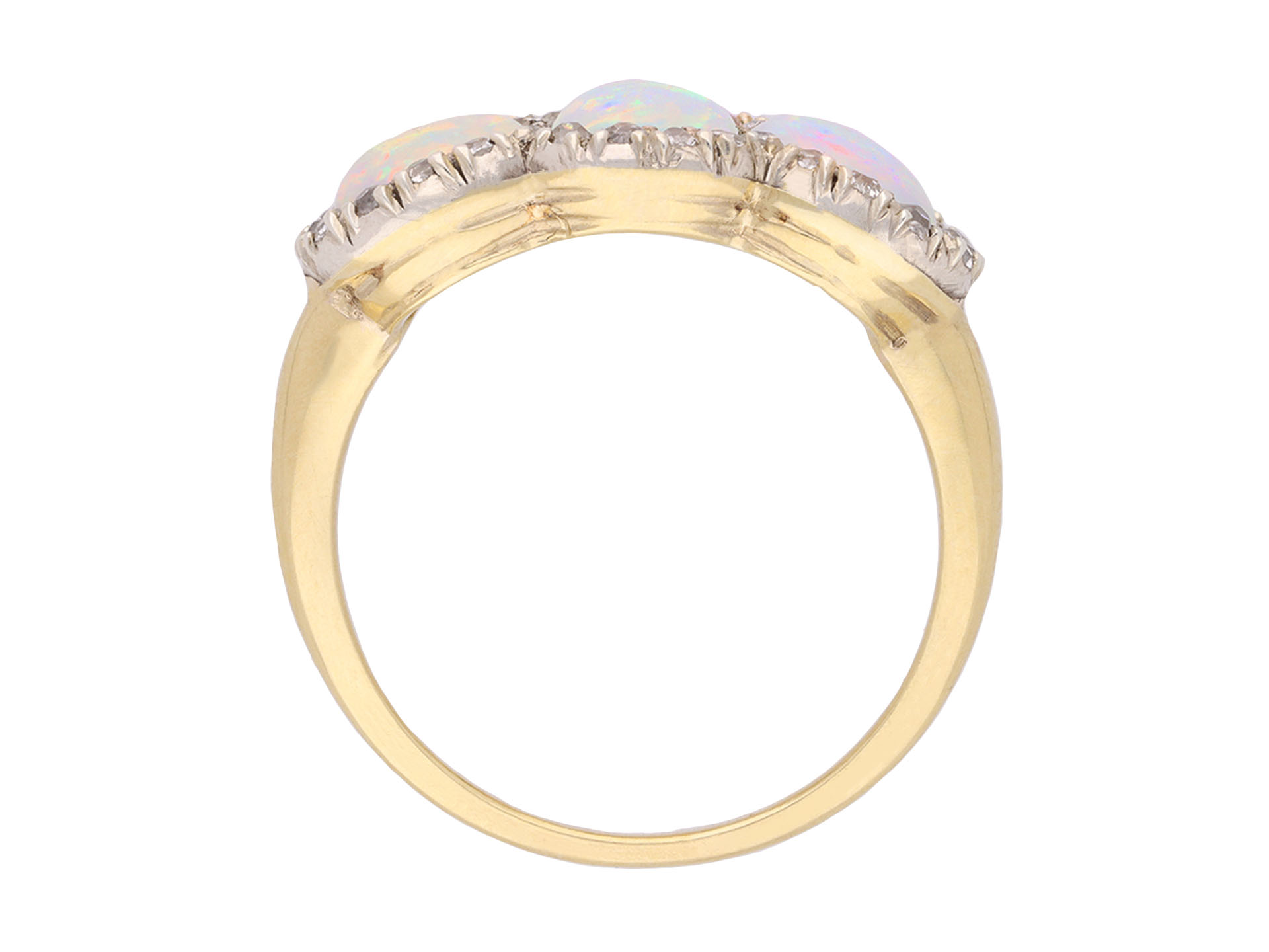 Victorian opal and diamond diamond cluster ring. Set with three oval cabochon natural opals in open back claw and grain settings with a combined approximate weight of 1.50 carats, further set with thirty round mixed old cut diamonds in open back cut-down and grain settings with a combined approximate weight of 0.60 carats, to a triple cluster design featuring stylised claws, a linear engraved gallery and fancy shape open backholing, leading to smooth shoulders and tapering through to a solid D-shape shank. Tested yellow gold and silver, circa 1890.