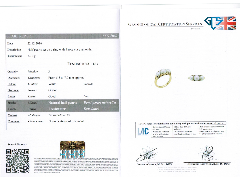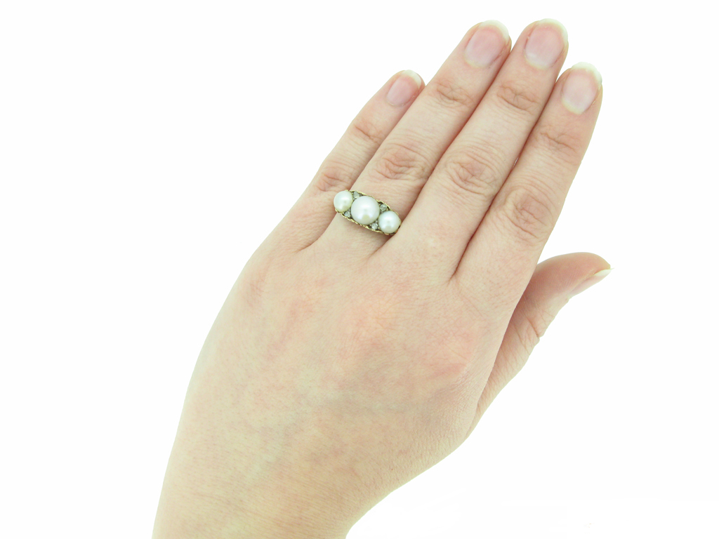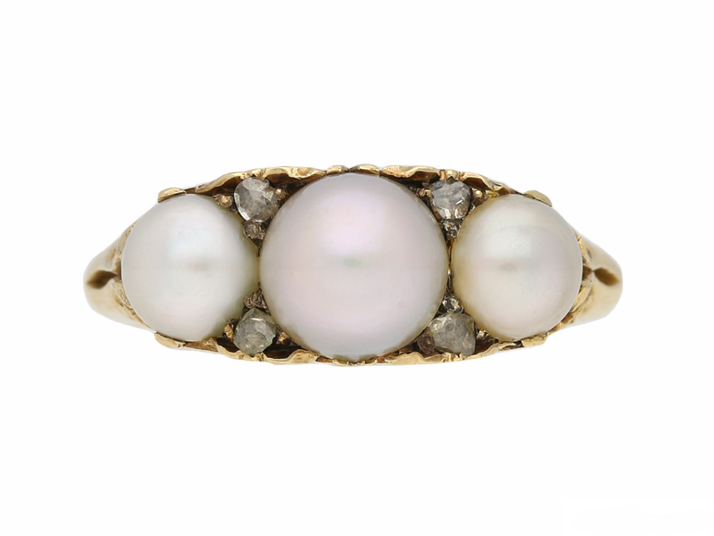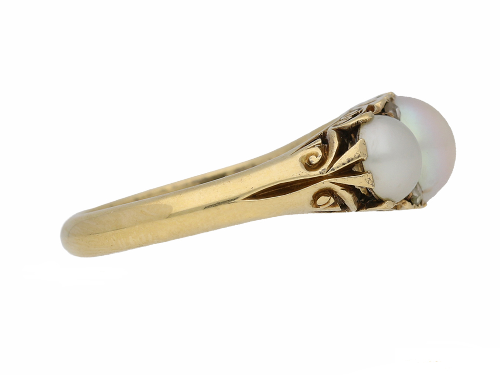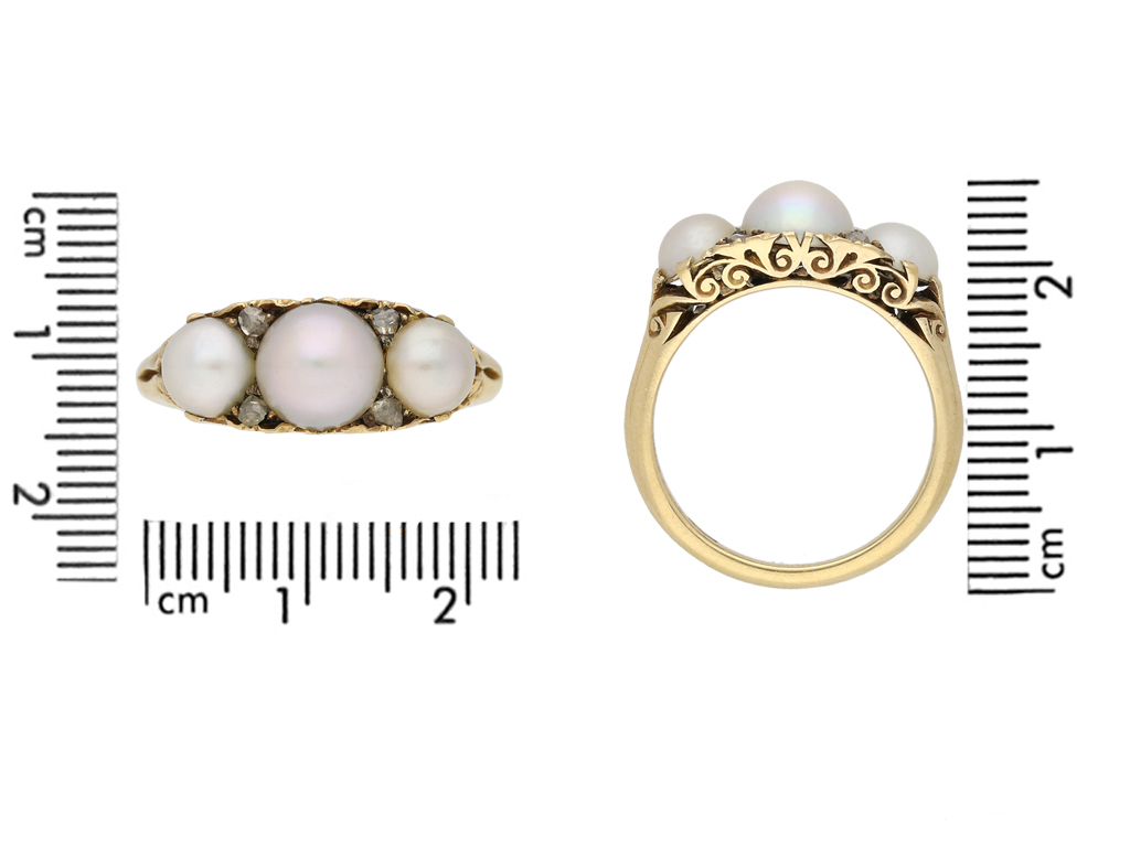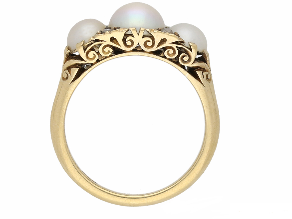 Victorian pearl carved half hoop ring. Set horizontally with three graduating natural freshwater pearls, approximately 5.5 to 7.0 mm in diameter, in closed back claw settings, further enhanced with four round rose cut diamonds in closed back grain settings with a combined approximate weight of 0.04 carats, to an intricately carved half hoop design featuring a scrolling gallery and closed backholing, leading to shoulders with stylised palmette detail and flowing through to a solid D-shape shank. Marked 18 carat yellow gold, English, circa 1890, accompanied by Gemmological Certification Services report #5777-8047.