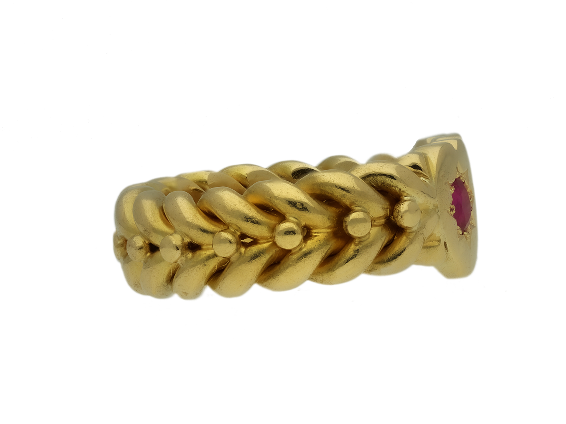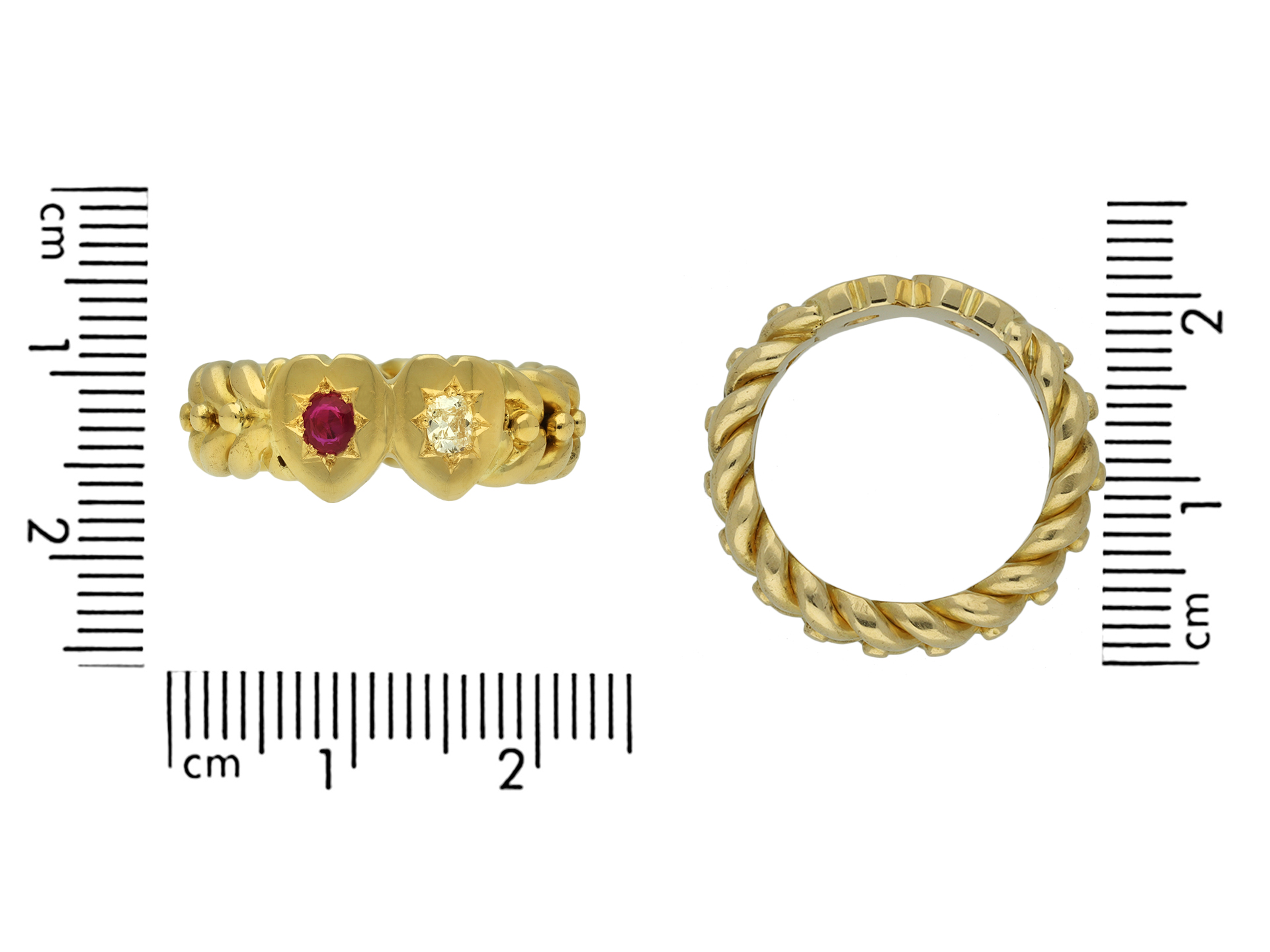 Victorian ruby and diamond two stone ring. Set with an oval old cut natural unenhanced ruby in an open back grain setting with an approximate weight of 0.10 carats, further set with a cushion shape old cut diamond in an open back grain setting with an approximate weight of 0.10 carats, to two heart shape plaques with a starburst engraving, featuring polished edges and open backholing, the shoulders with a heavy plaited design, flowing to a solid shank. Tested 18 carat yellow gold, circa 1890.