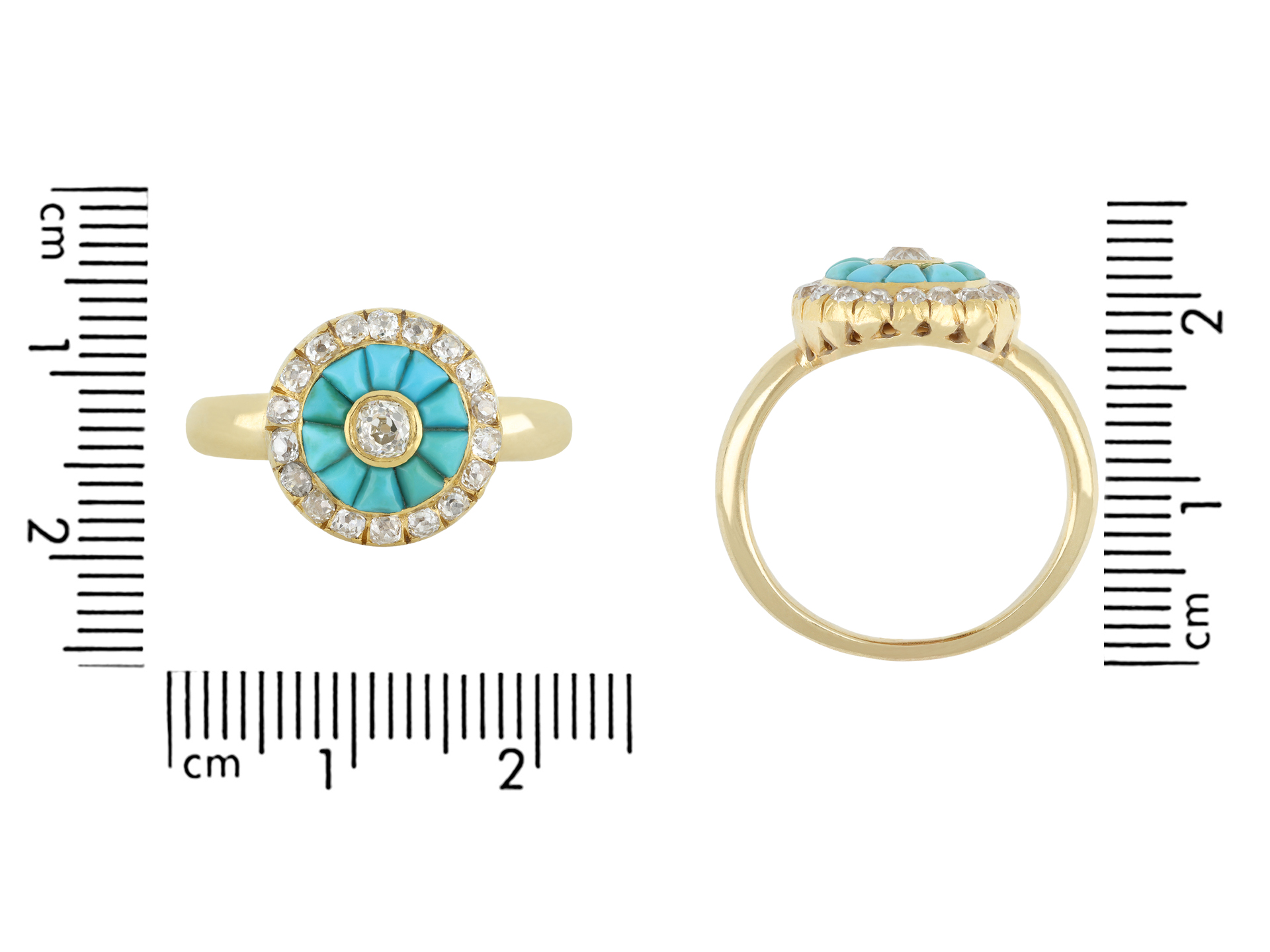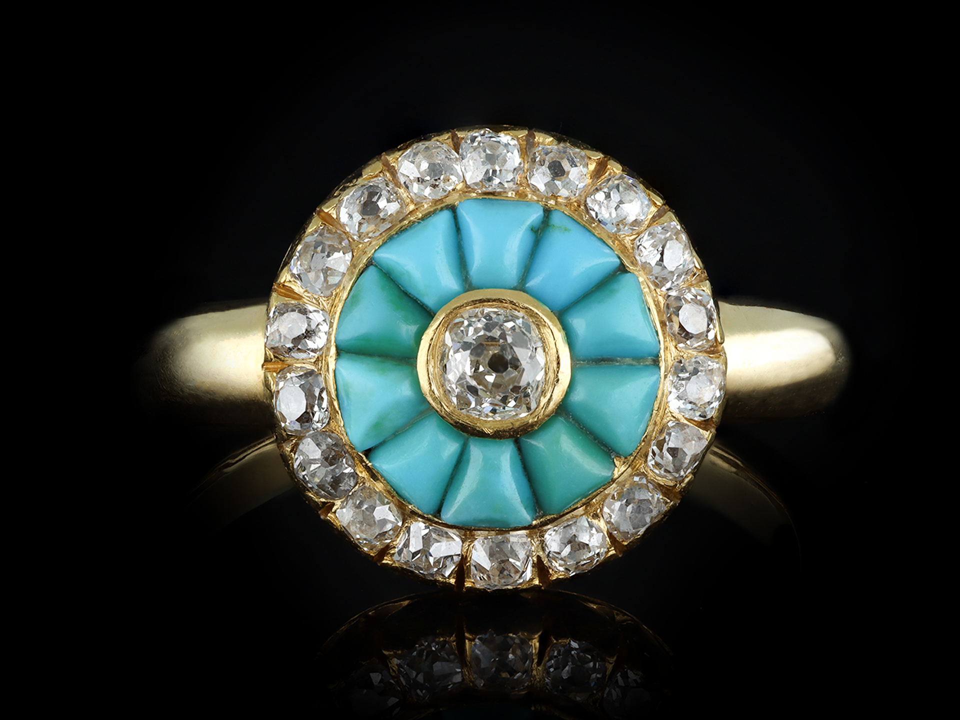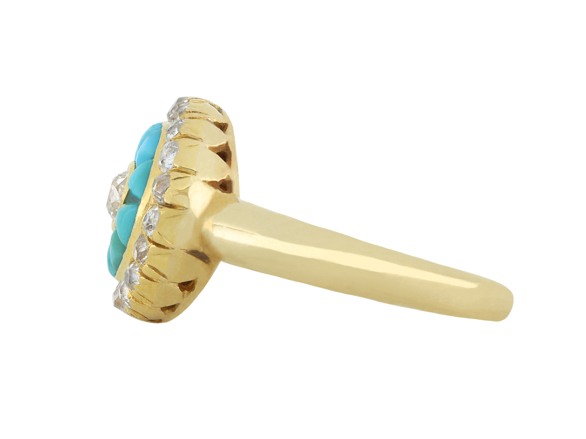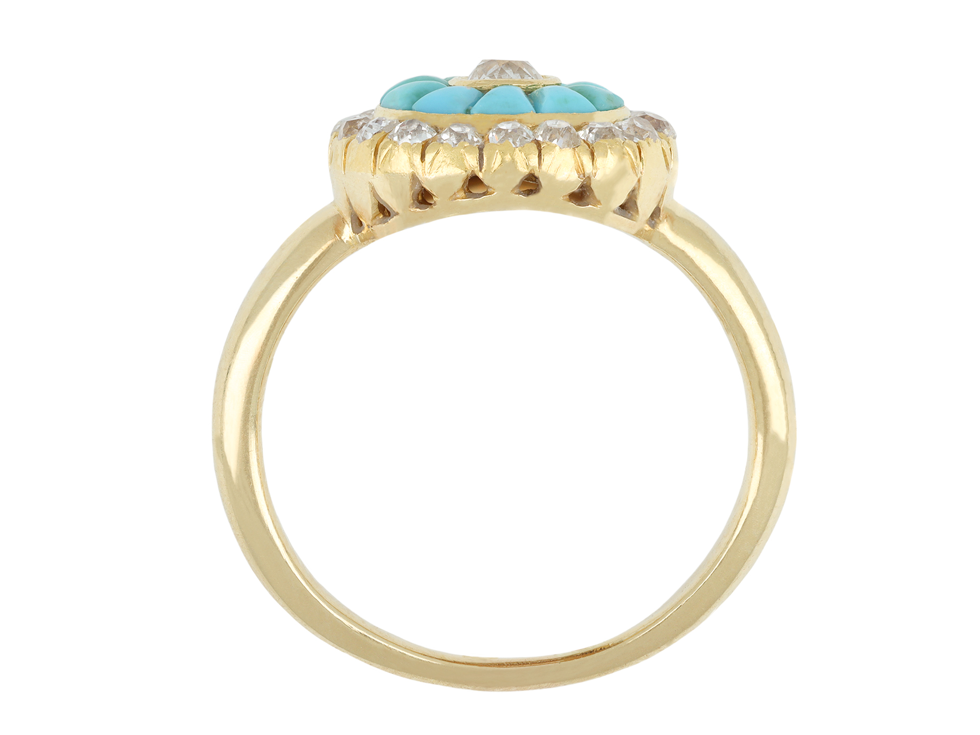 Victorian turquoise and diamond cluster ring. Set to centre with a cushion shape old mine diamond in a open back rubover setting with an approximate weight of 0.17 carats, encircled by ten tapered cabochon cut natural turquoises in closed back channel settings, further adorned with eighteen cushion shape old mine diamonds in open back cut-down and rubover settings with a combined weight of 0.54 carats. The total approximate diamond weight is 0.71 carats, to an impressive cluster design featuring an intricately pierced gallery and fancy shape open backholing, leading to smooth shoulders and flowing through to a solid D-shape shank. Tested yellow gold, indistinct mark, circa 1890.