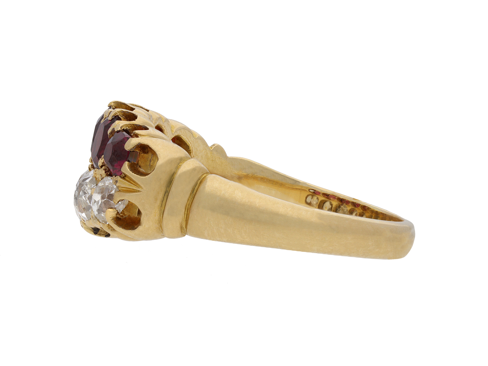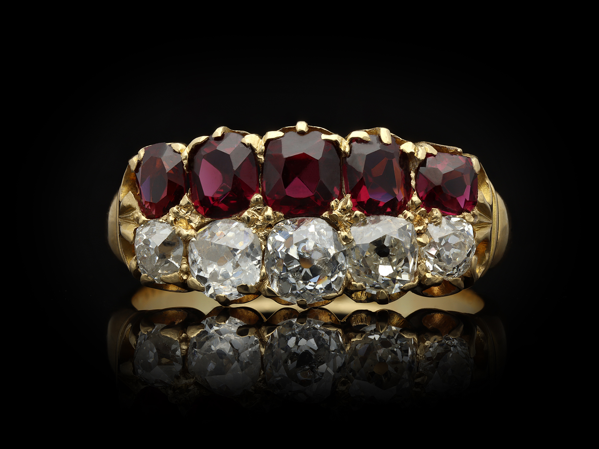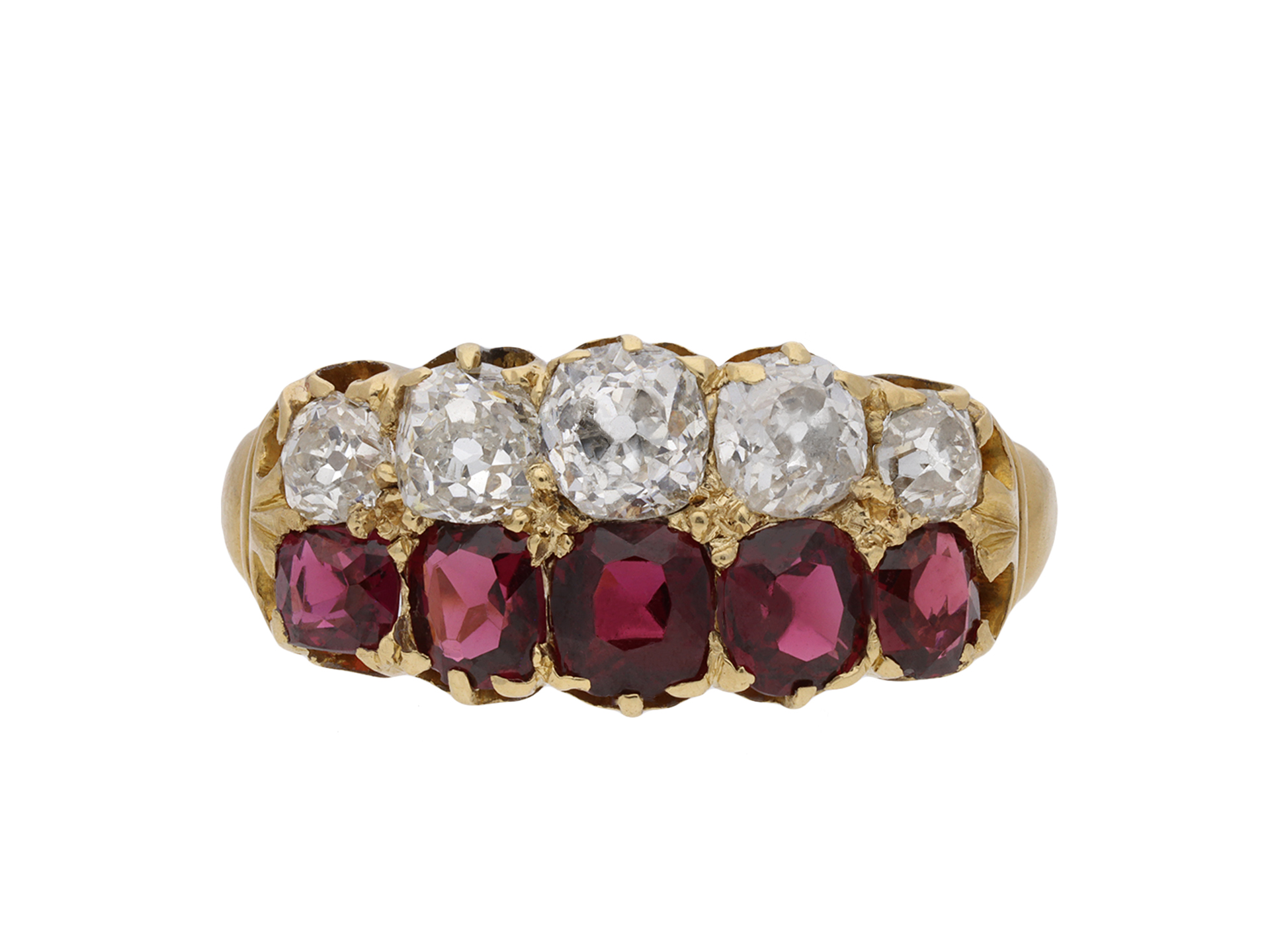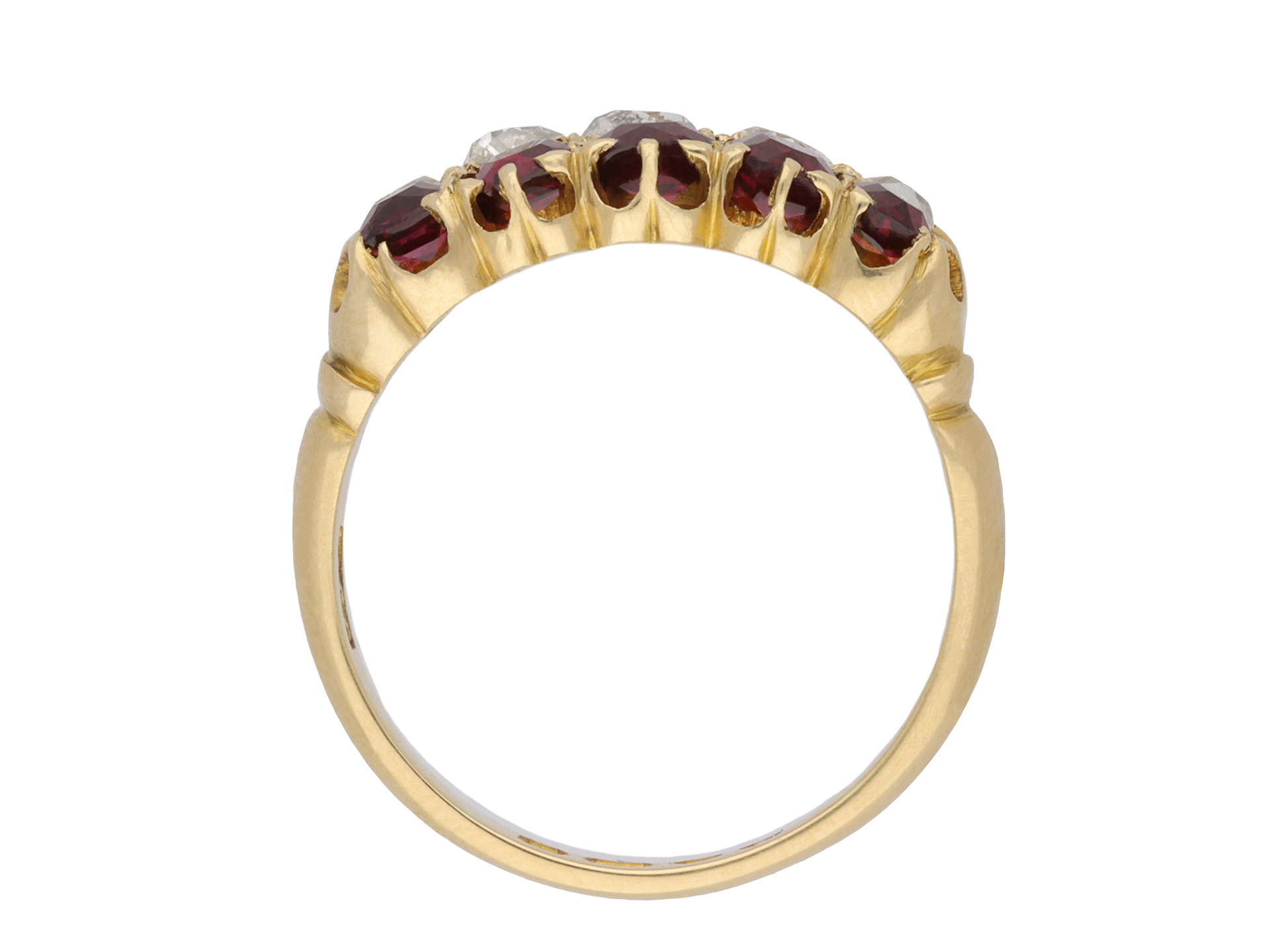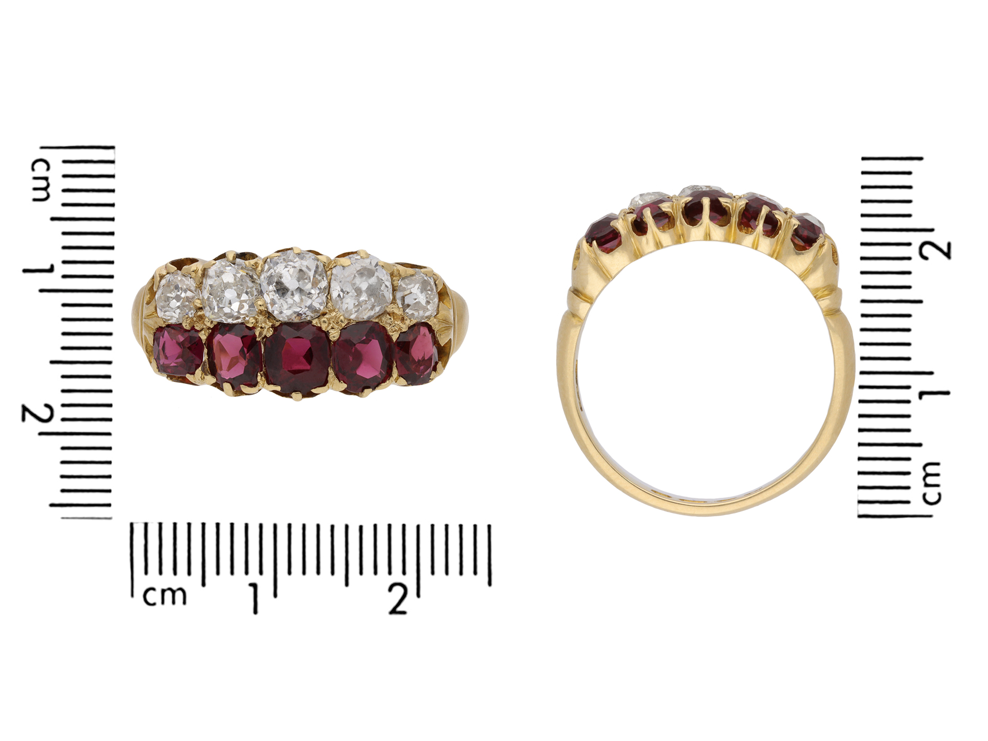 Victorian two row garnet and diamond ring. Set with a row of five cushion shaped old cut natural unenhanced garnets in open back grain and claw settings with an approximate combined weight of 1.15 carats, adjacently set with a row of five cushion shape old mine diamonds in open back grain and claw settings with an approximate combined weight of 1.27 carats, to an impressive double row horizontal cluster design, with an ornately pierced gallery and fancy open backholing, leading to trumpeting shoulders with ridged detail flowing through to a solid D-shape shank. Marked 18 carat yellow gold, makers mark 'MEG', for Michael Eleazer Goldstein, full English hallmarks for London, English, 1884.