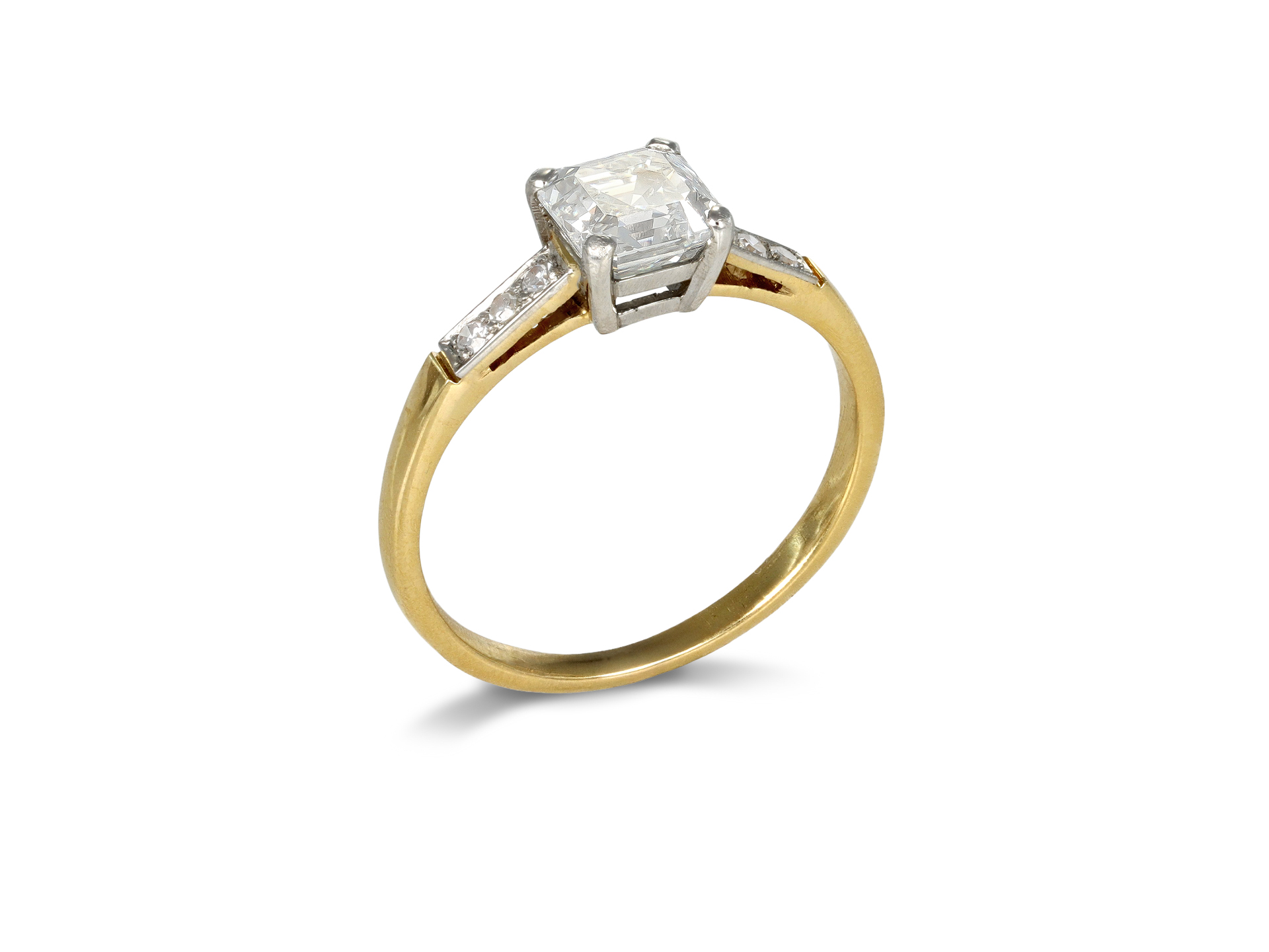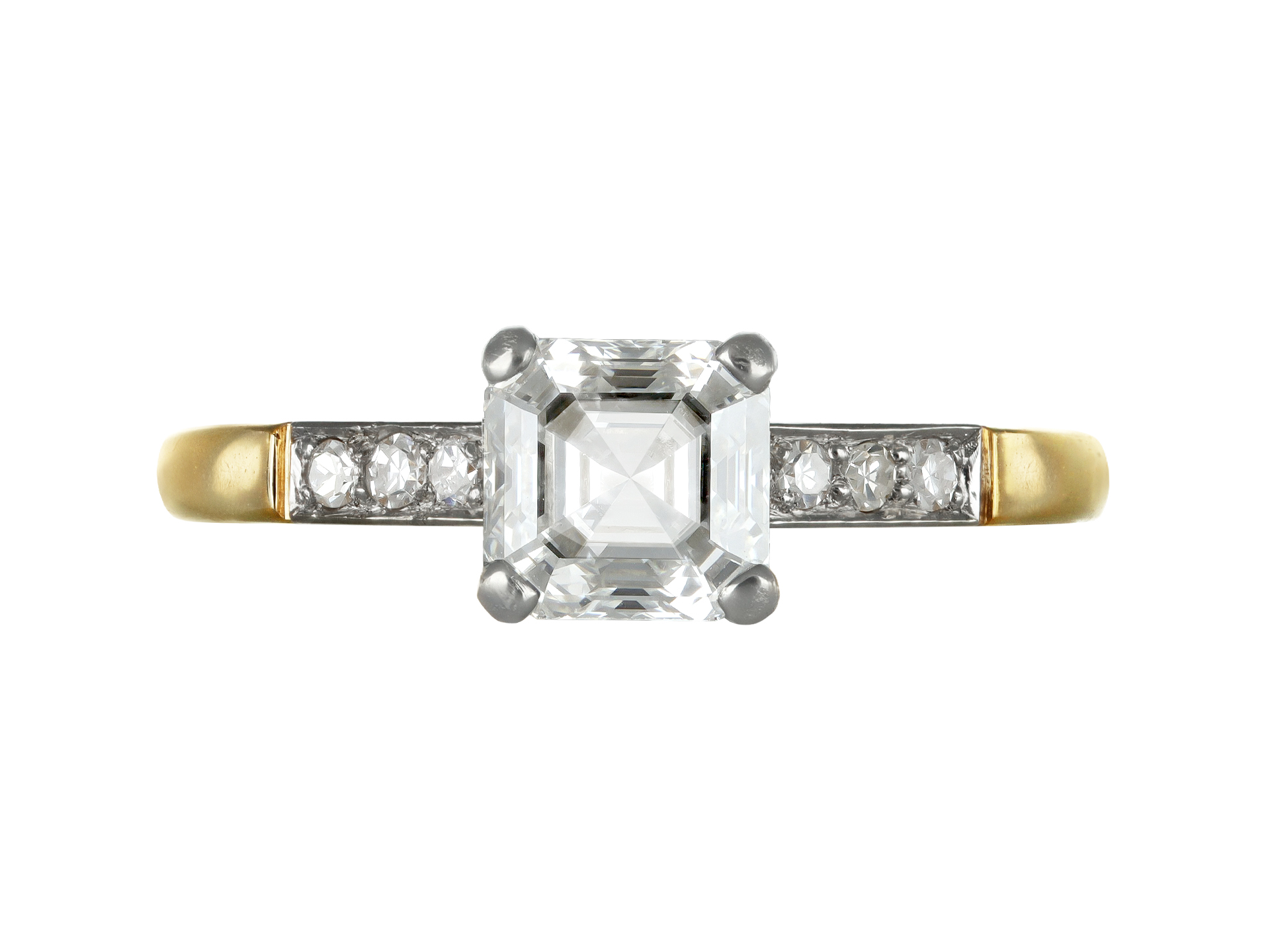 Vintage Asscher cut diamond ring. Set with an octagonal asscher cut diamond, G colour, VS2 clarity, with an approximate weight of 1.12 carats, in an open back claw setting, further set with six round eight cut diamonds in open back grain settings with a combined weight of 0.12 carats. The total approximate diamond weight is 1.24 carats, to an elegant flanked solitaire design, featuring curving corner claws, a structured openwork gallery and fancy open backholing, flanked by trumpeting split shoulders flowing down to a solid D-shape shank. Tested yellow gold with platinum settings, circa 1950, accompanied by Gemological Institute of America report #1159122021.