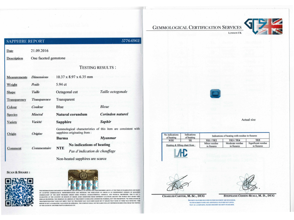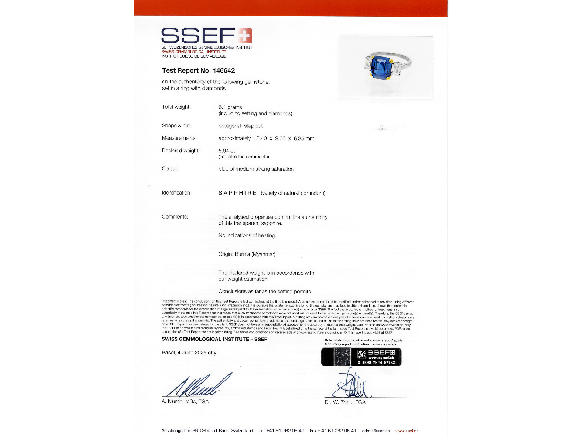 Vintage Burmese sapphire and diamond ring. Centrally set with an octagonal emerald-cut natural unenhanced Burmese sapphire in an open back claw setting with a weight of 5.94 carats, flanked by one octagonal emerald-cut diamond, D colour, VS2 clarity, with a weight of 0.62 carats, in an open back claw setting, and further set with a second octagonal emerald-cut diamond, D colour, VS1 clarity, with a weight of 0.58 carats, in an open back claw setting. The total approximate diamond weight is 1.20 carats, to a geometric three stone design featuring corner claws, a rectangular pierced gallery and fancy open backholing, leading to raised openwork shoulders flowing smoothly through to a solid D-shape shank. Marked 18 carat gold and platinum, English, circa 1950, accompanied by Gemmological Certification Services report #5776-6962, SSEF report #146642 and Gemological Institute of America (GIA) reports #7232044791 and #1225763766.
