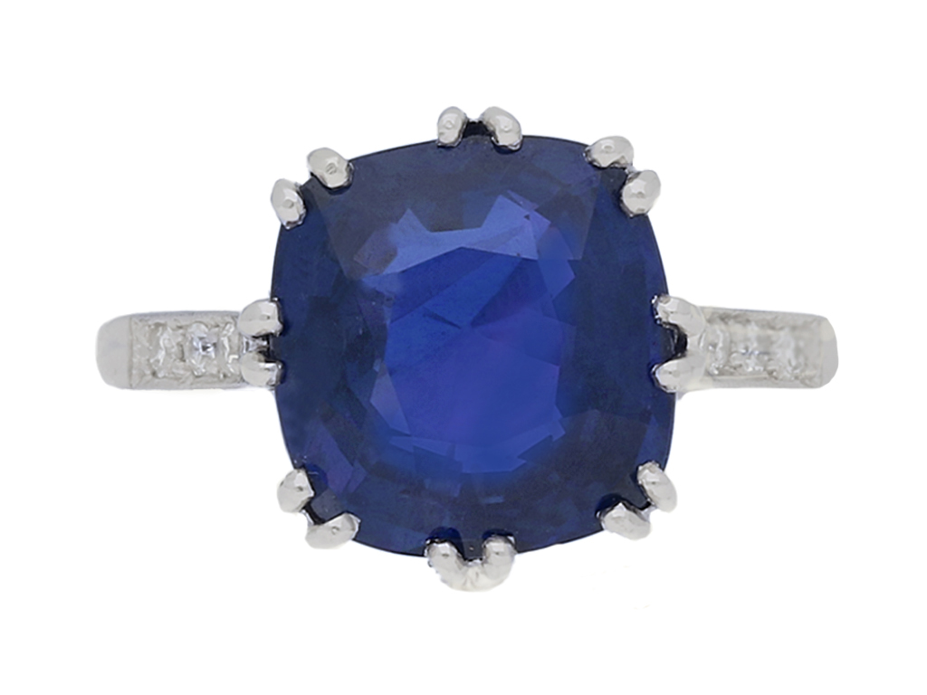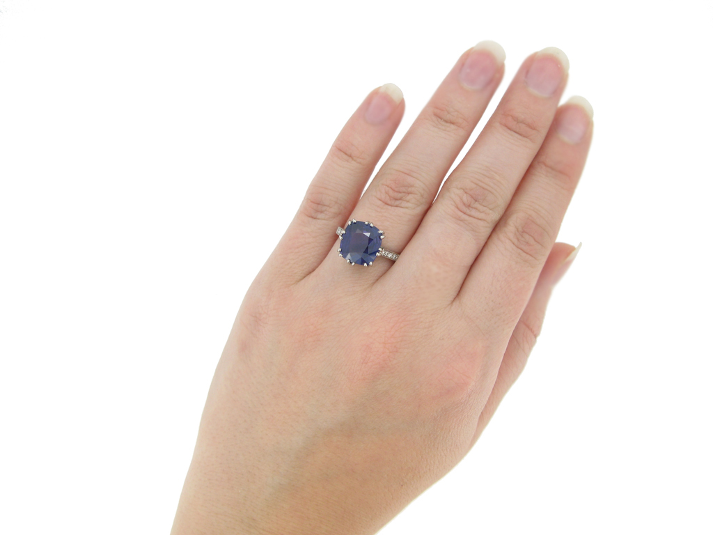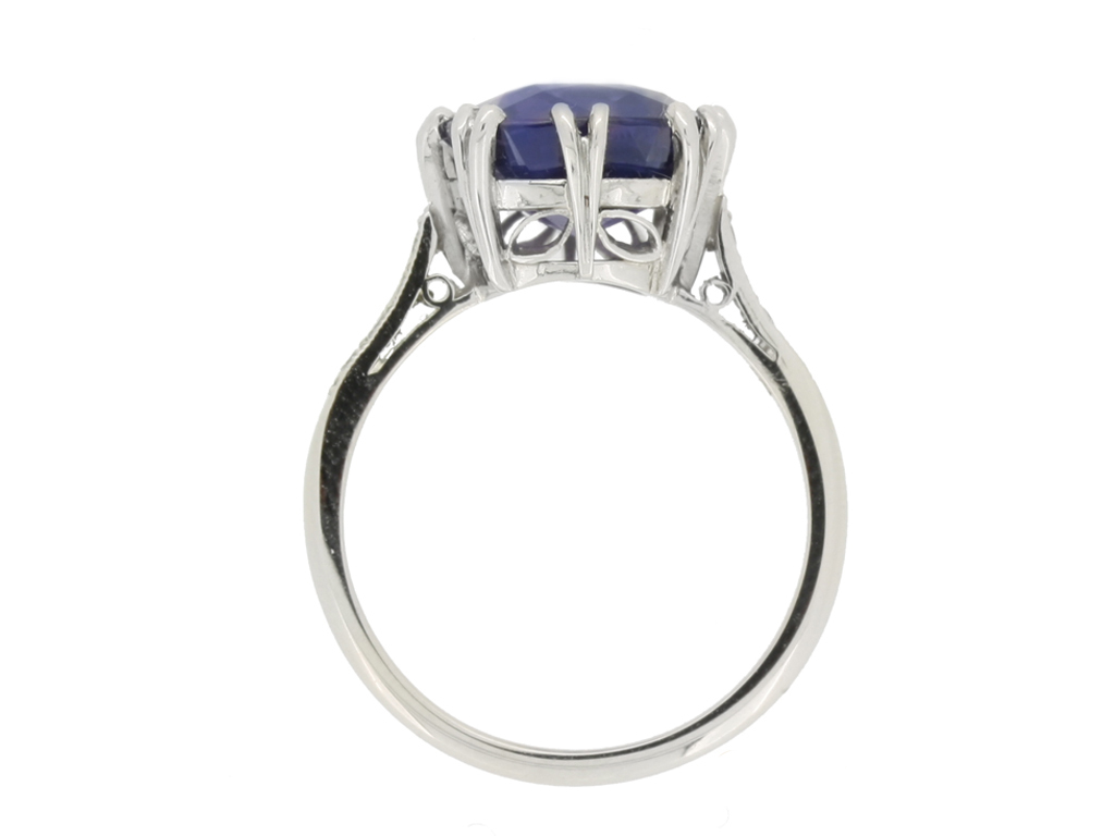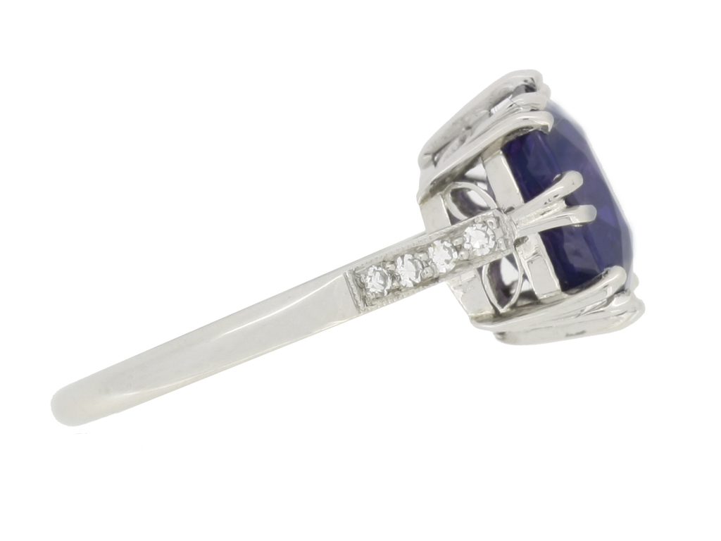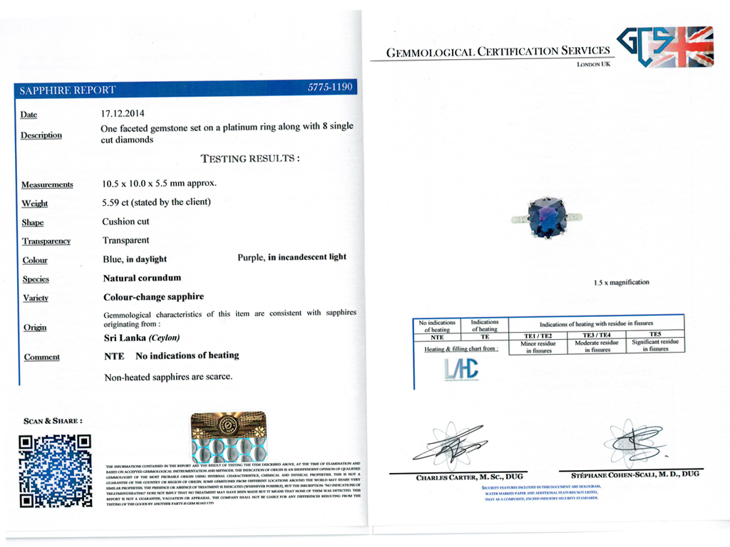 Vintage colour change Ceylon sapphire ring. Set to centre with a single cushion shape old cut natural unenhanced colour change Ceylon sapphire, blue in daylight, purple in incandescent light in an open back claw setting with an approximate weight of 5.59 carats, flanked by eight round eight cut diamonds in open back grain and millegrain settings with an approximate combined weight of 0.16 carats, to a flanked solitaire design featuring curving split claws, an intricately pierced gallery with a foliate motif and open backholing, leading to gently sloping shoulders, flowing through to a solid D-shape shank. Marked platinum, circa 1950, accompanied by Gemmological Certification Services report #5775-1190.