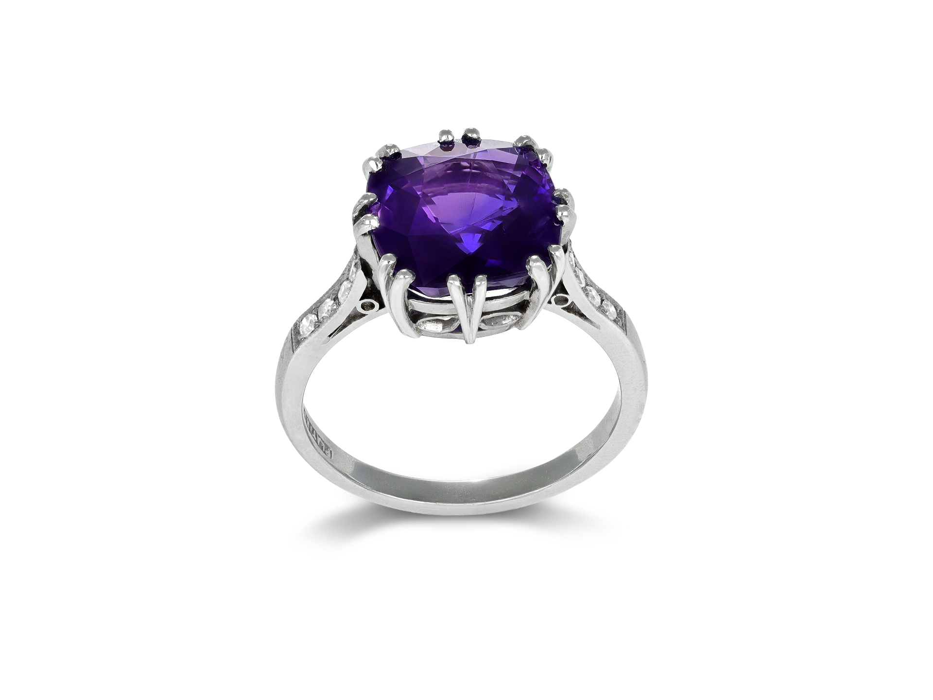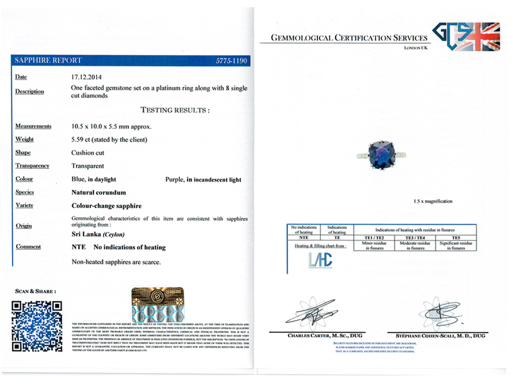Colour change Ceylon sapphire ring. Set to centre with a single cushion shape old cut natural no heat colour change Ceylon sapphire, blue in daylight, purple in incandescent light in an open back claw setting with a weight of 5.59 carats, flanked by eight round eight cut diamonds in open back grain and millegrain settings with an approximate combined weight of 0.16 carats, to a flanked solitaire design featuring curving split claws, an intricately pierced gallery with a foliate motif and open backholing, leading to gently sloping shoulders, flowing through to a solid D-shape shank. Marked platinum, circa 1950, accompanied by Gemmological Certification Services report #5775-1190.
