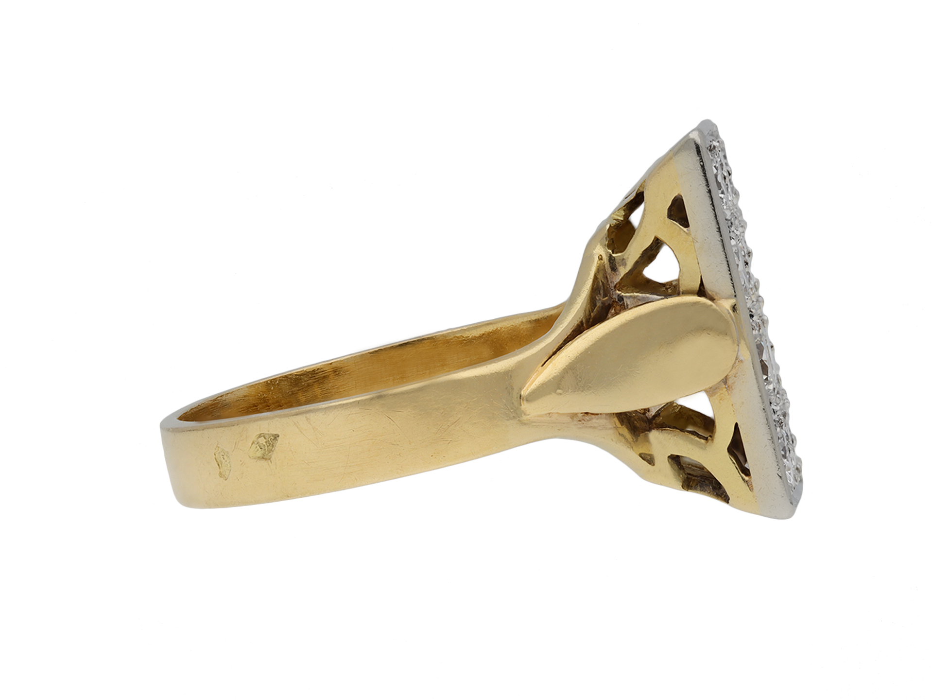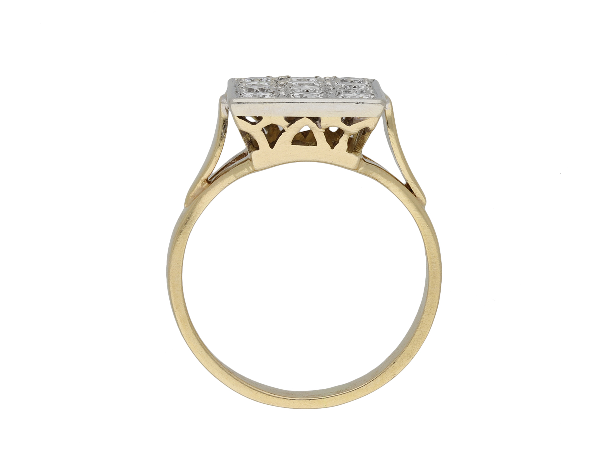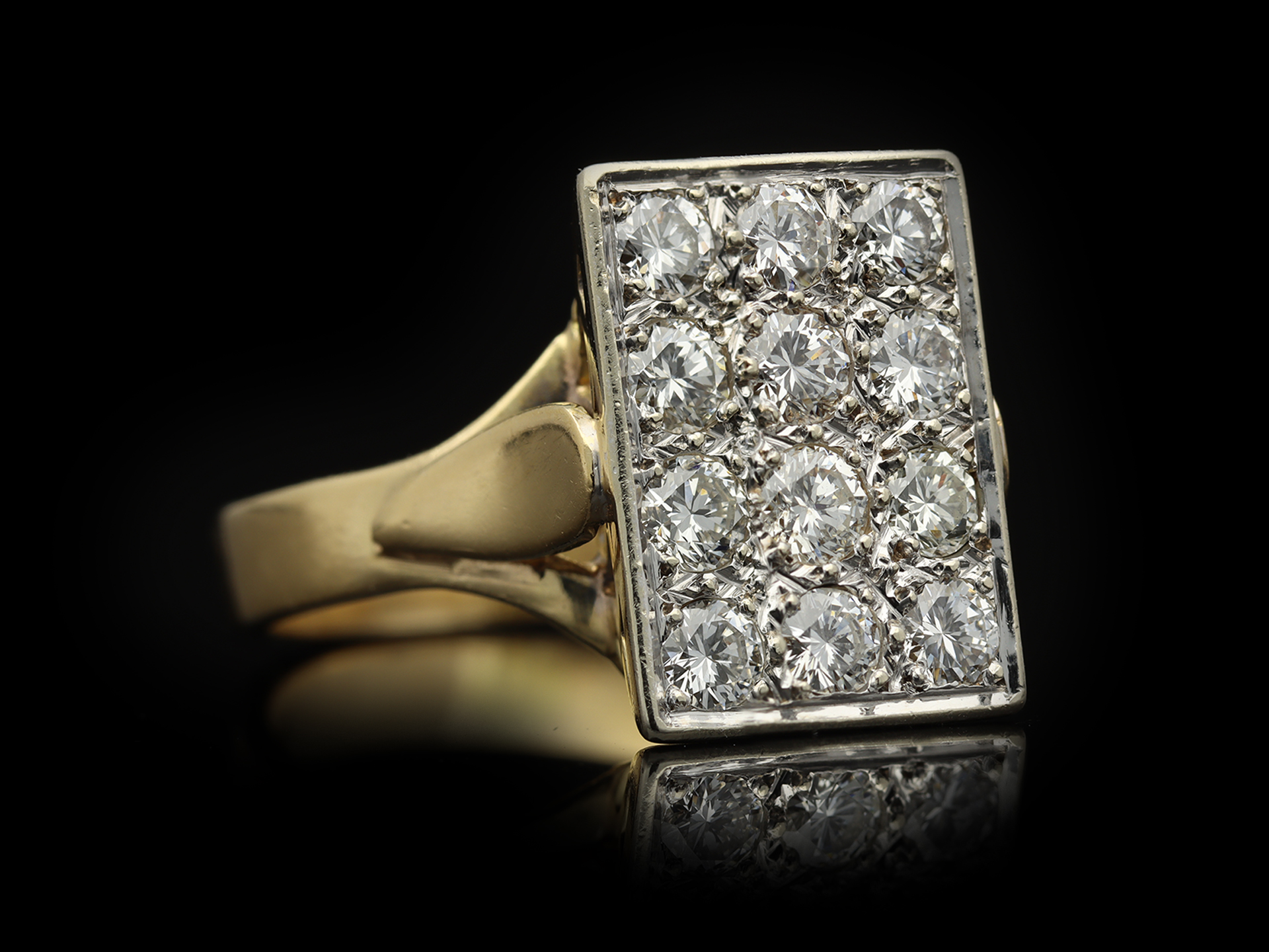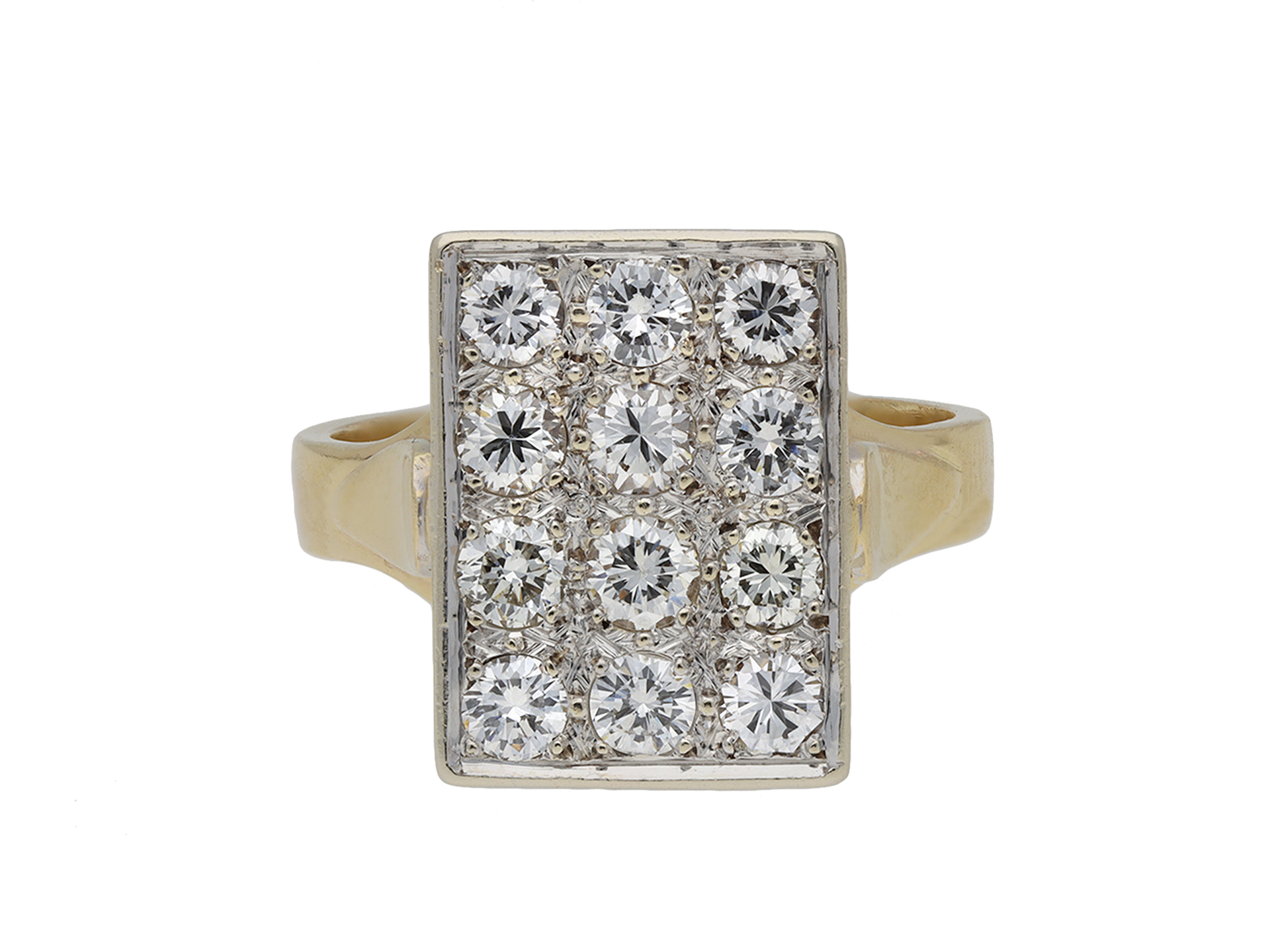 Vintage diamond cluster ring. Set with four rows of three round brilliant cut diamonds in open back grain settings, twelve in total with an approximate combined weight of 1.50 carats, to a rectangular plaque cluster design featuring polished borders, a decoratively pierced gallery and open backholing, leading to raised shoulders with a foliate motif and flowing through to a solid flat shank. Marked 18 carat yellow gold and platinum, maker's mark 'J and F' with a ink bottle and feather quill, French, circa 1950.