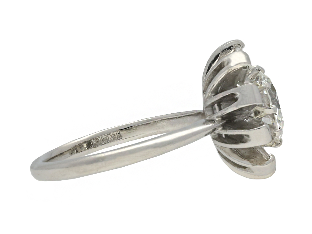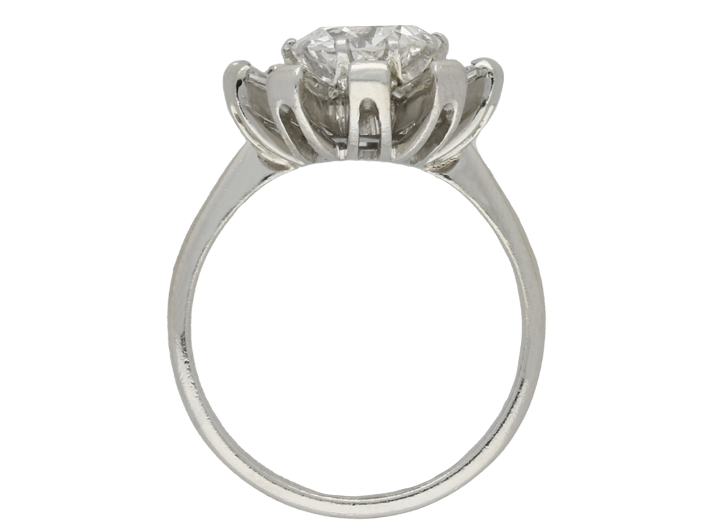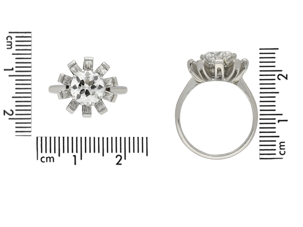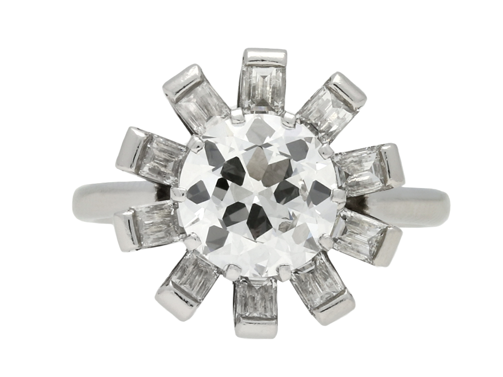 Vintage diamond cluster ring. Set to centre with a single round old cut diamond in an open back claw setting, G colour, SI1 clarity, with an approximate weight of 1.62 carats, encircled by ten rectangular baguette cut diamonds in open back half rubover settings with a combined weight of 1.00 carats. The total approximate diamond weight is 2.62 carats, to a coronet cluster design, featuring linear lines, a curving pierced gallery and open backholing, leading to inwardly tapering shoulders and flowing through to a solid D-shape shank. Marked platinum, circa 1950, accompanied by Gemmological Institute of America (GIA) report #2201048842.