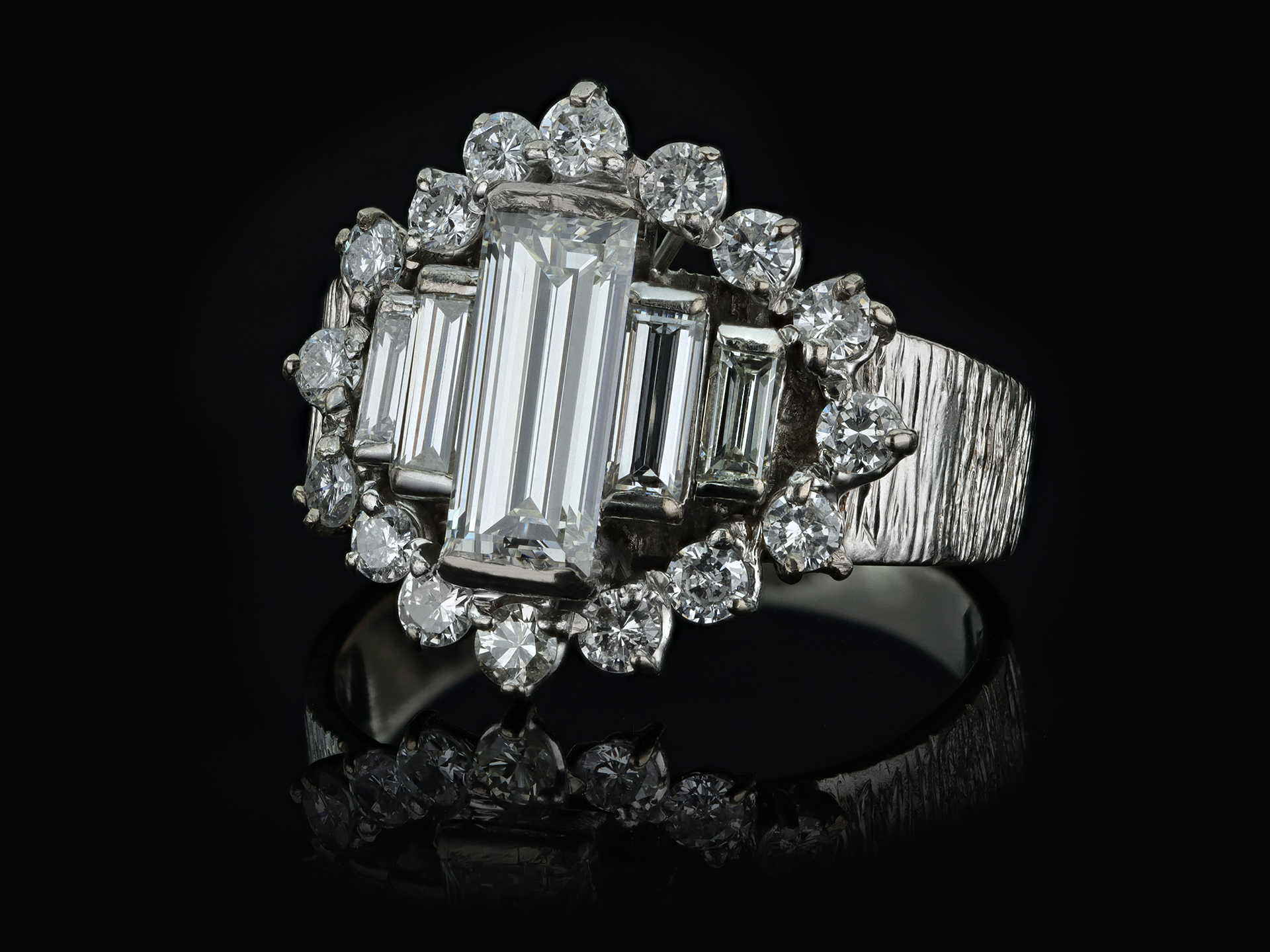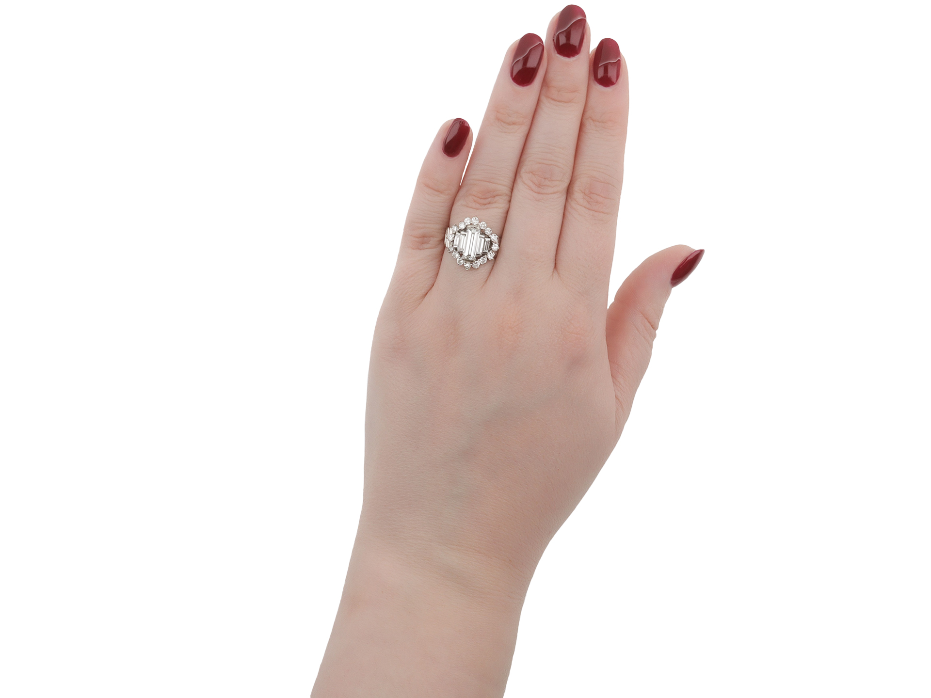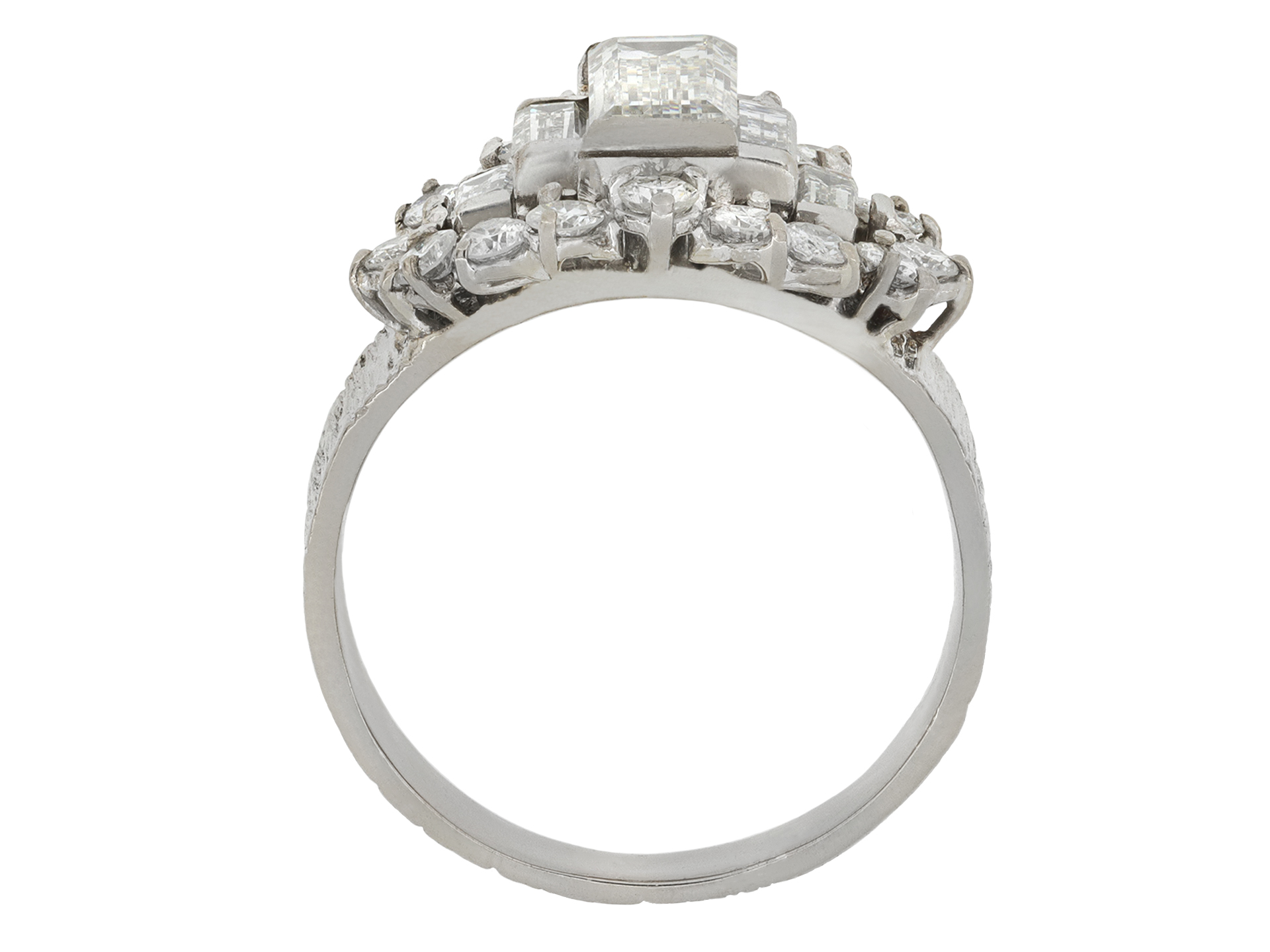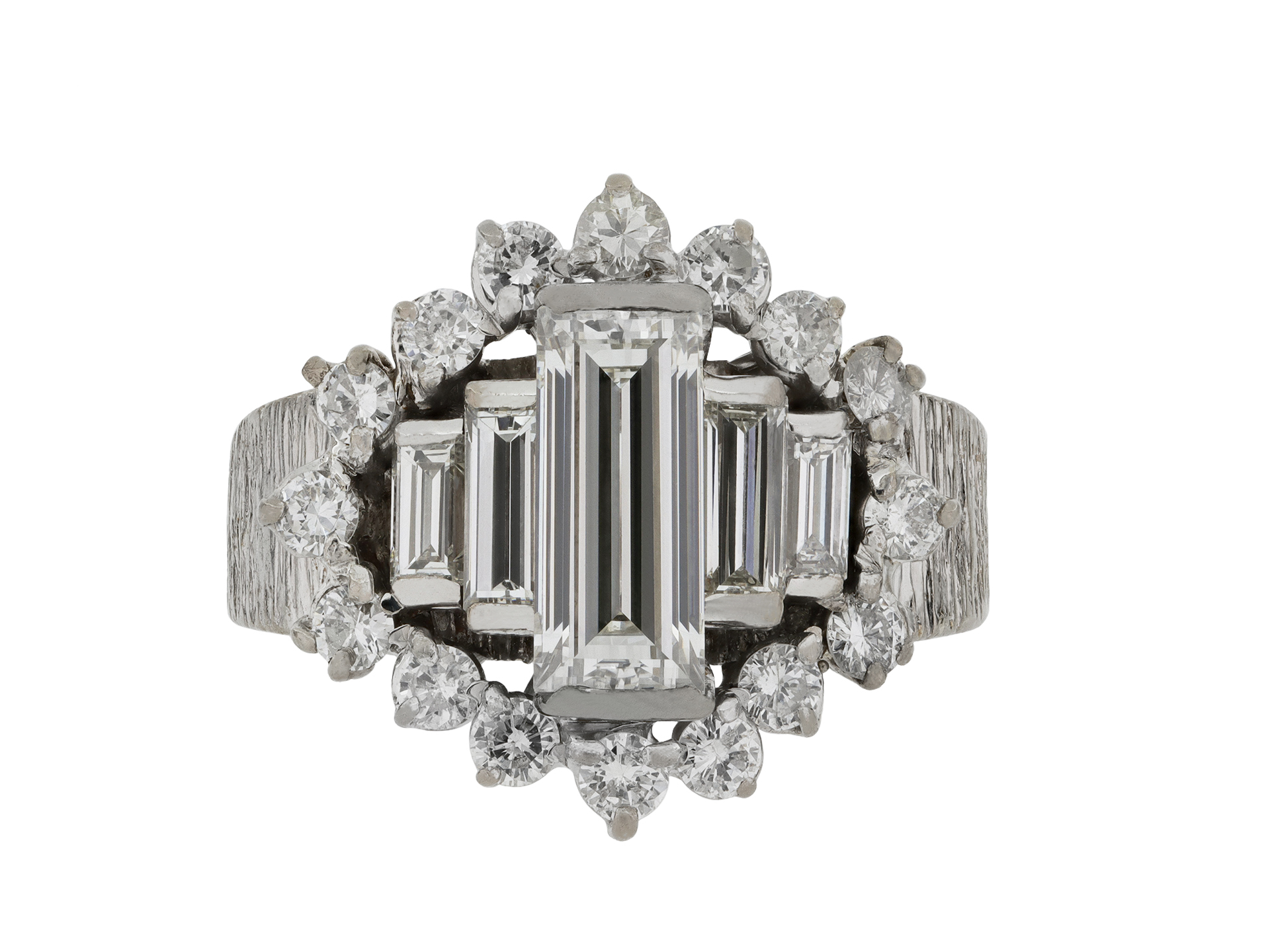 Vintage diamond cluster ring. Vertically set to centre with a rectangular baguette cut diamond in an open back half rubover setting with a approximate weight of 1.00 carats, further set with four stepped rectangular baguette cut diamonds in open back half rubover settings with a combined weight of 0.50 carats, further adorned with an encircling row of sixteen round brilliant cut diamonds in open back claw settings with a combined weight of 0.50 carats. The total approximate diamond weight is 2.00 carats, to an elegant tapered openwork cluster featuring polished borders, a pierced wirework gallery and intricate rectangular open backholing, flanked by trumpeting shoulders flowing through to a textured solid flat shank. Marked 18 carat white gold, circa 1970.