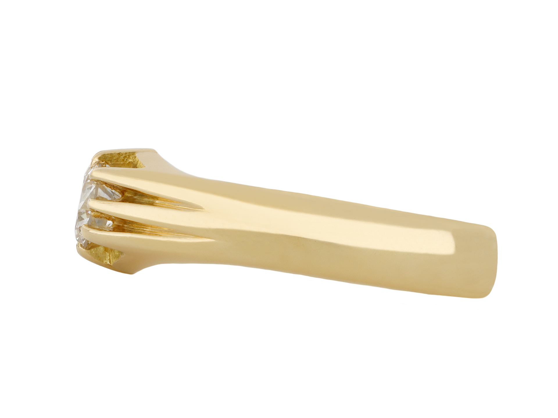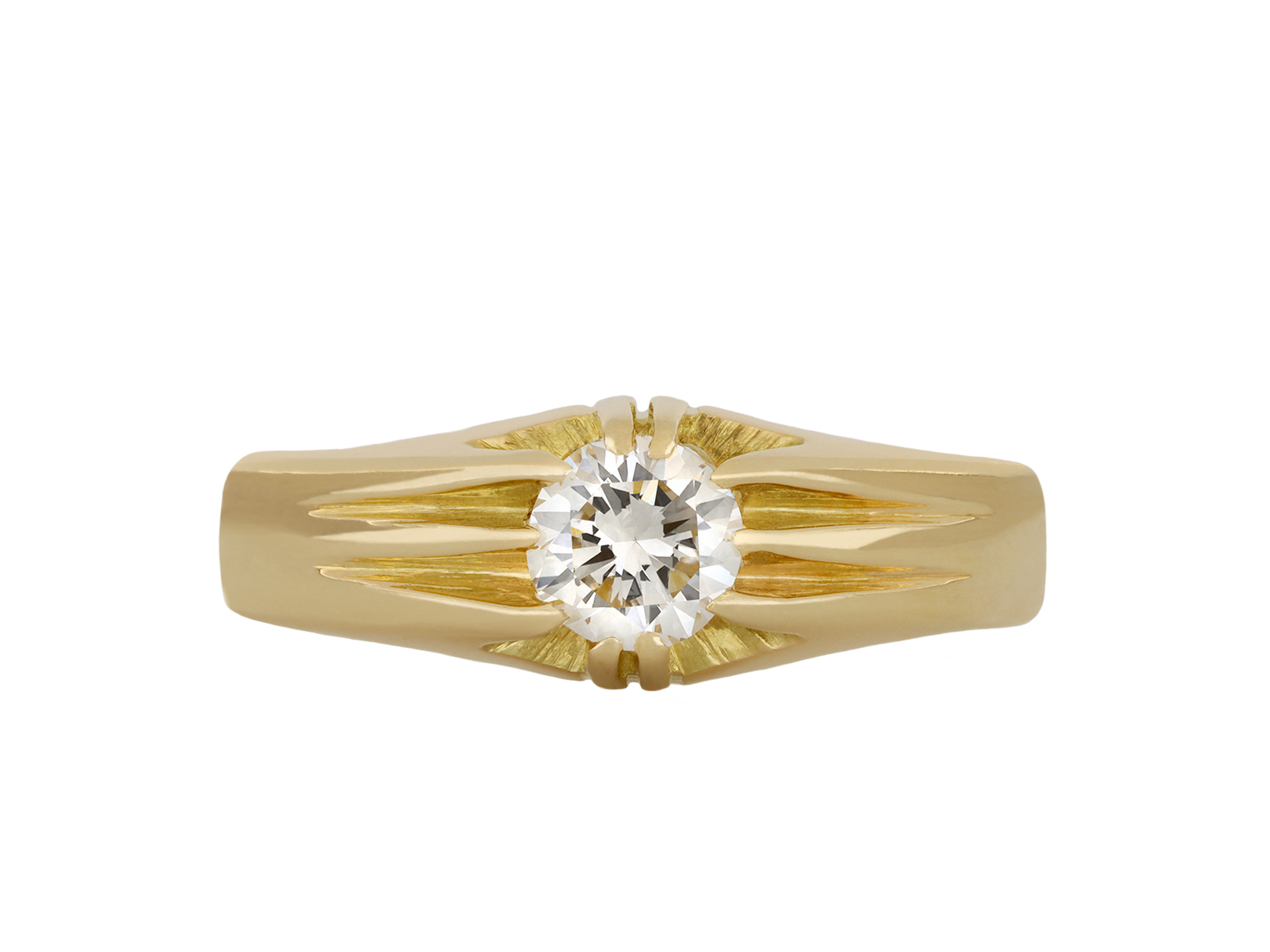Vintage diamond solitaire ring. Set to center with a round transitional cut diamond in an open back claw setting with an approximate weight of 0.65 carats, to a solitaire design with stylised ridged claws, a pierced open gallery and open backholing, the trumpeting shoulders feature decorative ribbed details which flow down to a solid shank. Marked 18 carat yellow gold, circa 1950.