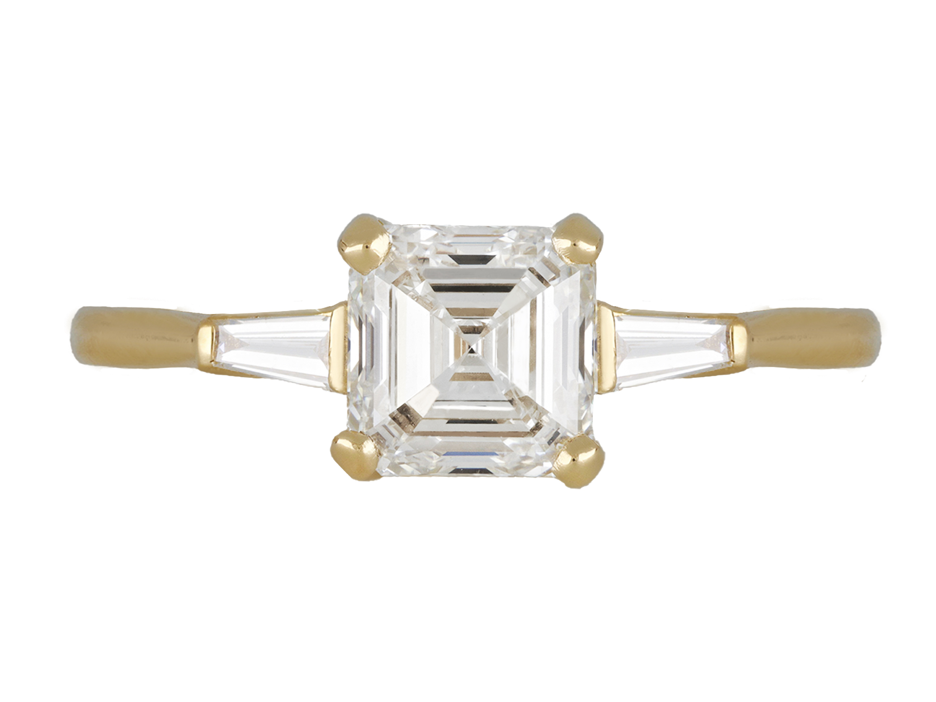 Vintage step-cut diamond flanked solitaire ring. Set to centre with a octagonal step-cut diamond in an open back claw setting, H colour, VVS1 clarity with a weight of 1.40 carats flanked further by two tapered baguette cut diamonds in open back half rubover settings with a combined weight of 0.10 carats, to an impressive flanked solitaire design featuring a linear openwork gallery and fancy open backholing, leading to raised inwardly tapering shoulders that flow through to a solid D-shape shank. Marked 18 carat yellow gold, circa 1960, accompanied with Gemmological Institute of America (GIA) report #6505055254.