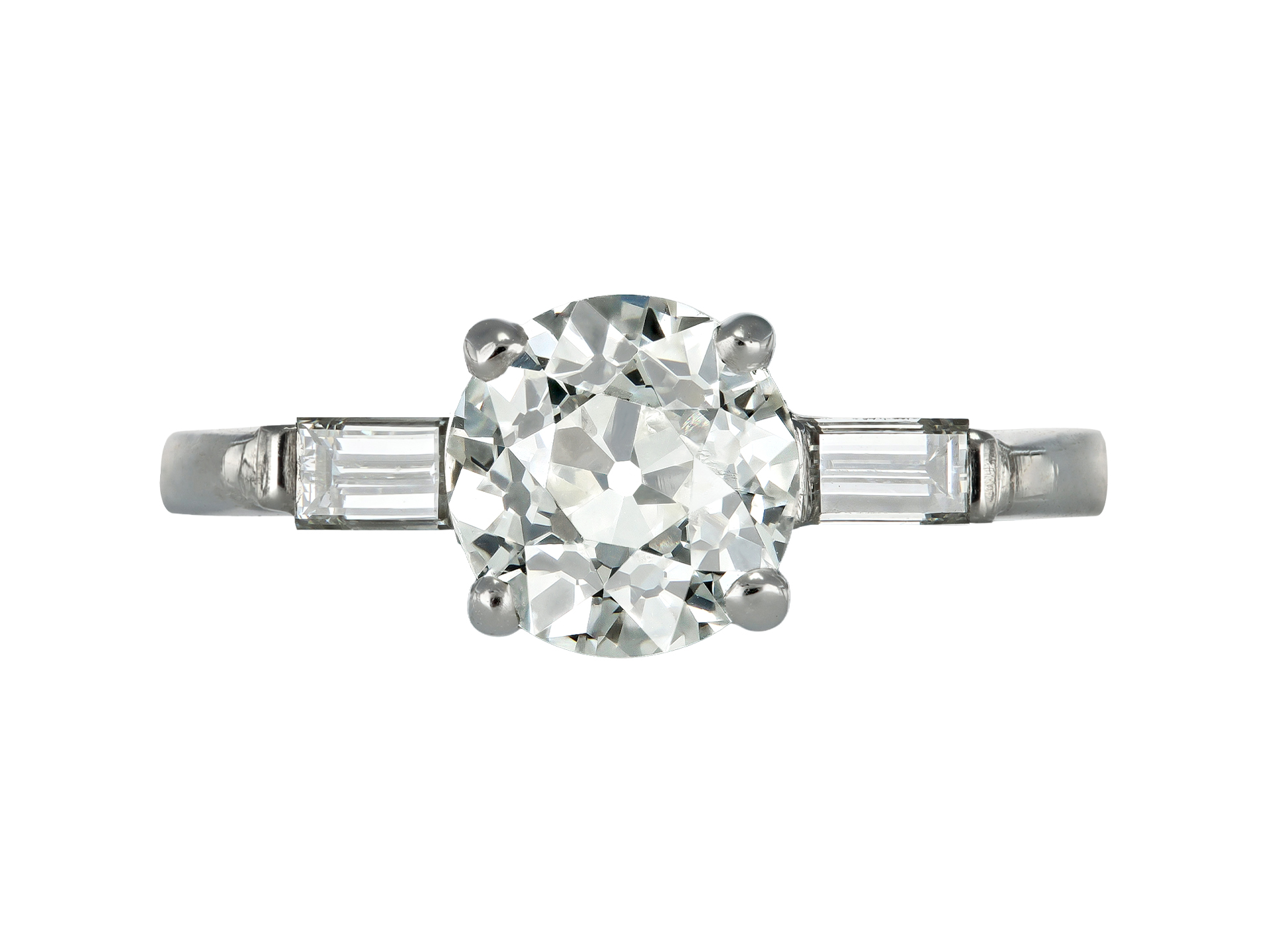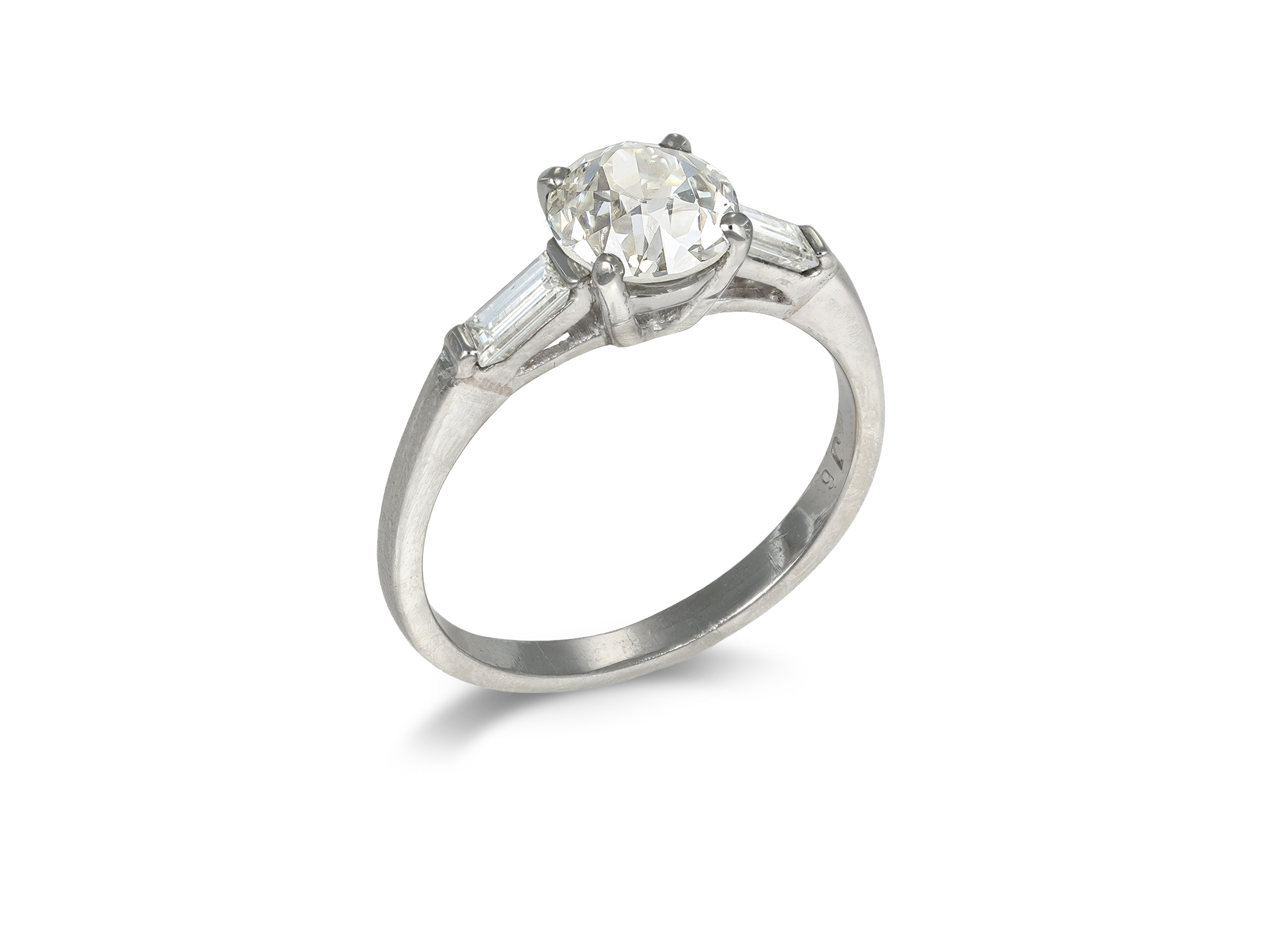 Diamond flanked solitaire diamond ring. Set to centre with a single round old cut diamond, J colour, SI1 clarity, with a weight of 1.32 carats in an open back claw setting, flanked by two rectangular baguette cut diamonds in half rubover settings with a combined weight of 0.20 carats. The total approximate diamond weight is 1.52 carats, to an elegant flanked solitaire design, featuring clean linear lines, a pierced gallery and open backholing, leading to smooth raised shoulders and flowing through to a solid shank. Tested platinum, circa 1950, accompanied by Gemmological Institute of America (GIA) report #2205214822.