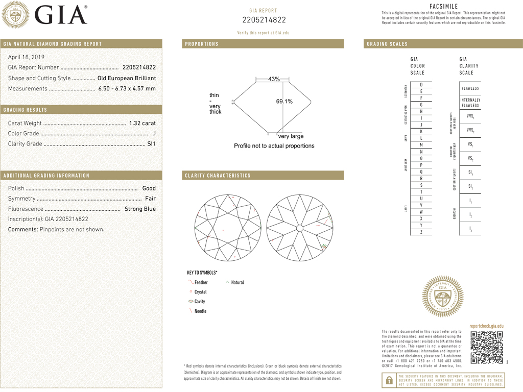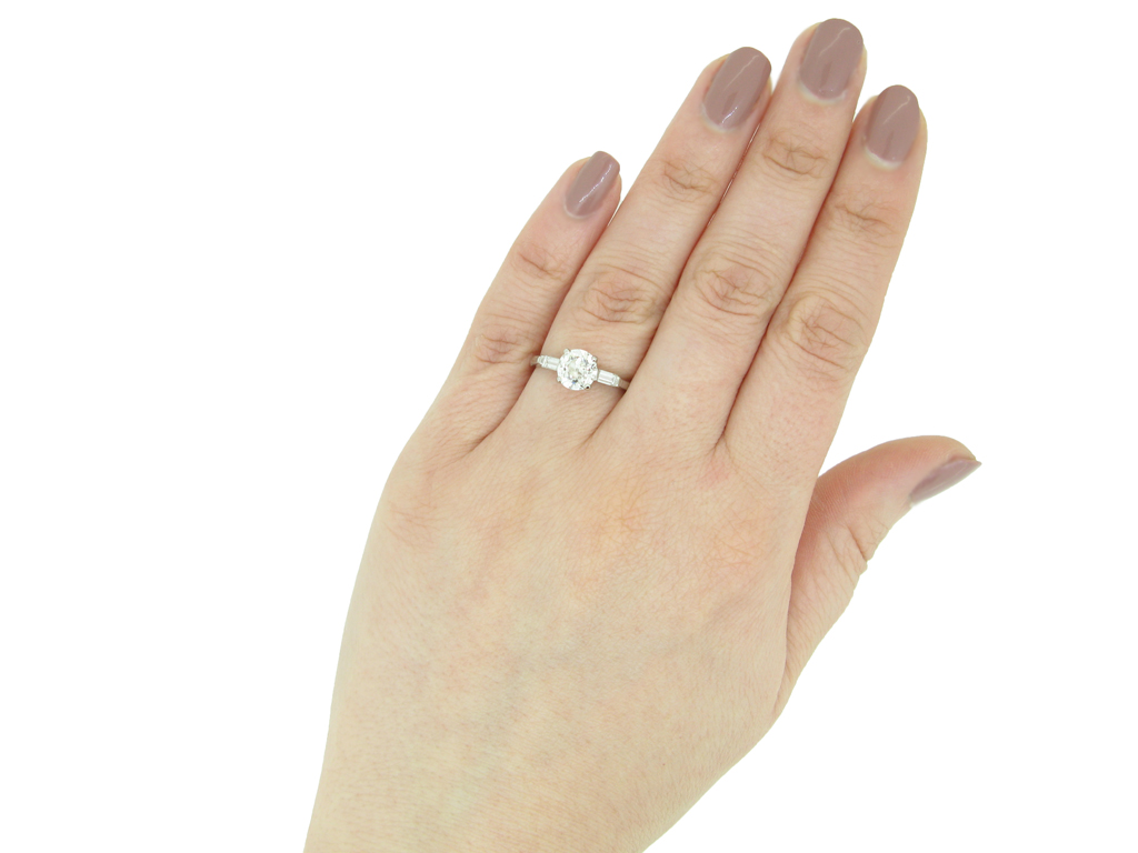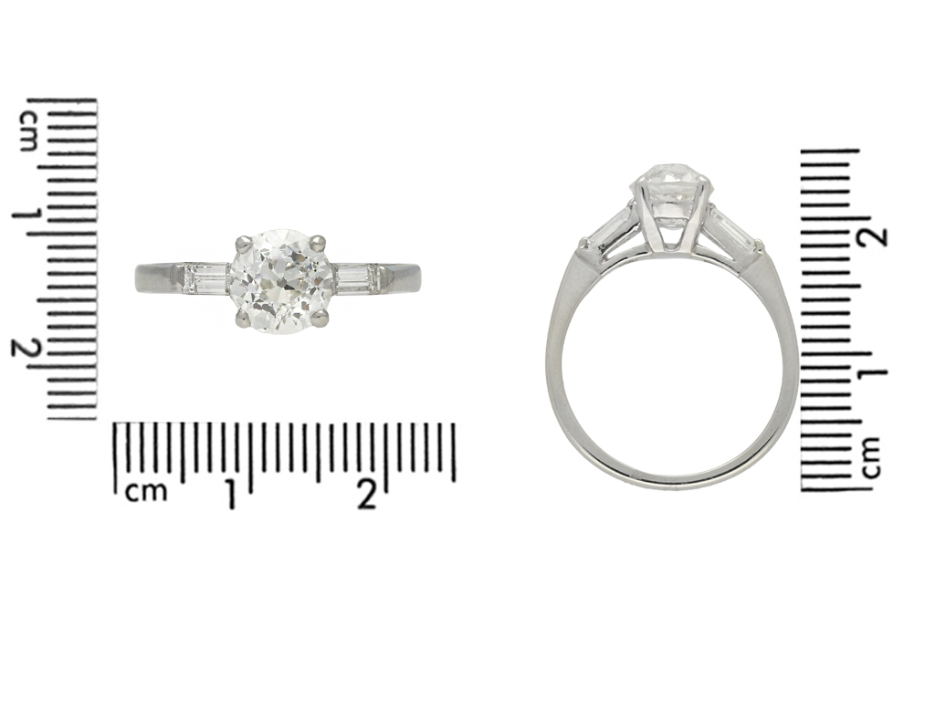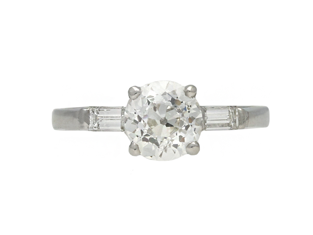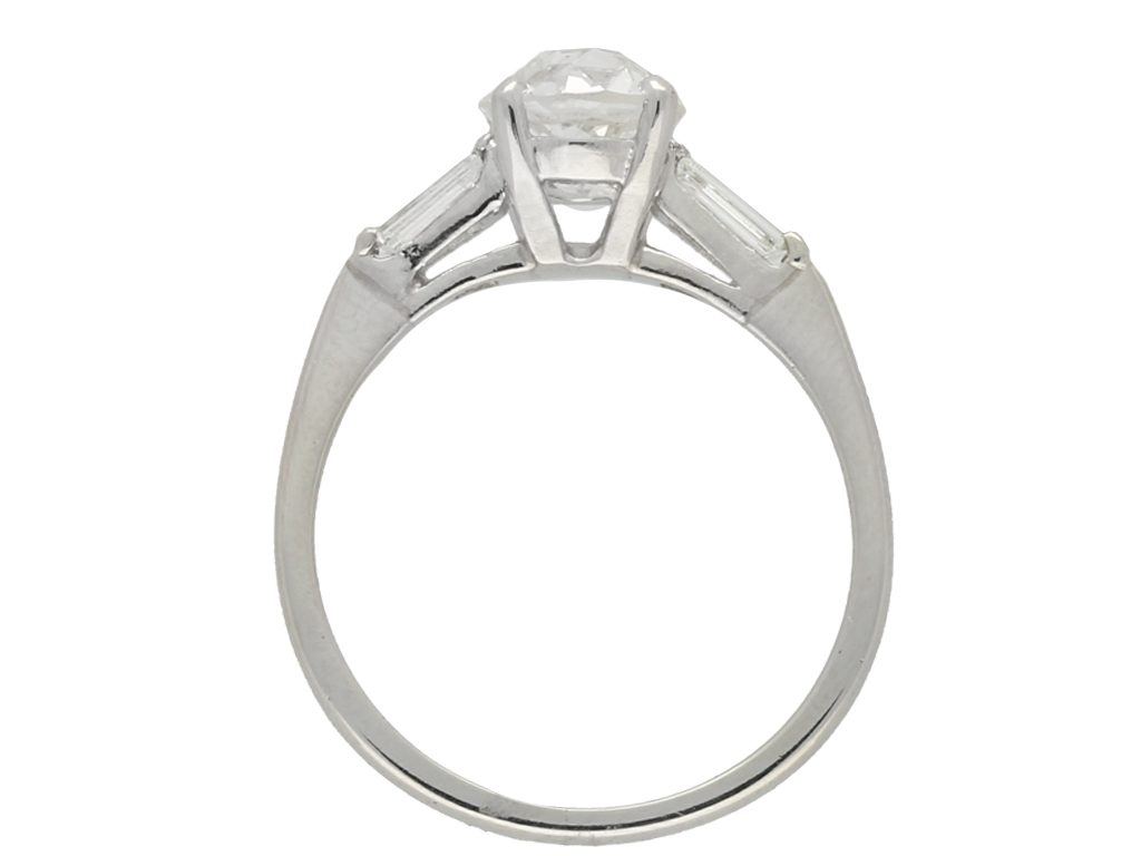 Vintage flanked solitaire diamond ring. Set to centre with a single round old cut diamond, J colour, SI1 clarity, with a weight of 1.32 carats in an open back claw setting, flanked by two rectangular baguette cut diamonds in half rubover settings with a combined weight of 0.20 carats. The total approximate diamond weight is 1.52 carats, to an elegant flanked solitaire design, featuring clean linear lines, a pierced gallery and open backholing, leading to smooth raised shoulders and flowing through to a solid shank. Tested platinum, circa 1950, accompanied by Gemmological Institute of America (GIA) report #2205214822.