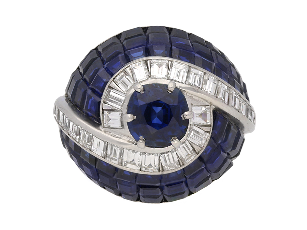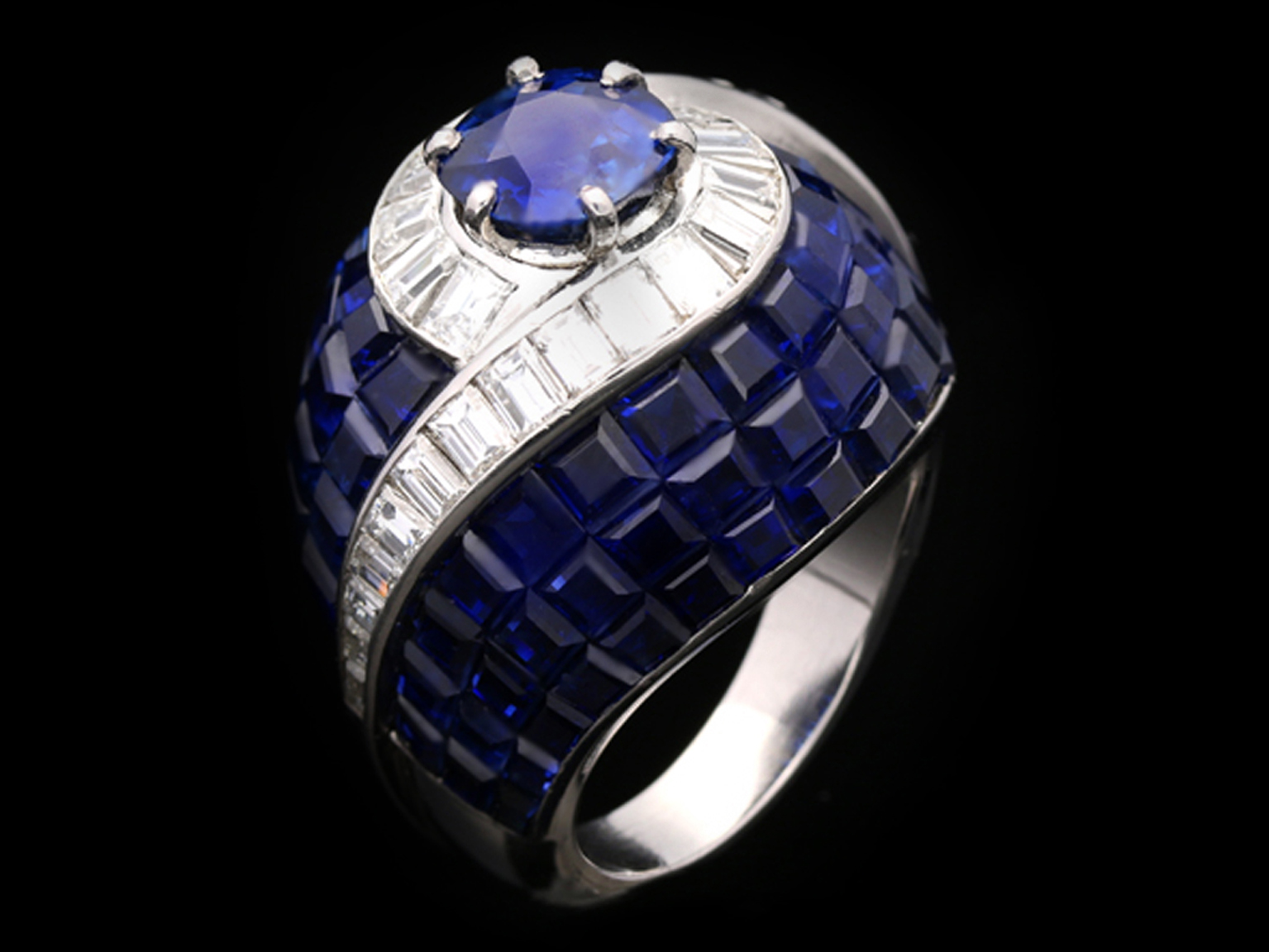 Vintage invisibly set sapphire and diamond ring, circa 1950.
