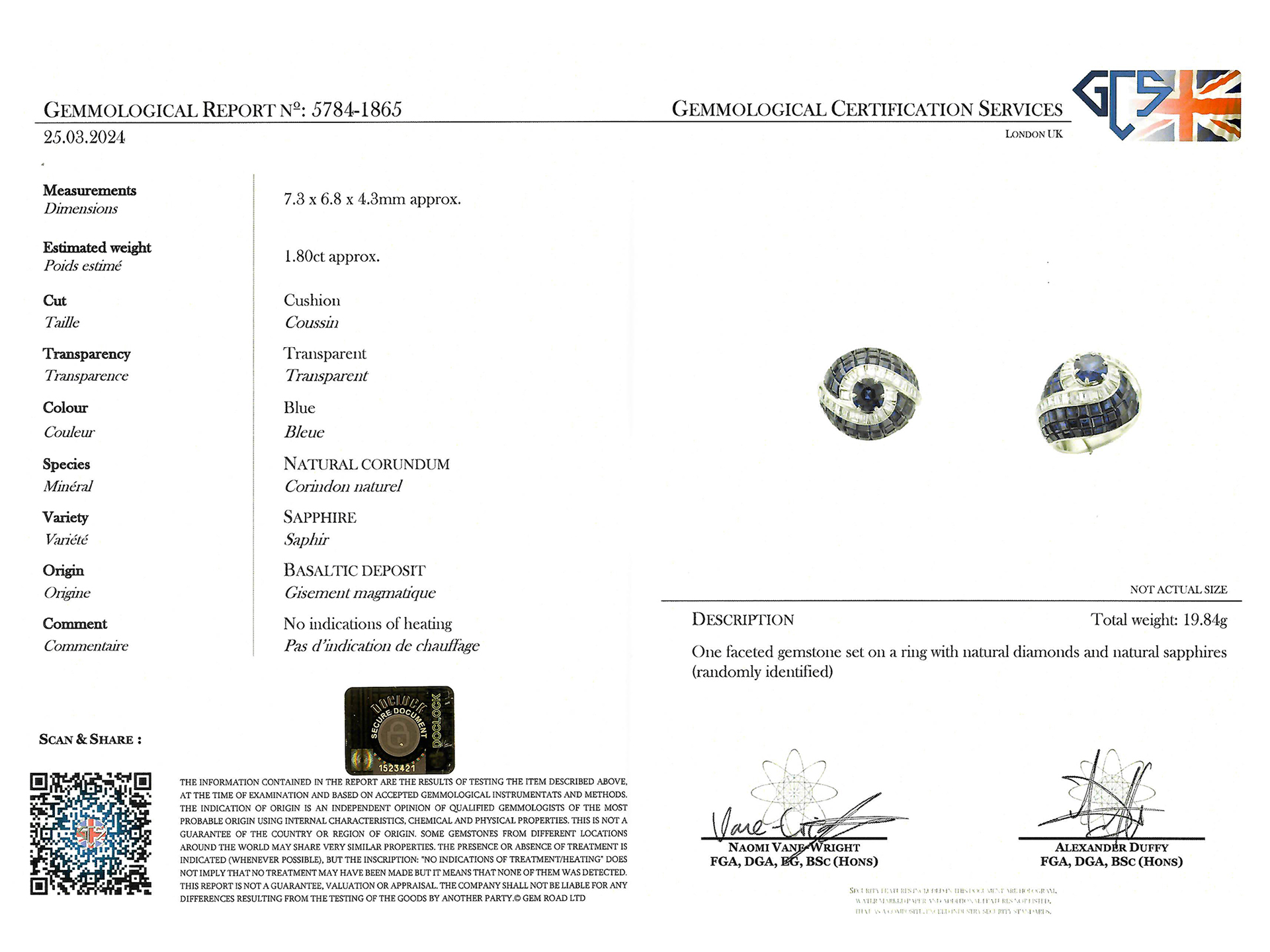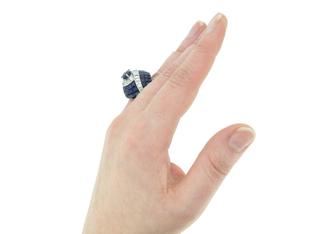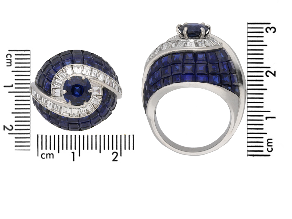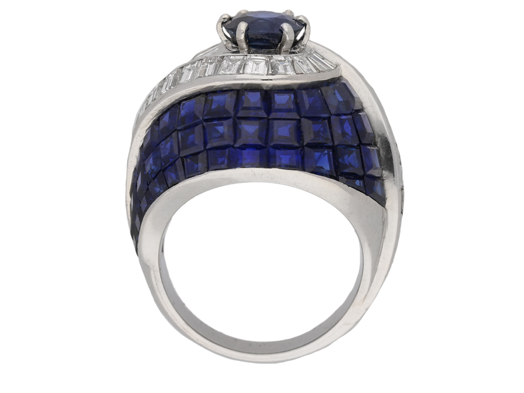 Vintage invisibly set sapphire and diamond ring. Centrally set with a cushion shape old cut natural unenhanced sapphire in an open back claw setting with a weight of 2.00 carats, surrounded by seventy six rectangular baguette cut natural unenhanced sapphires in open back invisible settings with a combined weight of 12.50 carats, the central stone framed by two crossover bands of thirty rectangular baguette cut diamonds in open back channel settings with a combined approximate weight of 2.00 carats. The total approximate sapphire weight is 14.50 carats, to an elegant bombé cluster ring with polished borders and finely pierced backholing, the integrated shoulders smooth down to a solid D-shaped shank. Tested platinum, Gemmological Certification Services report #5784-1865, circa 1950.