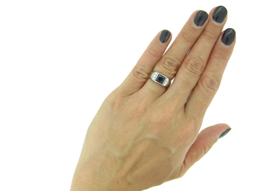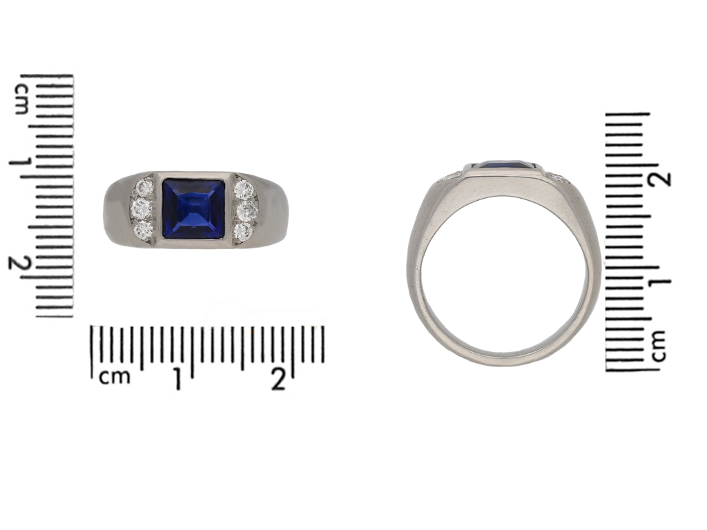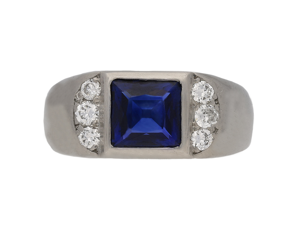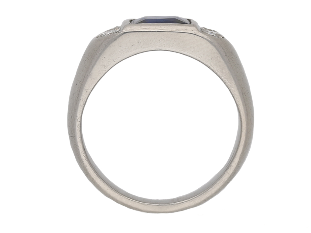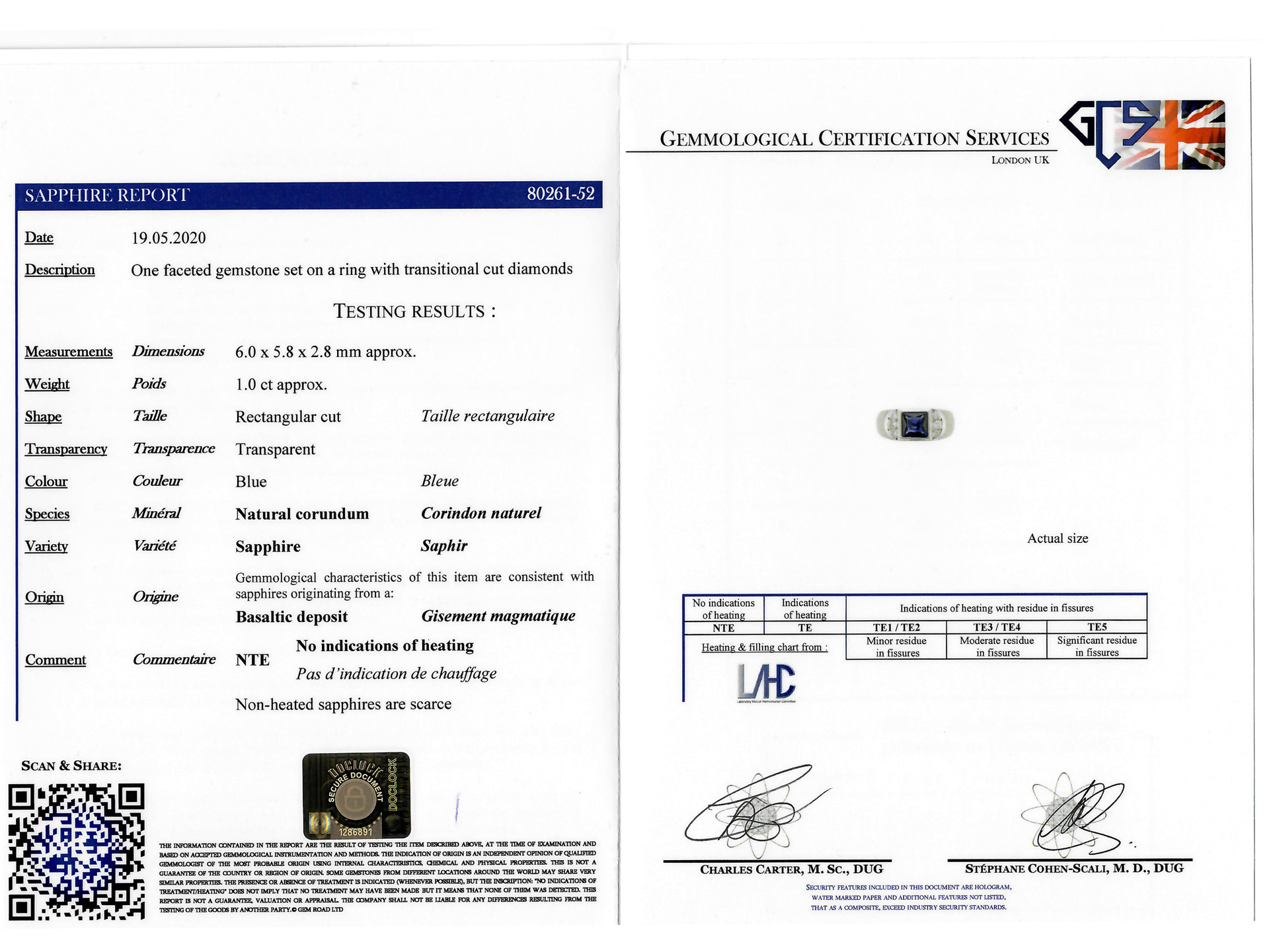 Vintage sapphire and diamond ring. Set to centre with a rectangular star top natural unenhanced sapphire in an open back rubover setting with an approximate weight of 1.00 carats, accompanied by six round old cut diamonds in open back grain settings with a combined approximate weight of 0.24 carats, to a stylish linear flanked solitaire design featuring polished edges, a smooth gallery and geometric open backholing, leading to integrated broad trumpeting shoulders and flowing through to a heavy D-shape shank. Tested platinum, circa 1950, accompanied by Gemmological Certification Services report #80261-52.