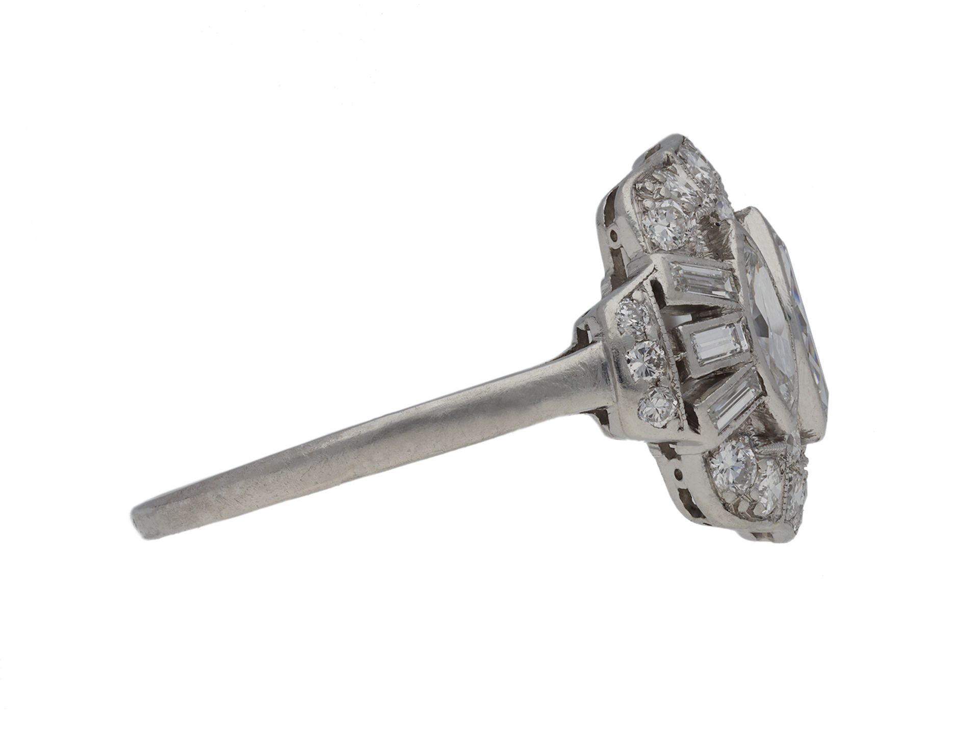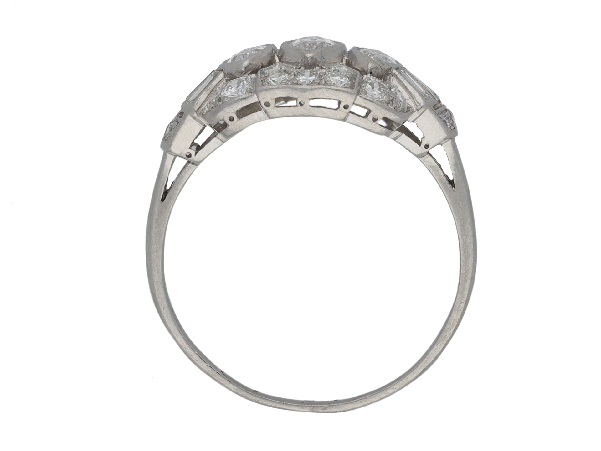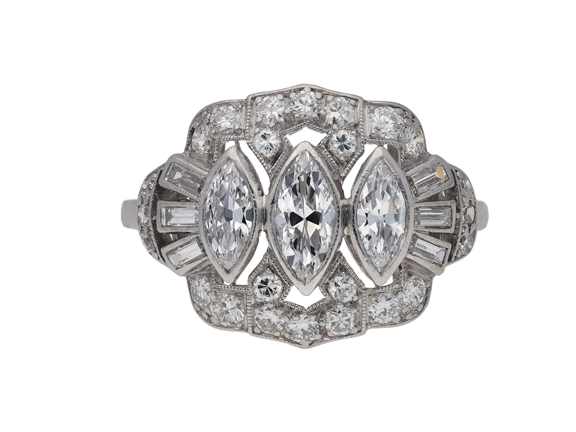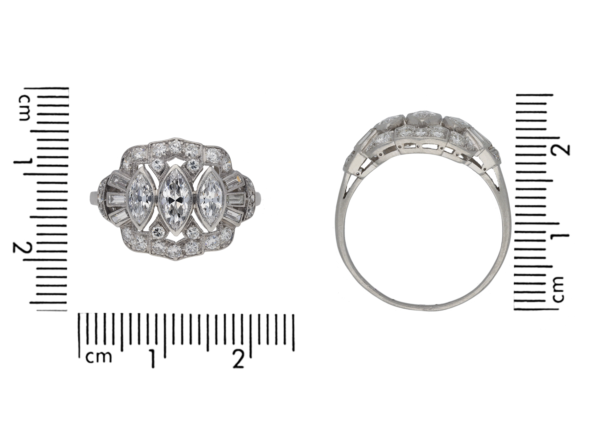 Vintage marquise diamond cluster ring. Set to centre with three marquise shape old cut diamonds in open back rubover settings with a combined approximate weight of 0.80 carats, further set with six rectangular baguette cut diamonds in open back rubover settings with a combined weight of 0.30 carats, and further adorned with twenty four round brilliant cut diamonds in open back grain settings with a combined weight of 0.72 carats. The total approximate diamond weight is 1.82 carats, to an elegant openwork cluster featuring millegrain edging, an intricately pierced gallery and fancy open backholing, flanked by trumpeting split shoulders and flowing through to a solid tapered shank. Marked platinum and iridium, American, circa 1950.
