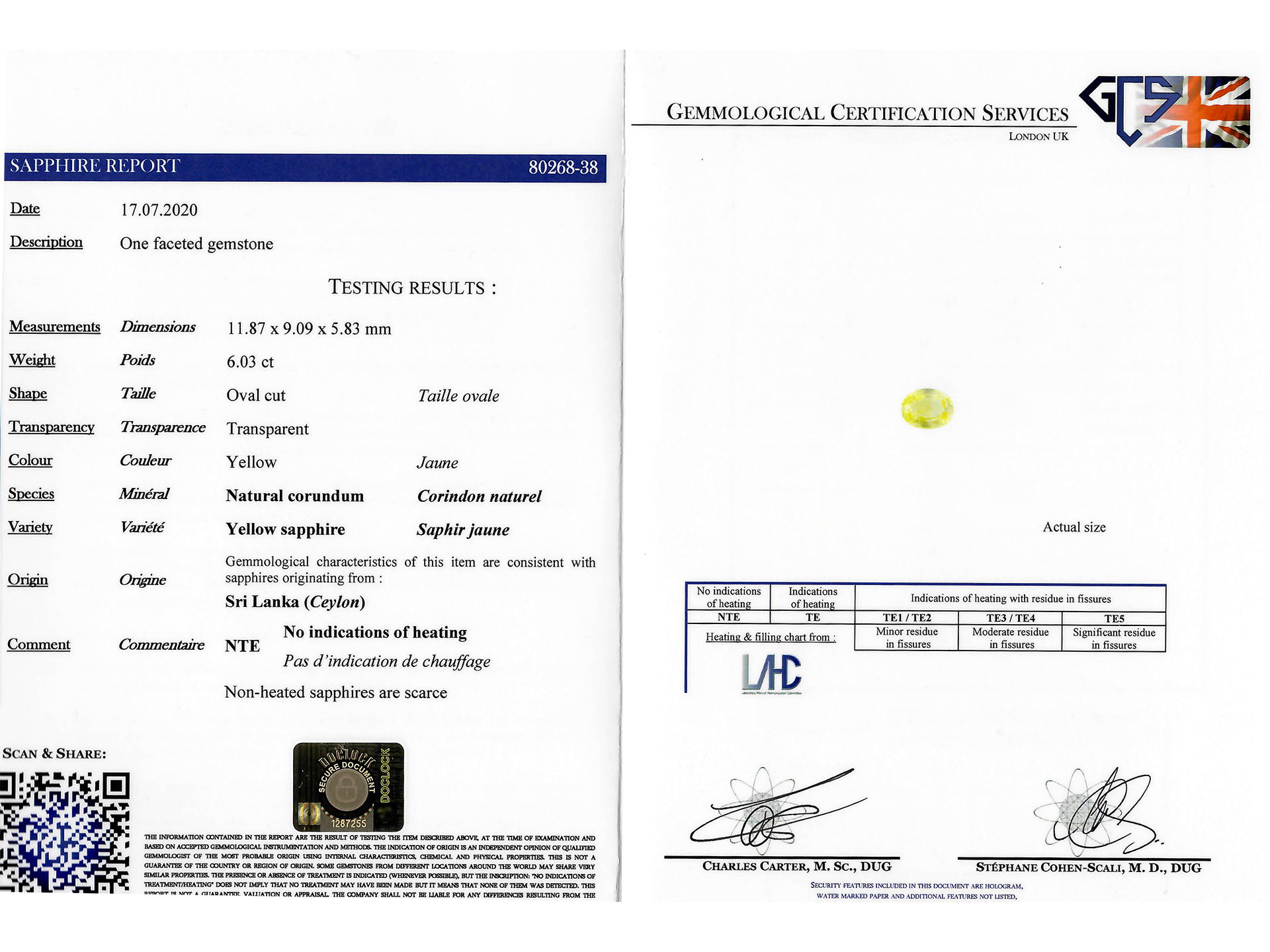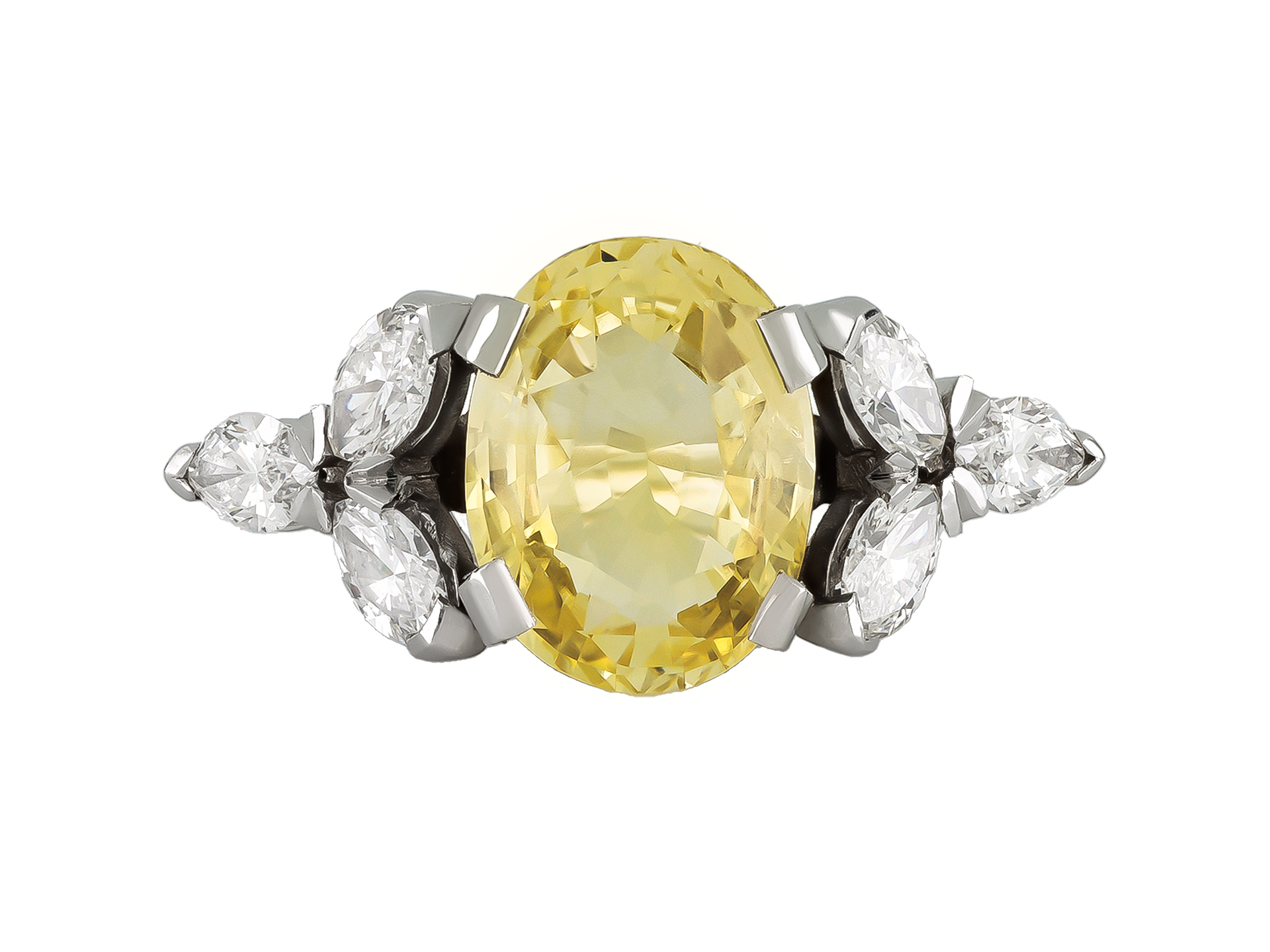 Vintage yellow Ceylon sapphire and diamond ring. Centrally set with an oval old cut natural unenhanced yellow Ceylon sapphire in an open back claw setting with a weight of 6.03 carats, flanked by six marquise shape brilliant cut diamonds in open back claw settings with a combined approximate weight of 0.72 carats, to an impressive flanked solitaire featuring curving claws, polished edging, an intricately pierced gallery and fancy open backholing, the tapering shoulders flowing to a solid D-shape shank. Marked platinum, numbered '206', circa 1960, accompanied by Gemmological Certification Services report #80268-38.