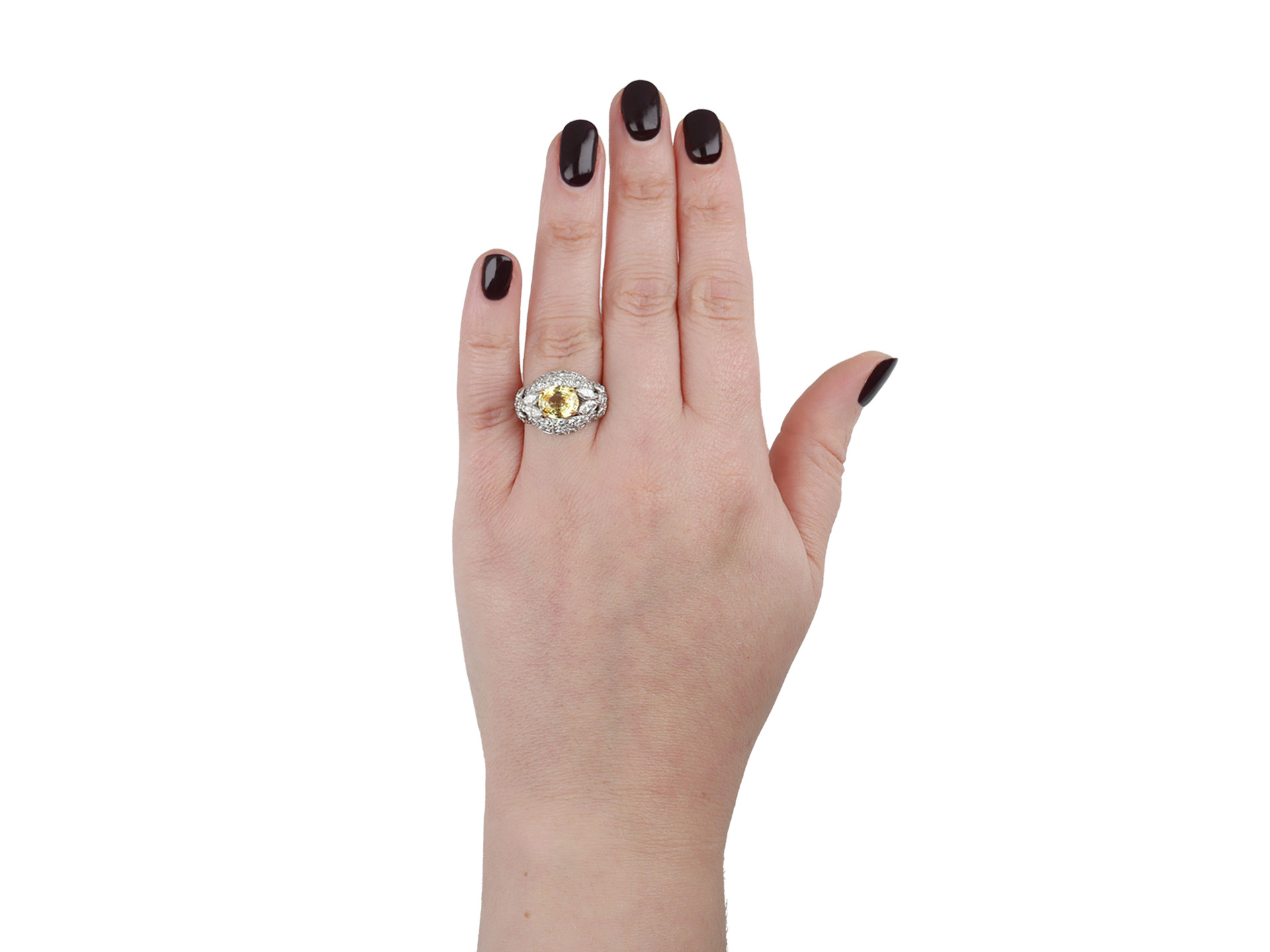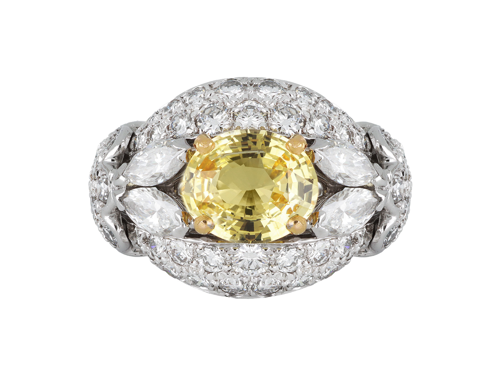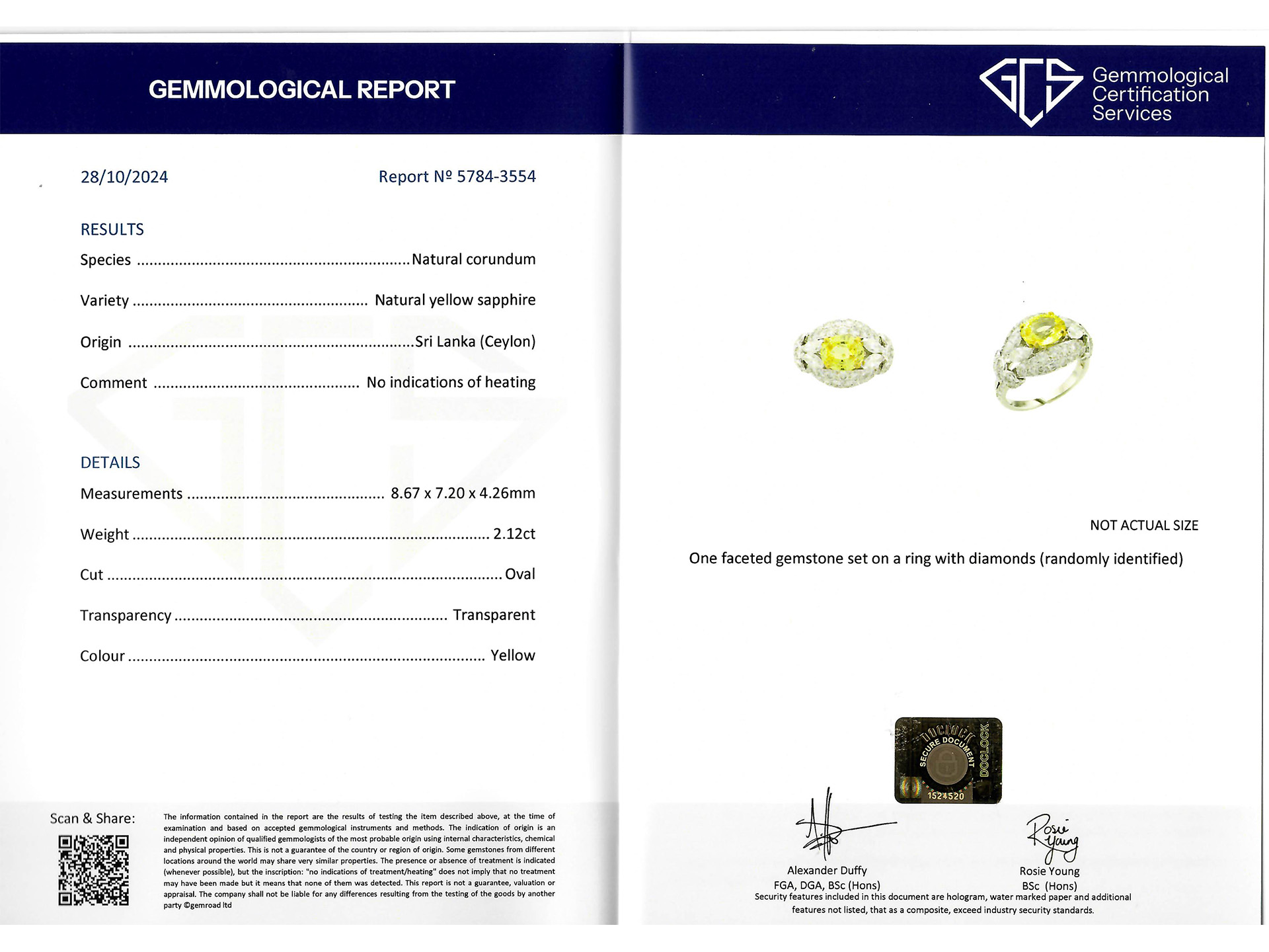 Yellow Ceylon sapphire and diamond cluster ring. Set to centre with an oval brilliant cut natural unenhanced yellow Ceylon sapphire in an open back claw setting with a weight of 2.12 carats, further set with four marquise shape brilliant cut diamonds in open back claw settings with a combined approximate weight of 0.60 and decorated with seventy-two round brilliant cut diamonds in open back grain settings with a combined weight of 1.50 carats. The total approximate diamond weight is 2.10 carats, to an impressive bombe cluster design featuring openwork details with polished edges, a linear pierced gallery and fancy shape open backholing, leading to split shoulders and flowing through to a solid D-shape shank. Marked 18 carat white gold, French, circa 1970, accompanied by Gemmological Certification Services report #5784-3554.