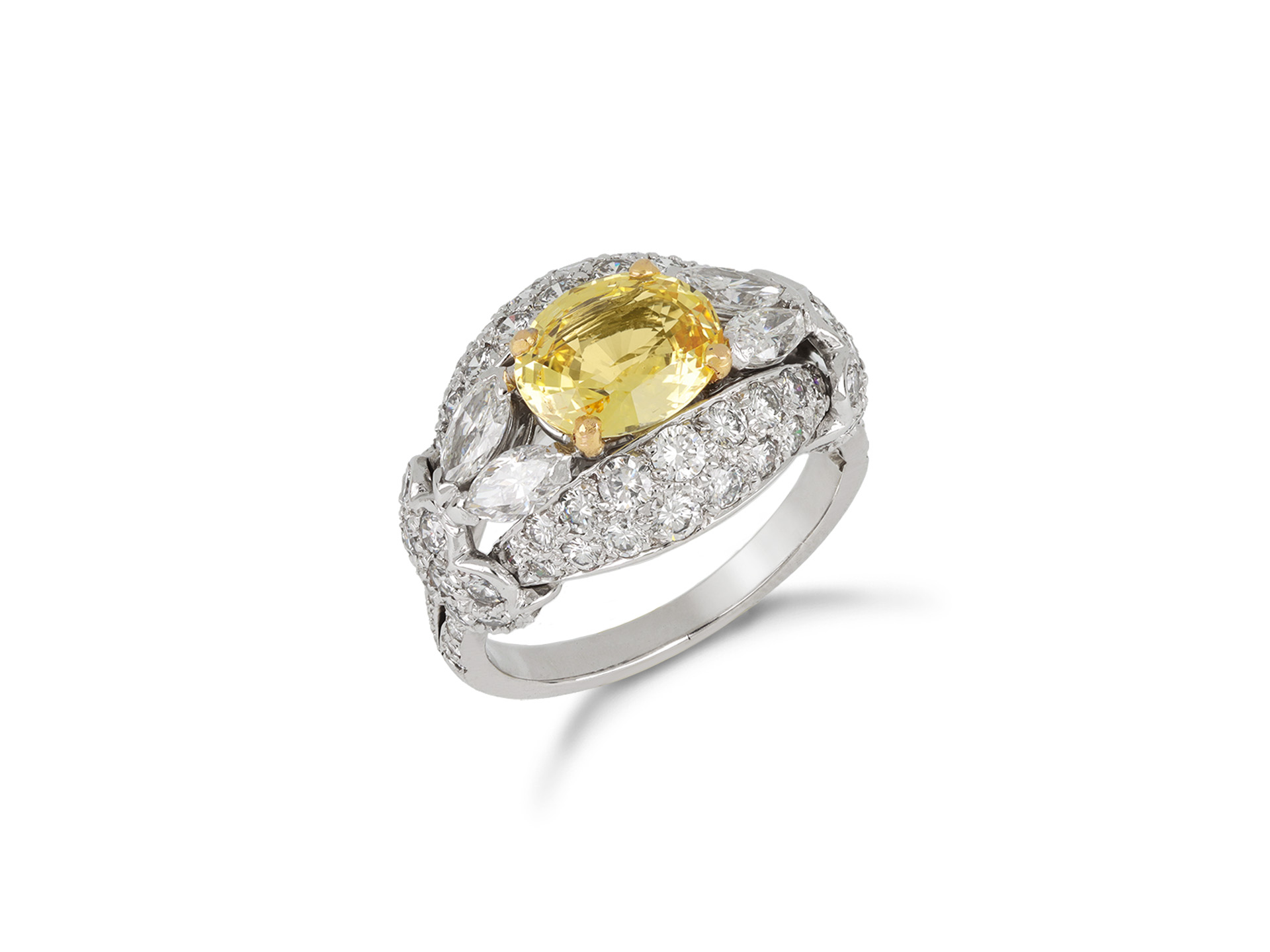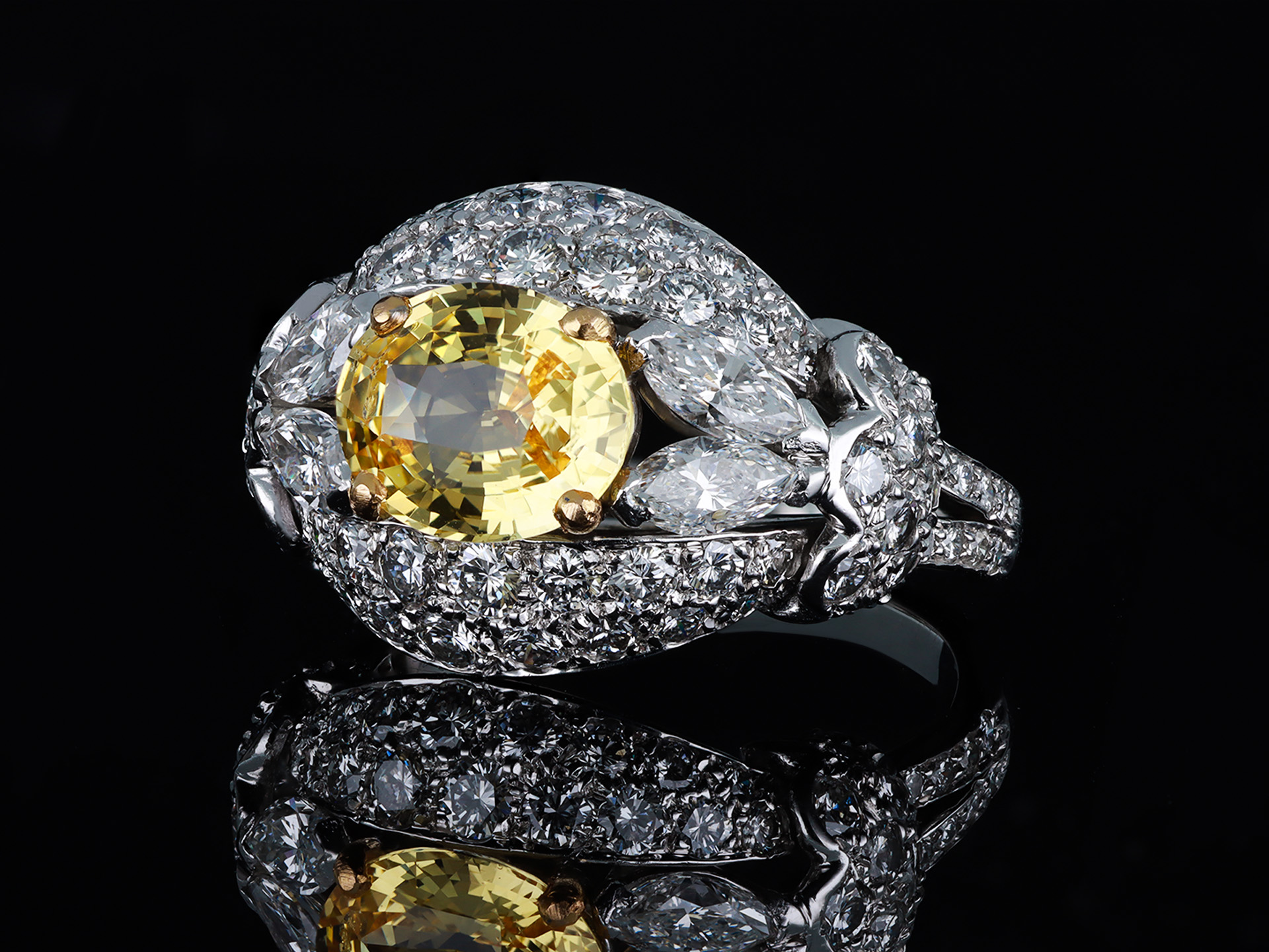 Gemstone Ceylon Yellow Sapphire, Brilliant Cut, 2.12ct 4 x Diamonds, Marquise shape, approximately 0.6ct total 72 x Diamonds, Brilliant Cut, approximately 1.5ct total