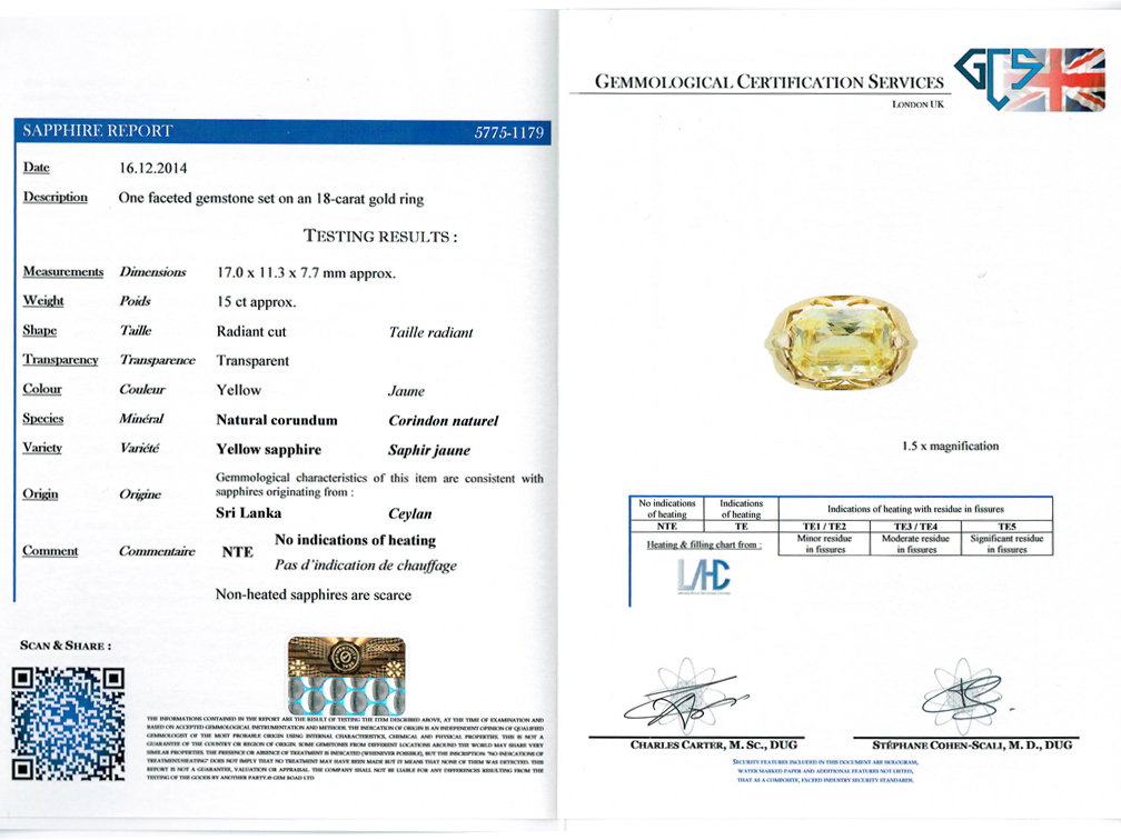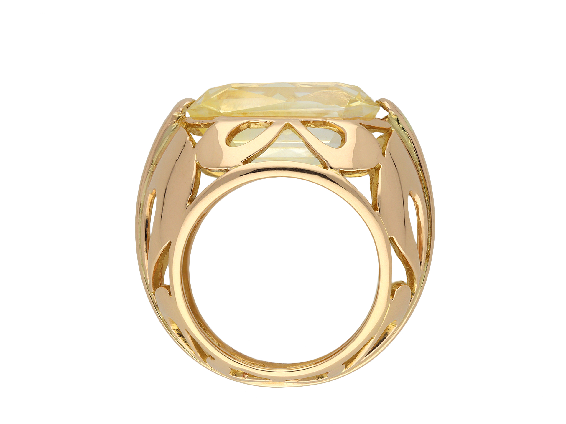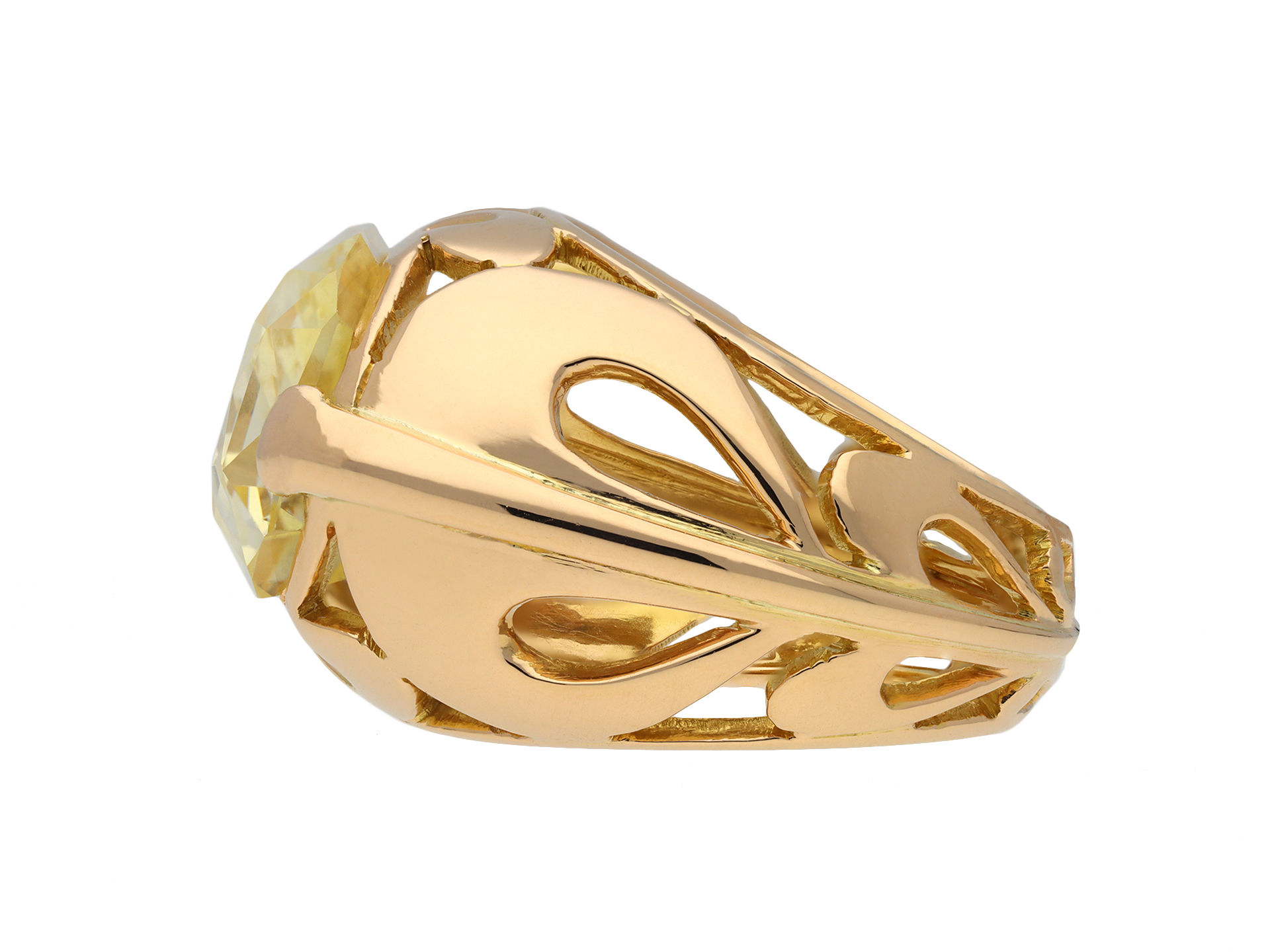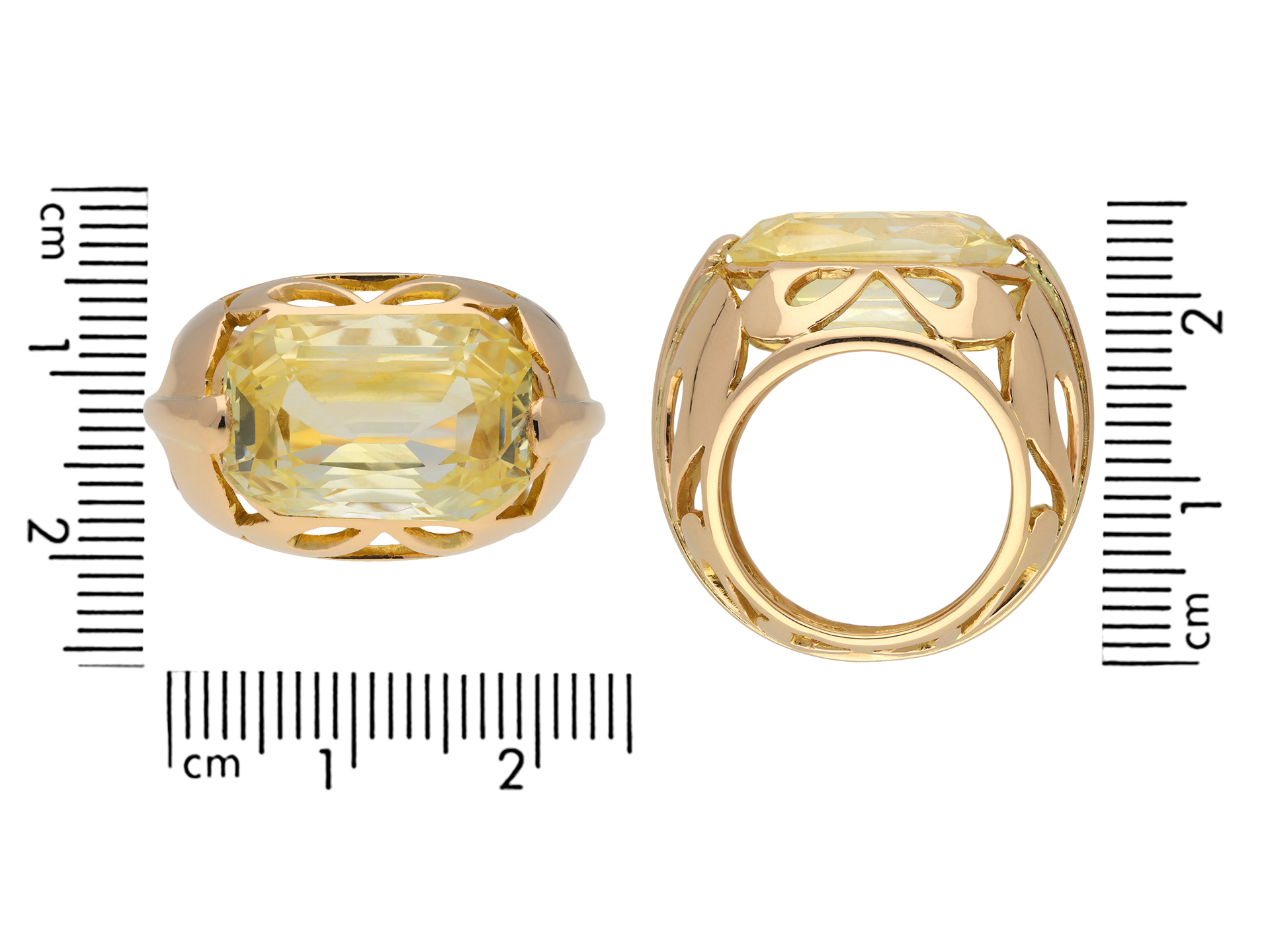 Yellow Ceylon sapphire ring. Set with one large octagonal scissor cut natural unenhanced yellow Ceylon sapphire in an open back claw setting with an approximate weight of 15.00 carats, to a bombé design featuring a pierced gallery, shaped backholing and open stylized shoulders which continue down to an open work shank. Tested 18 carat rose gold, circa 1950, accompanied by Gemmological Certification Services report #5775-1179.