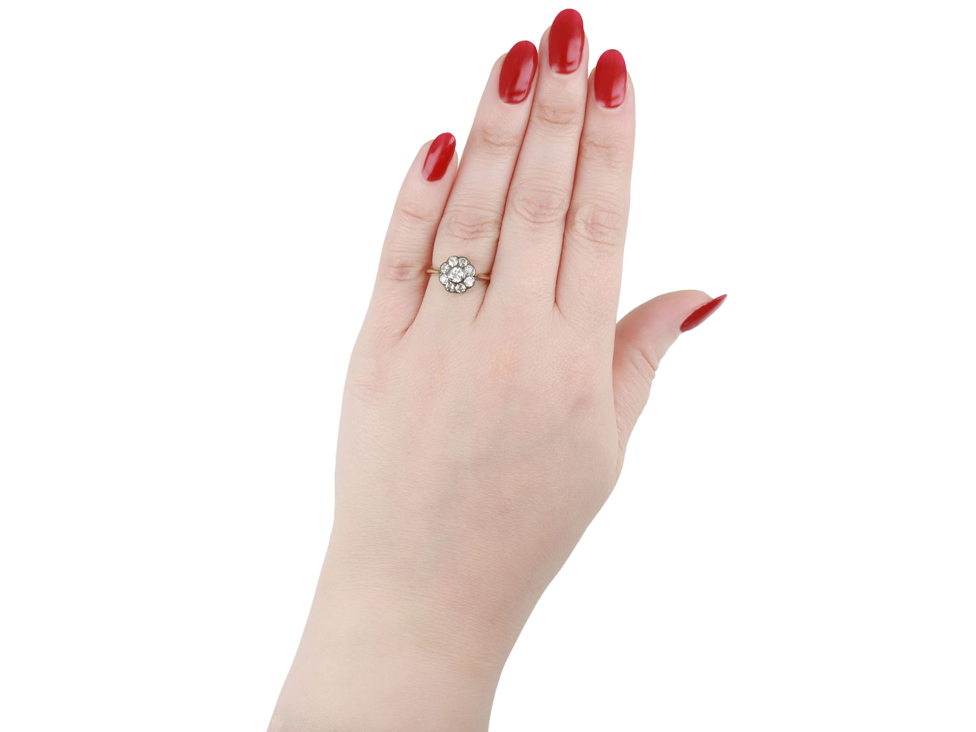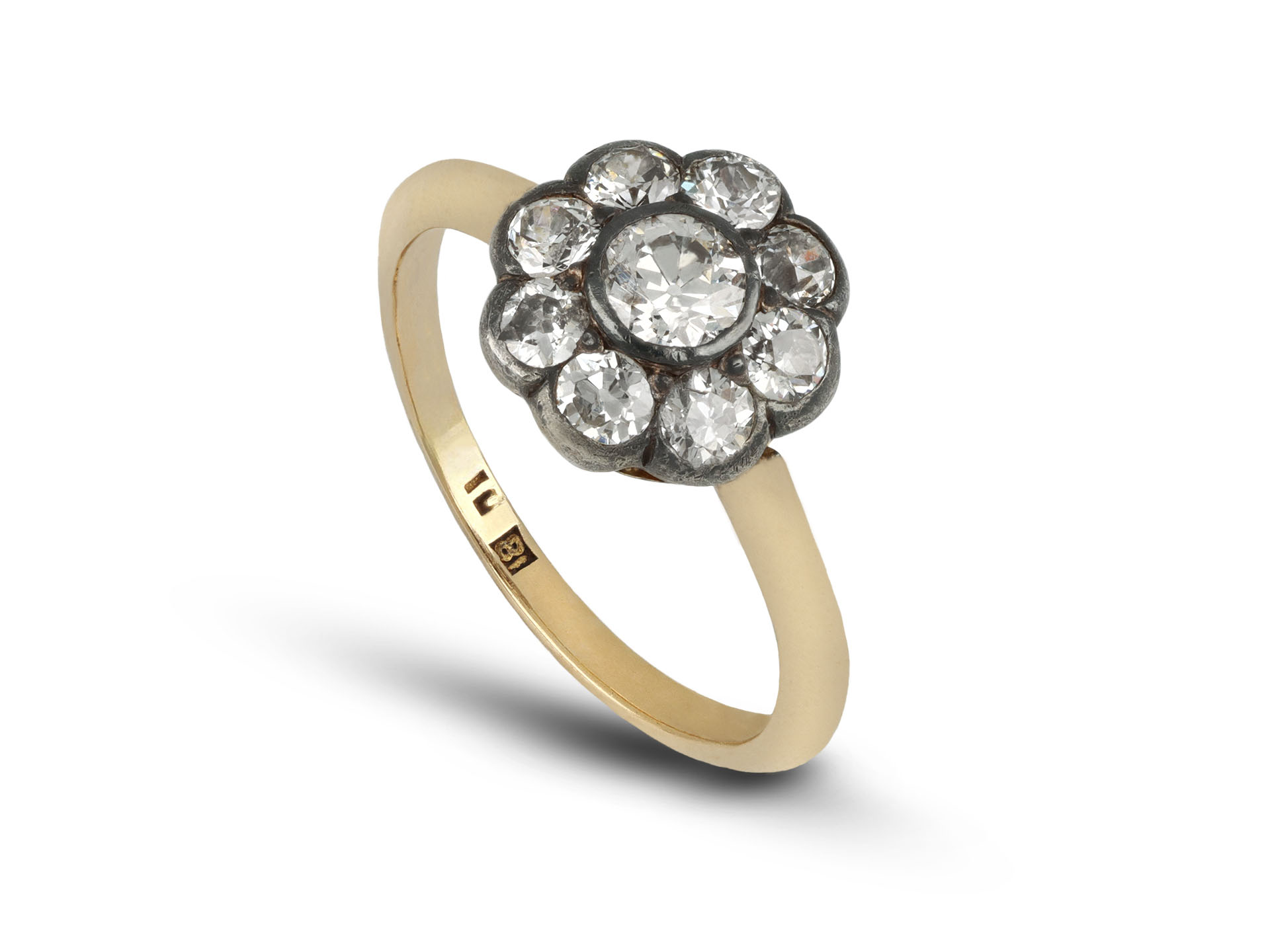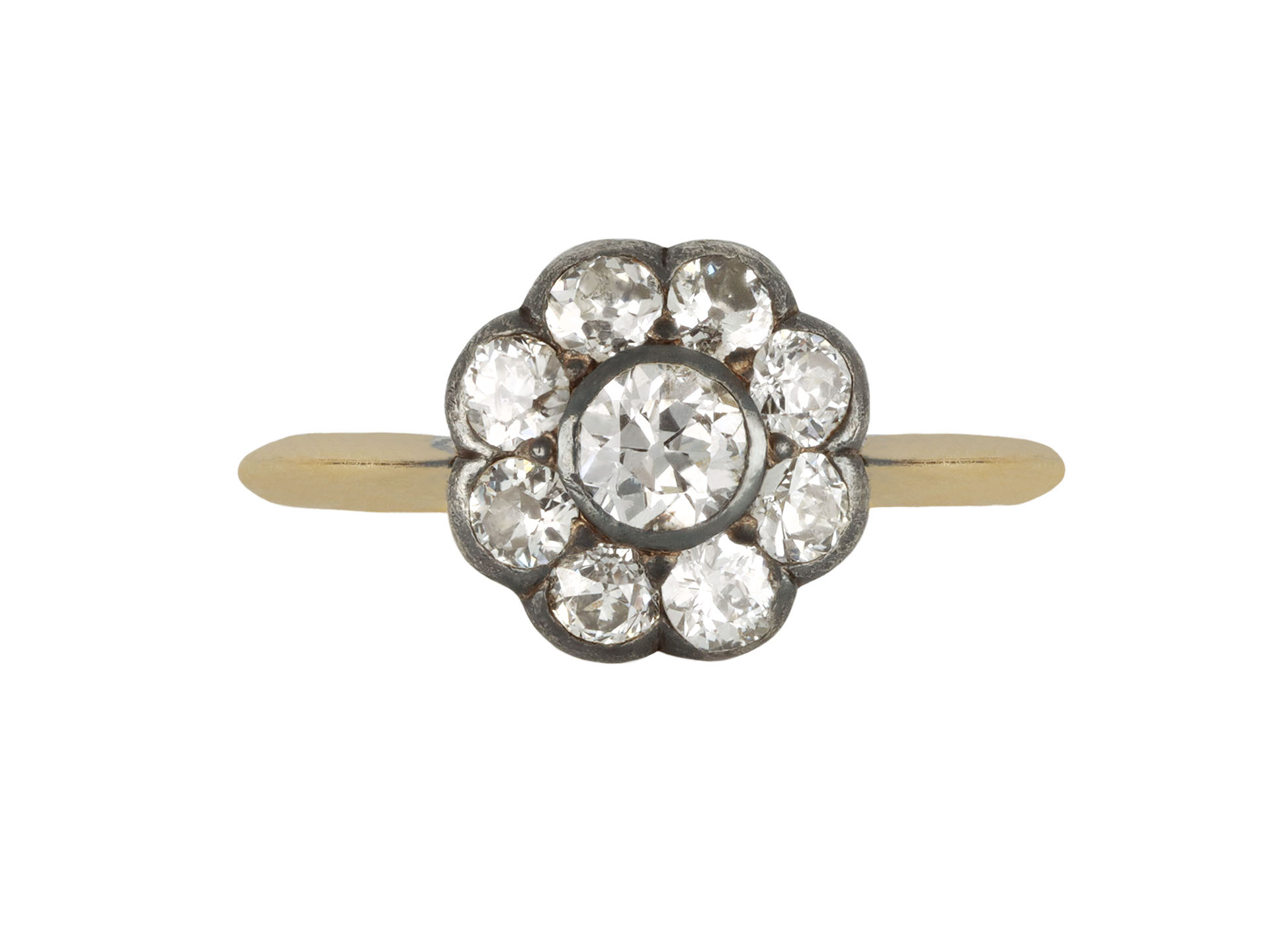 Antique diamond coronet cluster ring. Set to the centre with a round old cut diamond in an open back rubover setting with an approximate weight of 0.25 carats, surrounded by eight round old diamonds in open back rubover settings with a combined weight of 0.60 carats. The total approximate diamond weight is 0.85 carats, to an elegant flora form cluster with polished scalloped edging, an intricately pierced gallery and circular open backholing, the raised inwardly tapering shoulders flow through to a solid D-shape shank. Tested yellow gold, and silver settings, indistinct hallmarks, circa 1900.