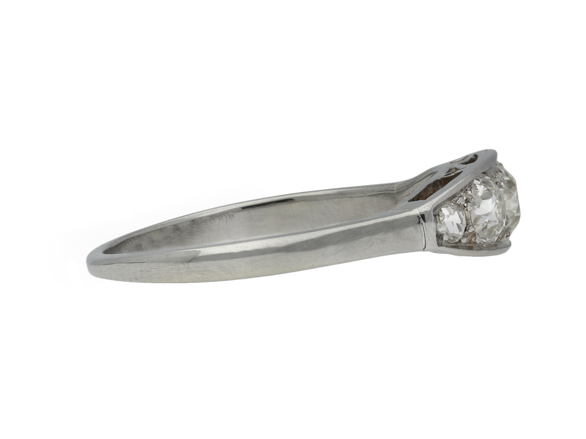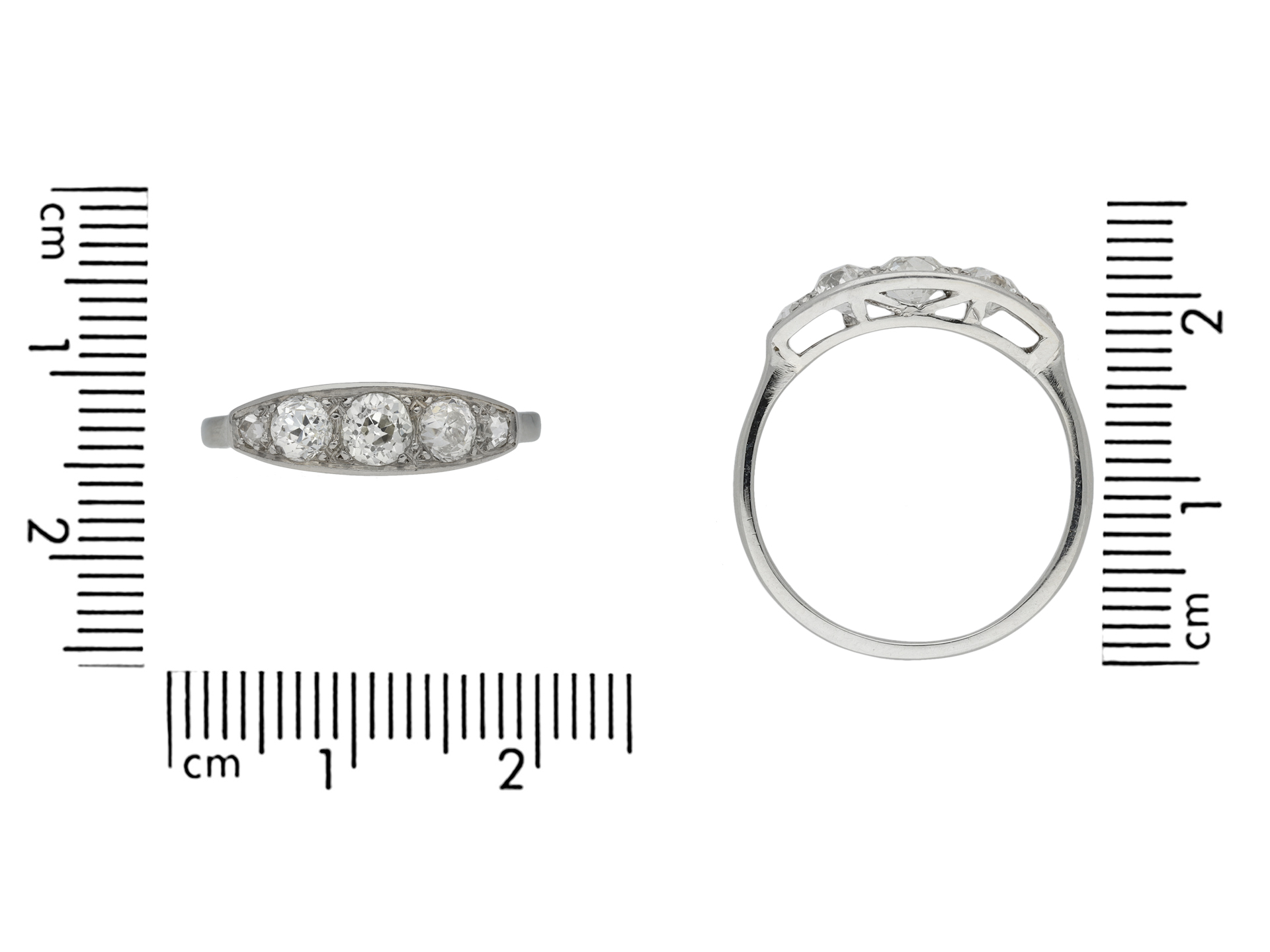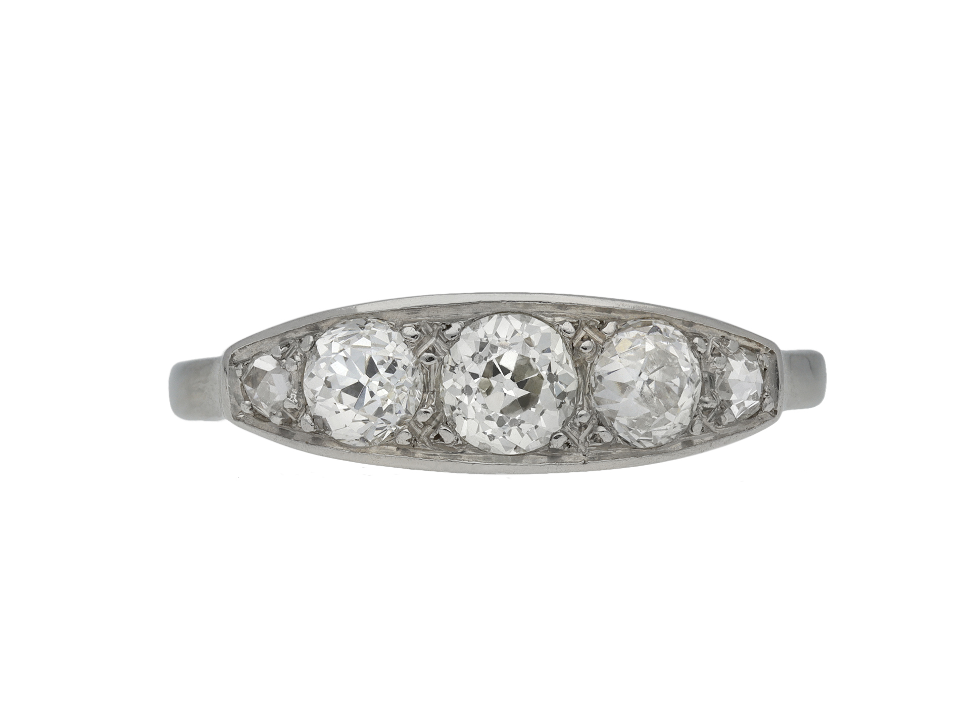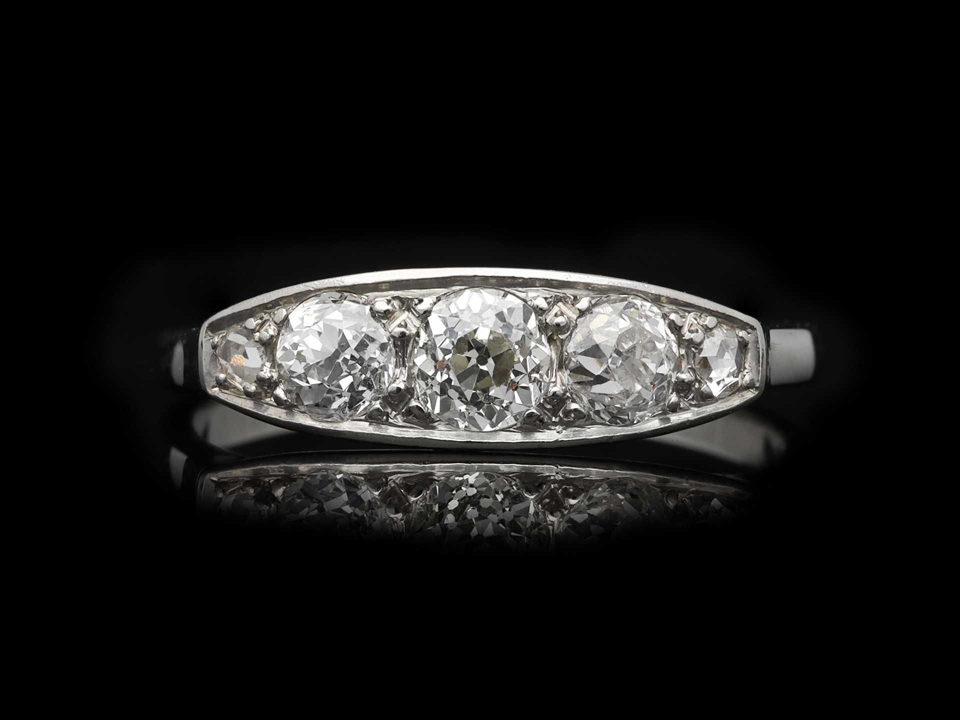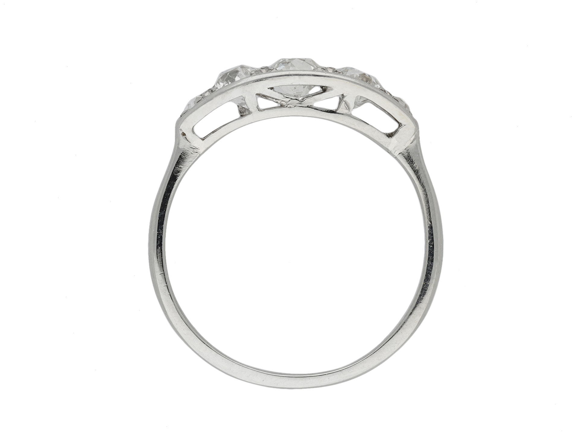 Antique diamond five stone ring. Horozontally set with three round old cut diamonds in open back grain settings with an approximate combined weight of 0.50 carats, flanked by two round rose cut diamonds in open back grain settings with a combined weight of 0.02 carats. The total approximate diamond weight is 0.52 carats, to an elegant graduating five stone design featuring polished borders, an intricately pierced openwork gallery and circular open backholing, leading to smooth shoulders and flowing through to a solid D-shape shank. Tested 18 carat white gold, circa 1920.