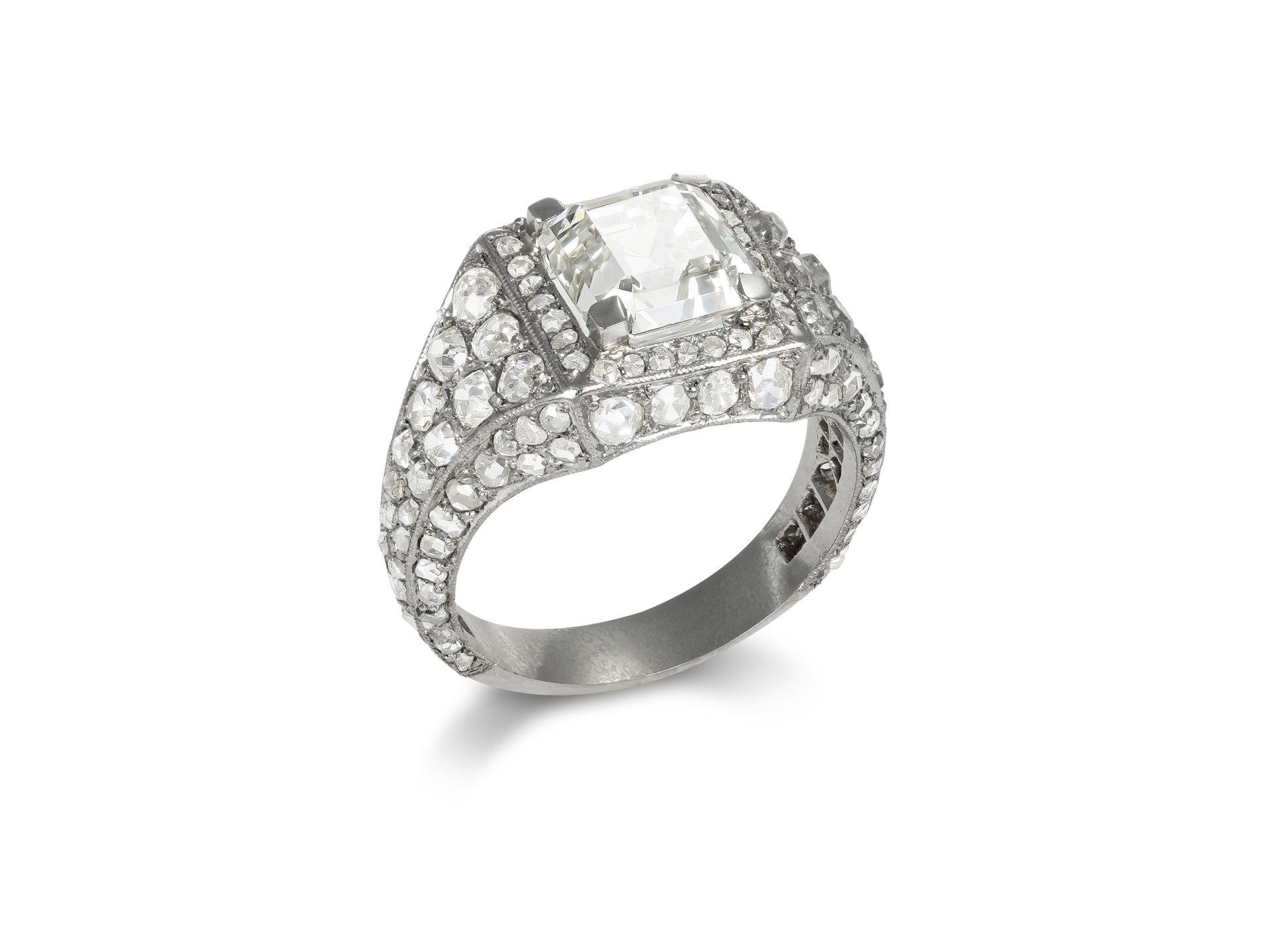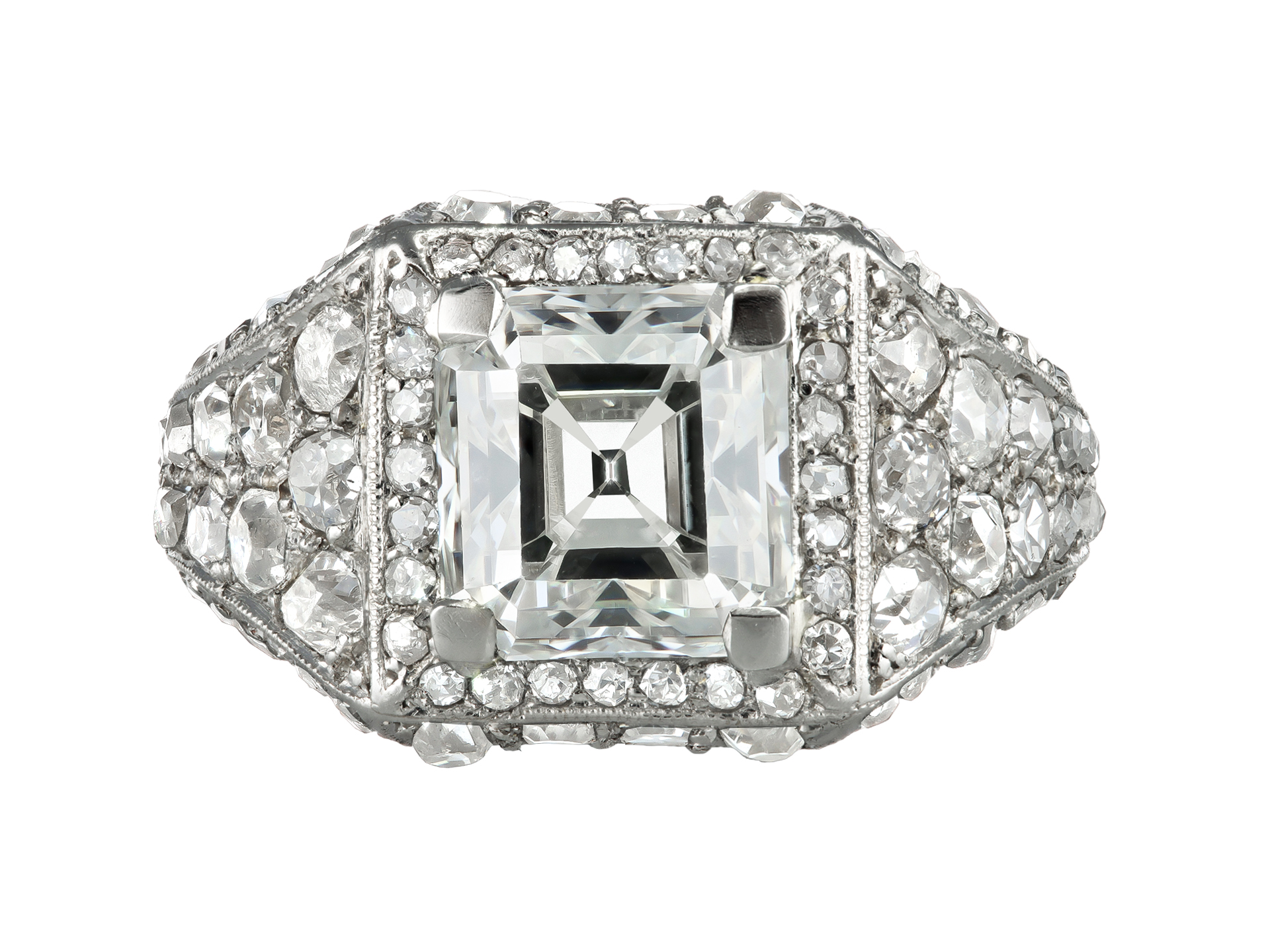 Art Deco diamond cluster ring. Set to centre with an octagonal Asscher cut diamond, J colour, VS1 clarity, with a weight of 2.65 carats in an open back claw setting, surrounded twenty-eight round eight cut diamonds in open back grain settings with a combined approximate weight of 0.28 carats, further adorned by one hundred and four mixed old cut diamonds in open back grain settings with a combined weight of 1.75 carats. The total approximate diamond weight is 4.68 carats, to an impressive cluster design design featuring millegrain borders throughout, a diamond-set gallery and intricate open backholing, the integrated shoulders flowing to a solid D-shape shank. Tested platinum, circa 1925, accompanied by Gemmological Institute of America report #2235907012.